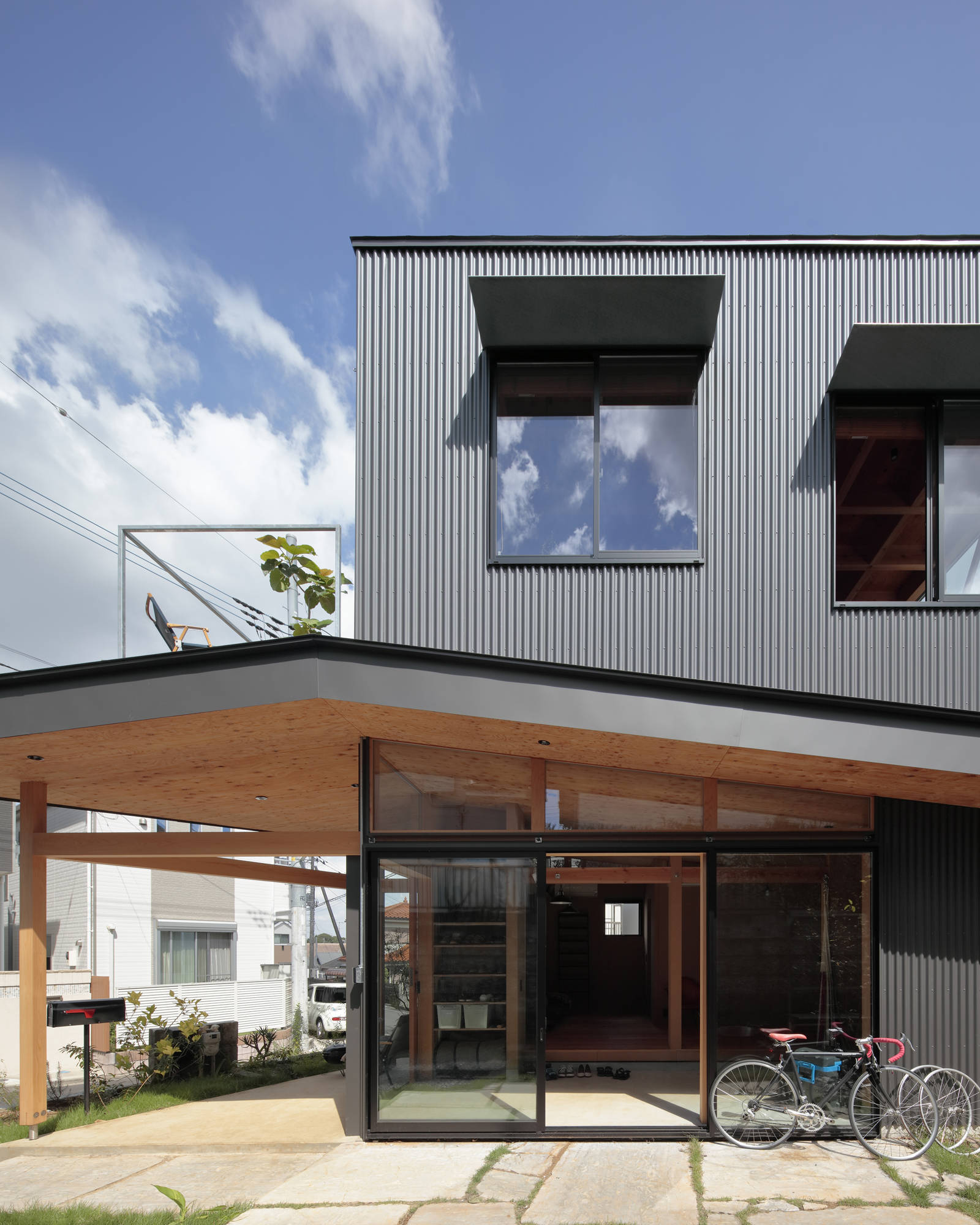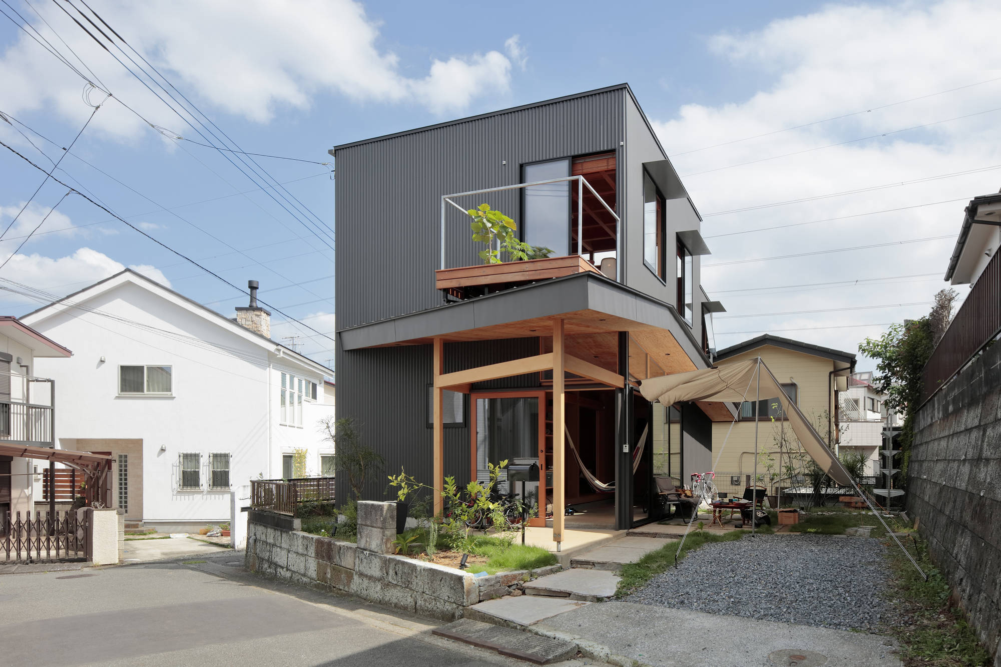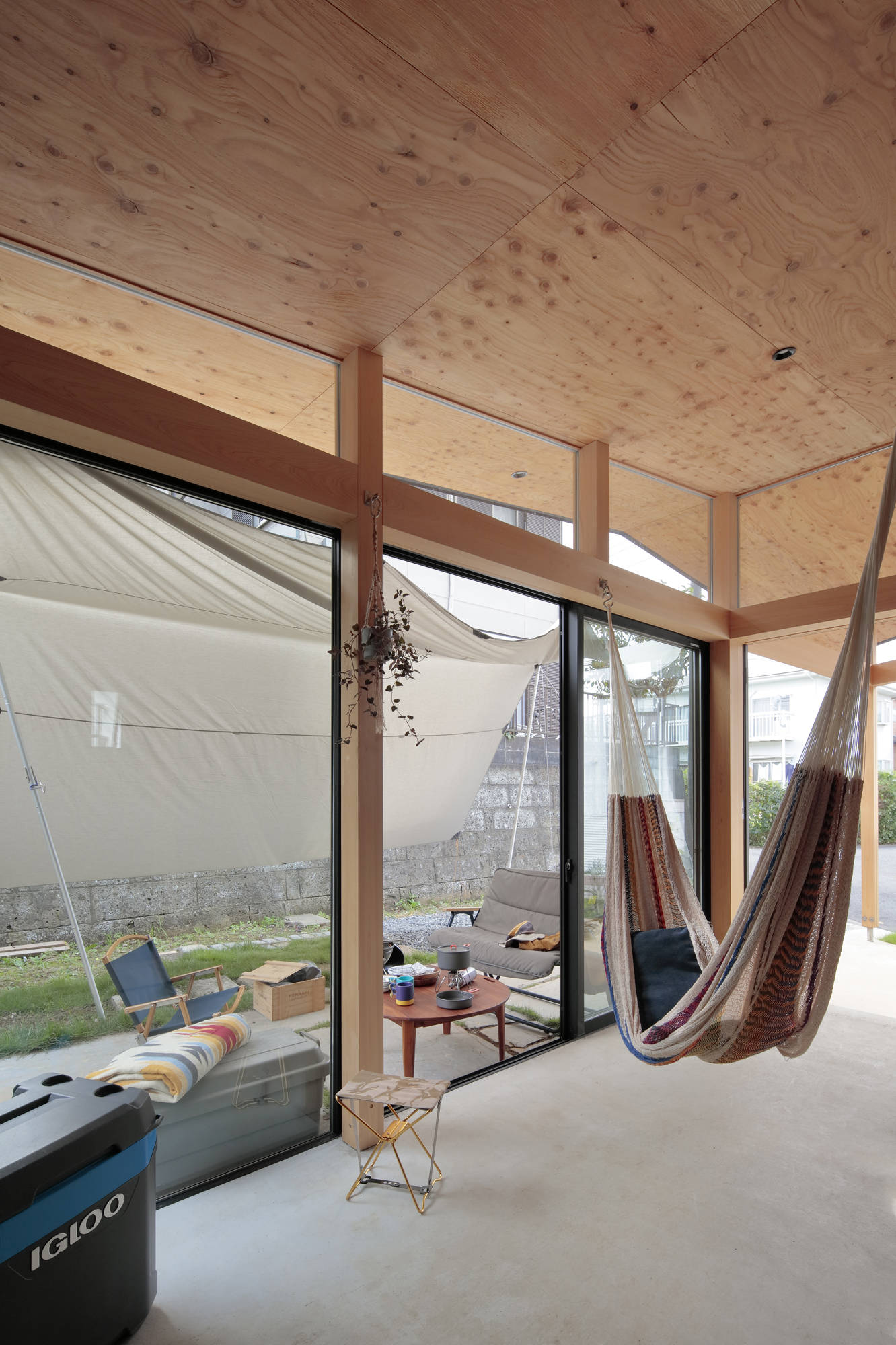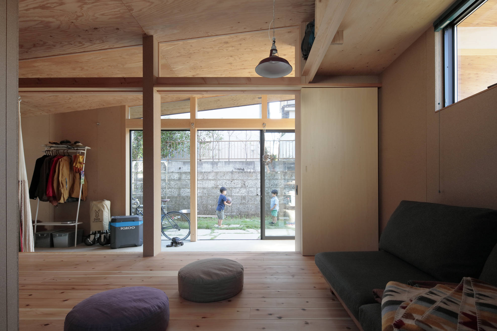 「夏のリビング」は二階の段丘の裏に沿って現れた切妻状の土間空間で、アウトドア好きな一家の様々なアクティビティを包むマルチスペースである。また、地域と家族とをつなぎ渡す軒下として、このコロナ禍においても風通しの良いリラックスした交流の場となるだろう。奥の個室も可動間仕切りの開け閉めによって、「夏のリビング」のつながりとして開放されたり、閉じたりと、その時々に必要なプライバシーに合わせて調整され、日陰の庭までも伸長する地域と共有する場所となる。