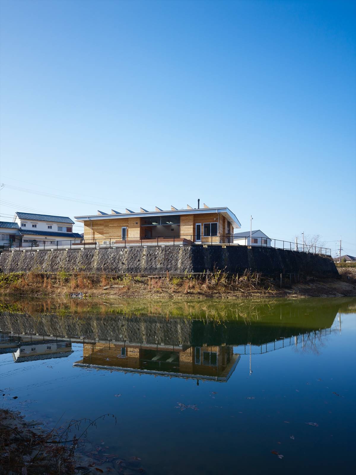 池のそばに敷地があり、その向こう側には林が広がっています。