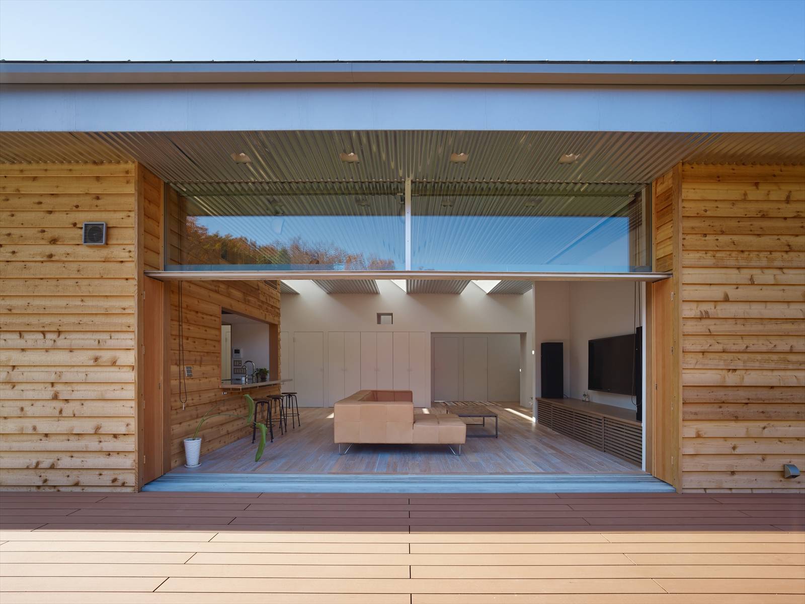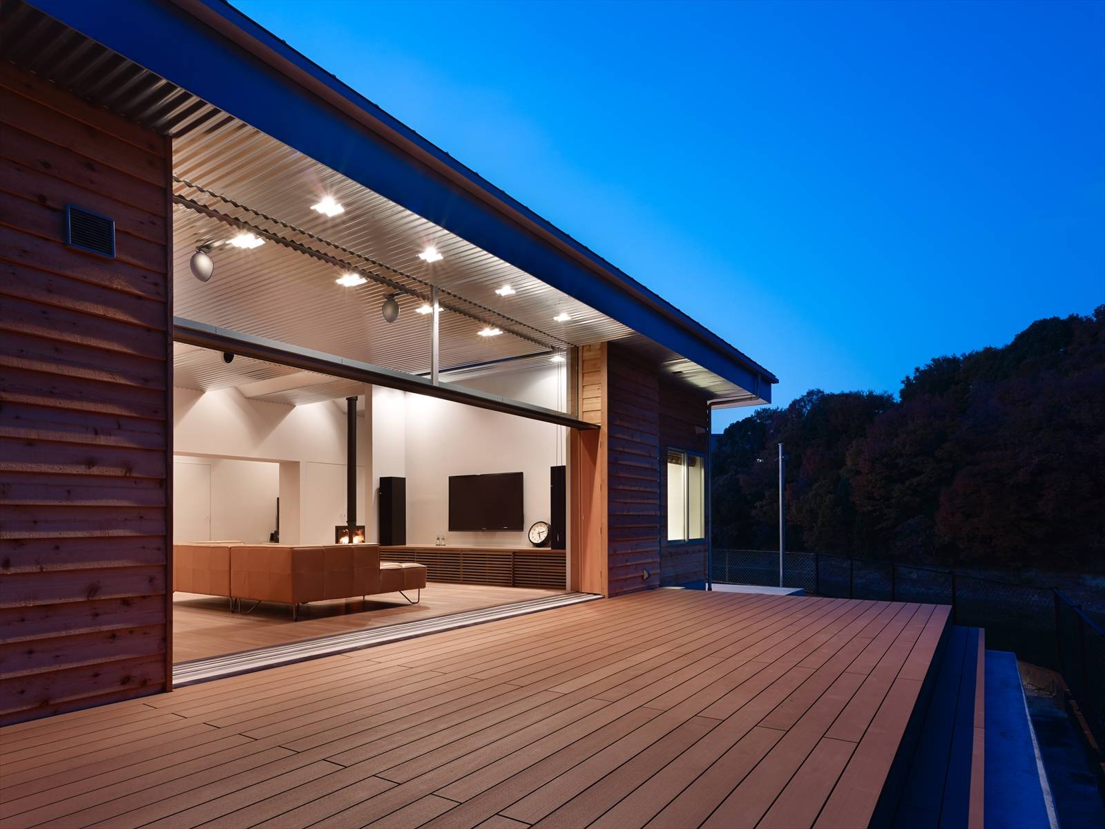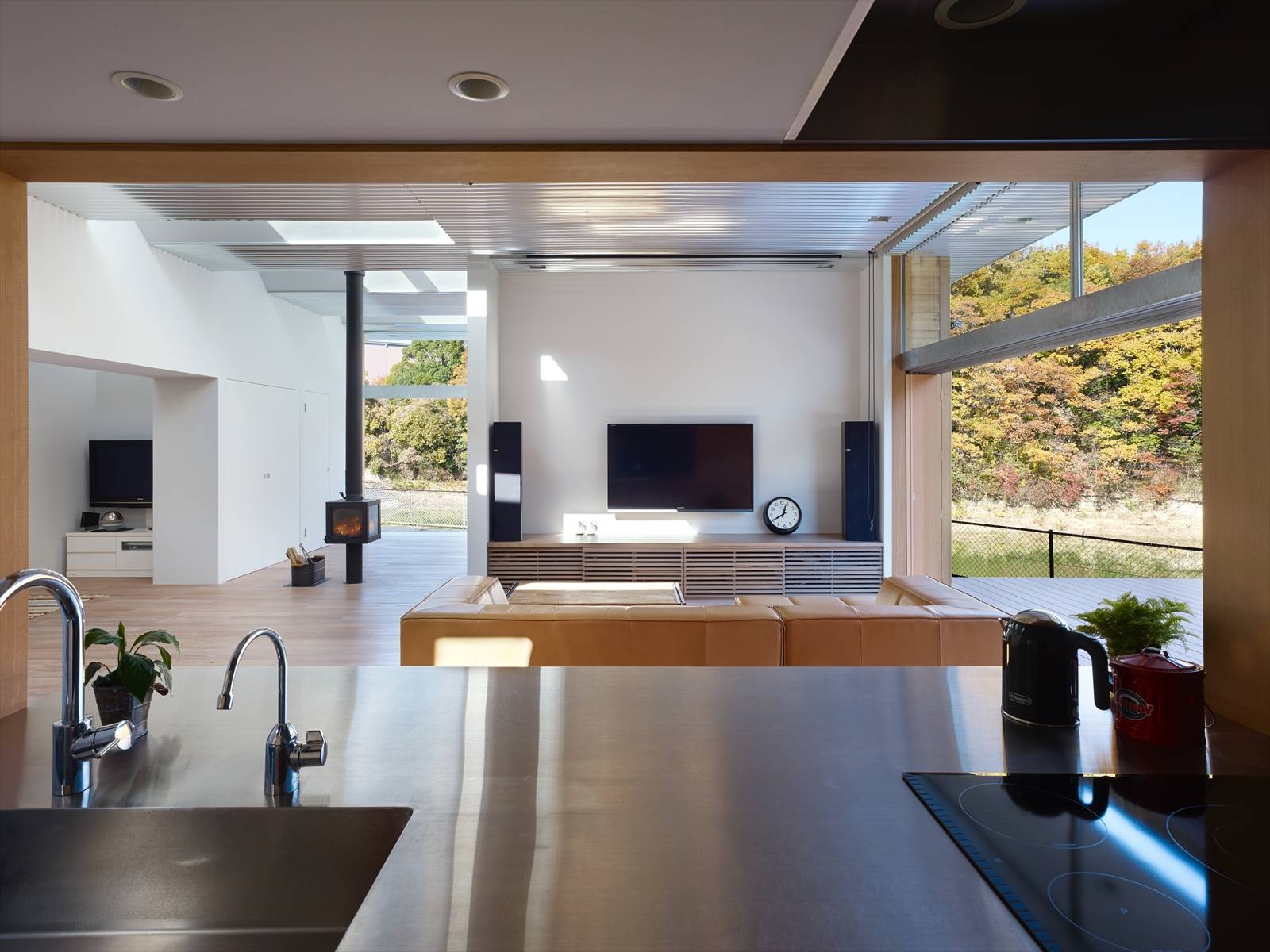 冬は撒きストーブの炎を楽しんだり、夏は、デッキスペースで友人たち家族があつまって、バーベキューをしたり、夜はリビングがシアタールームに変化します。