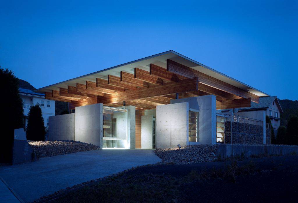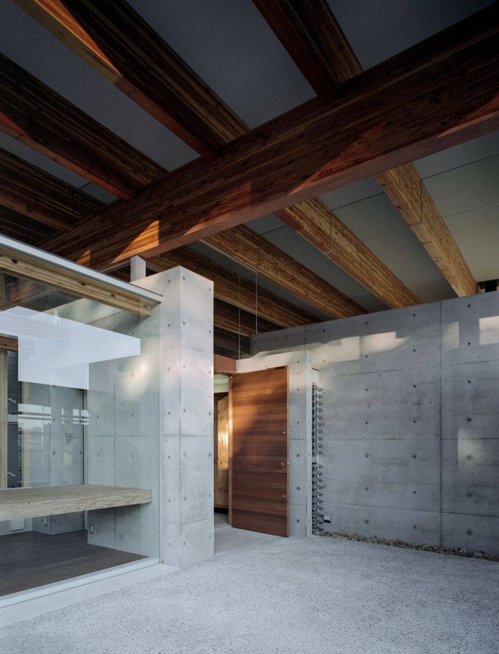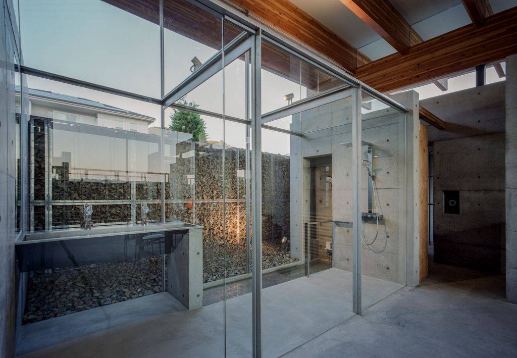 そこで、この住宅では、大屋根、大壁でざっくりと空間を分節し、その空間をガラス屋根や木造屋根、ガラス壁、木造壁、建具、ガビヨンなどのエンクロージャーで光や音、空気、動線、視線の透過と遮断をコントロールすることで居住する領域として成立させています。