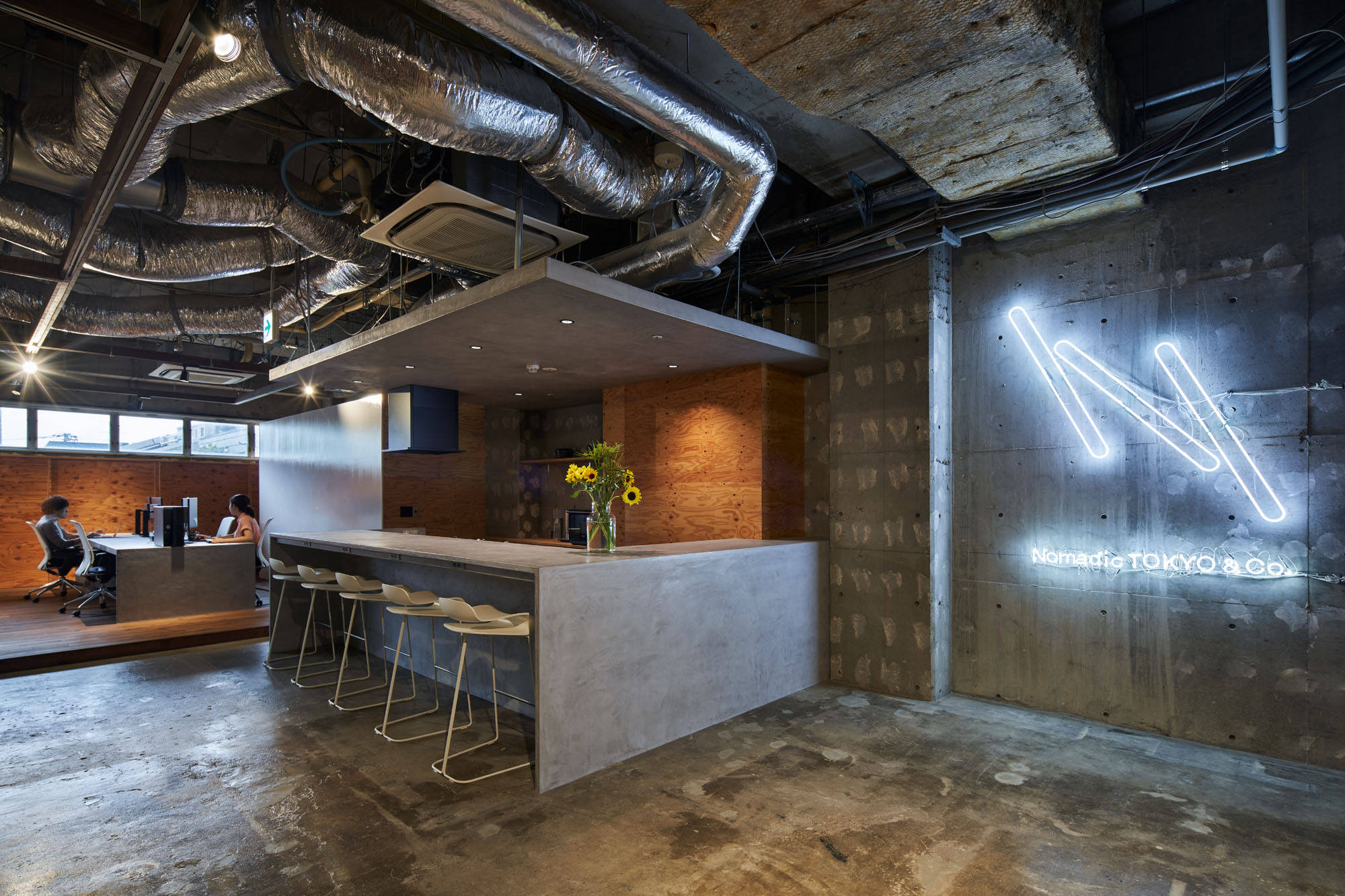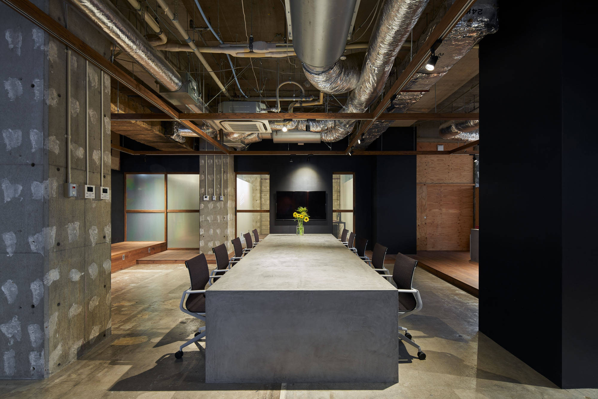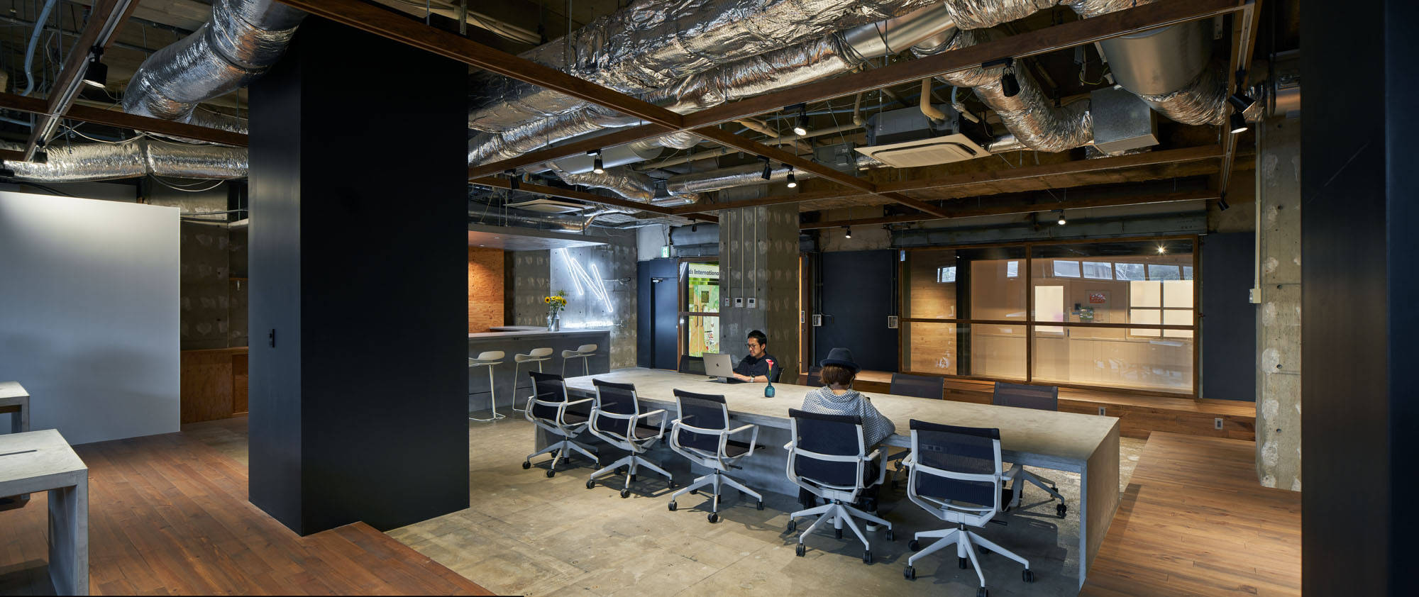 都市に建つ複合用途ビルの2階の1区画を改修し、映像製作会社のオフィスにコンバージョンするプロジェクトです。大きなテーブルを設けており、メインの事務所に加えてレンタルオフィススペースとしての機能を有します。大きなテーブルにつながるキッチンは、オフィスで働く人々の交流の場としても、映像撮影のための料理つくりの場としても機能します。
