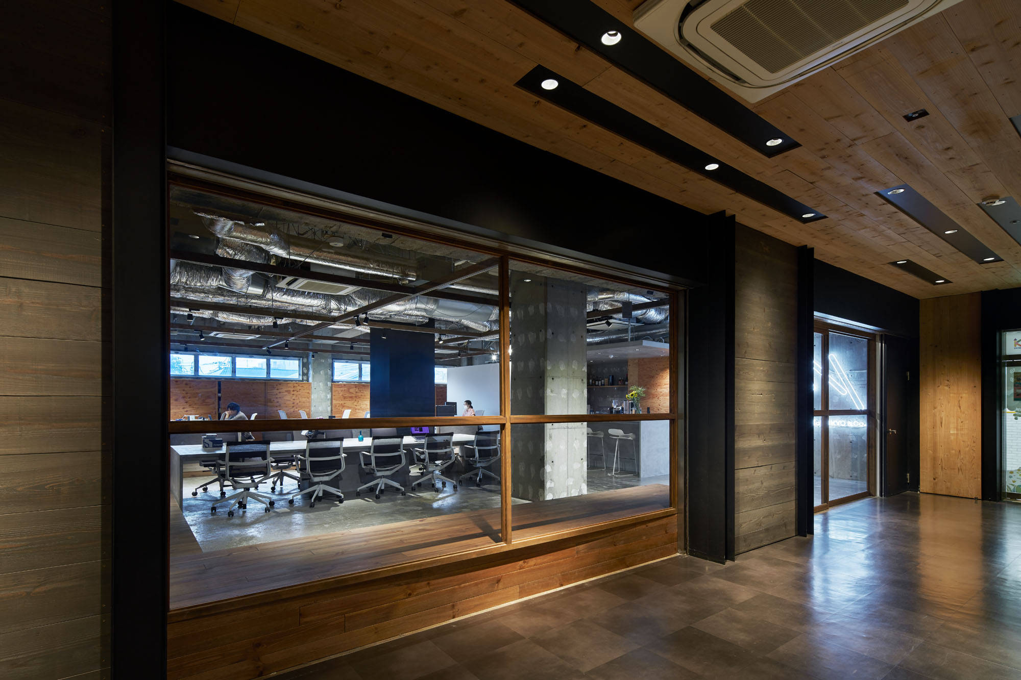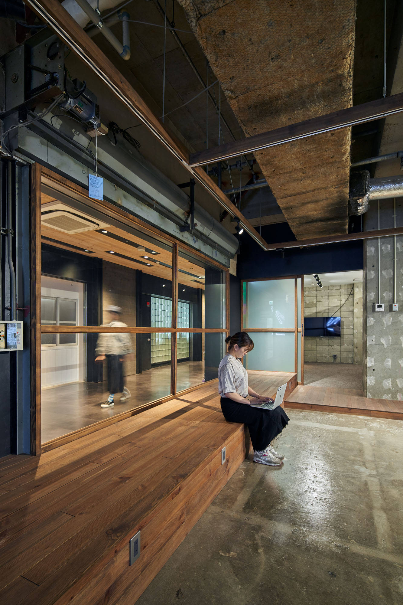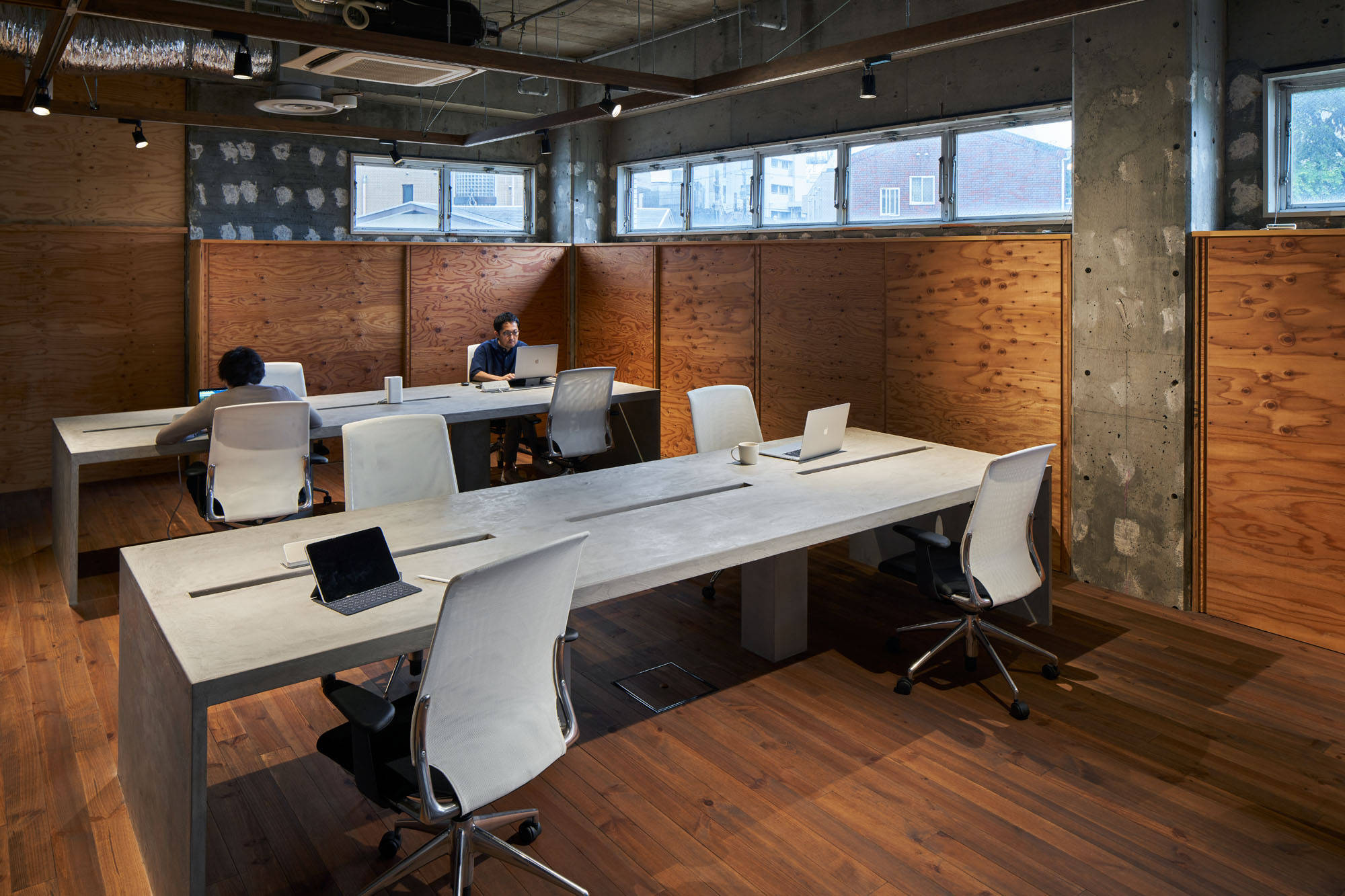都市に建つ複合用途ビルの2階の1区画を改修し、映像製作会社のオフィスにコンバージョンするプロジェクトです。大きなテーブルを設けており、メインの事務所に加えてレンタルオフィススペースとしての機能を有します。大きなテーブルにつながるキッチンは、オフィスで働く人々の交流の場としても、映像撮影のための料理つくりの場としても機能します。