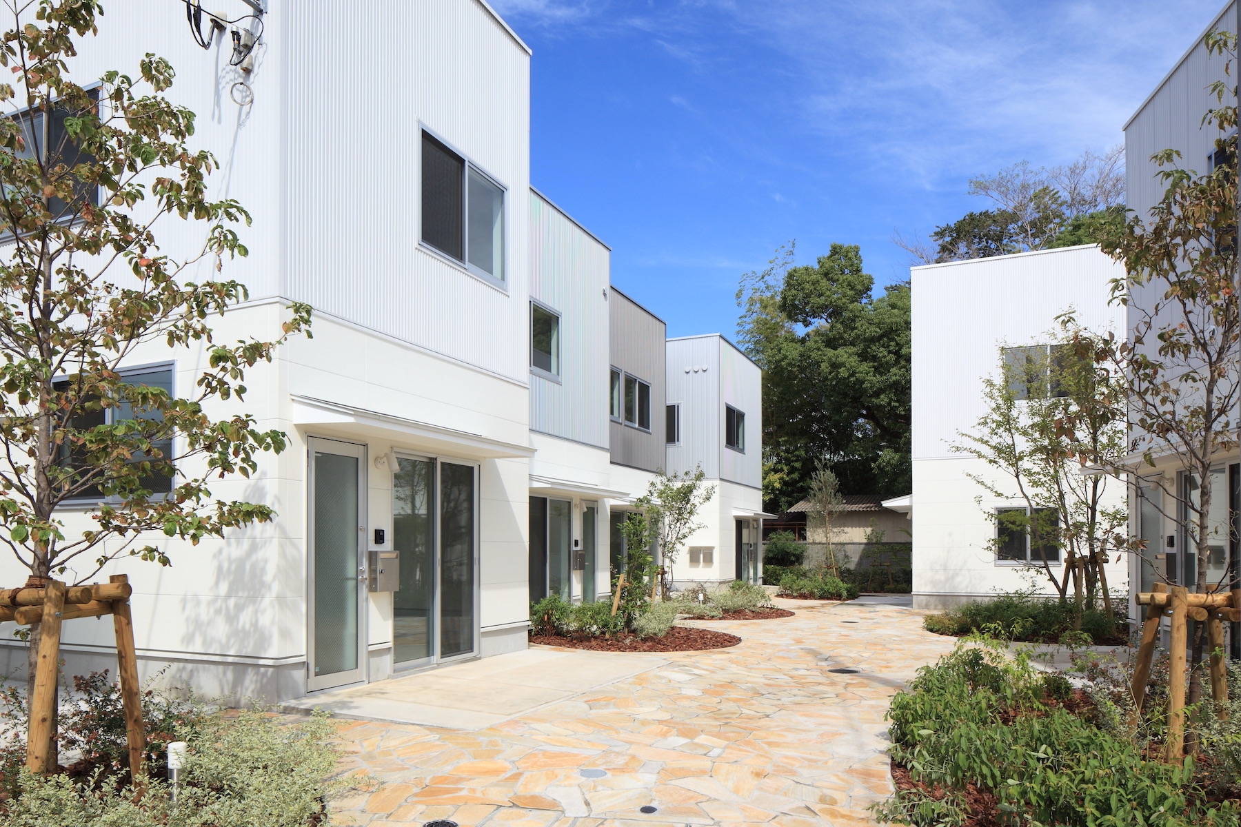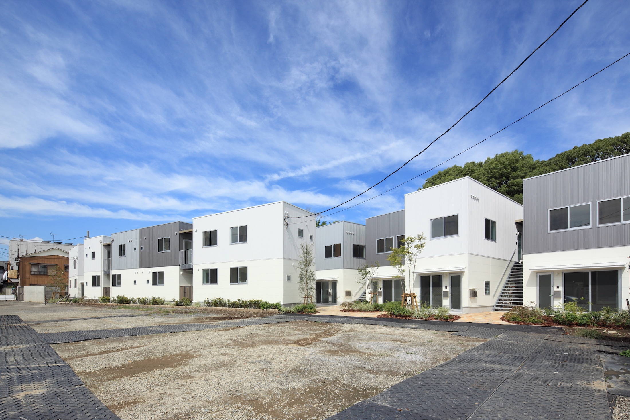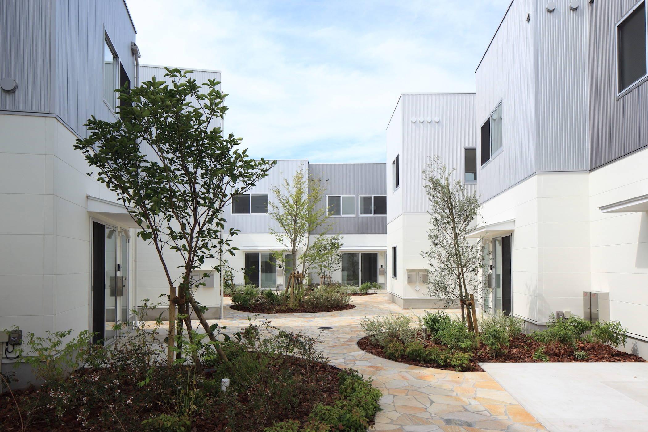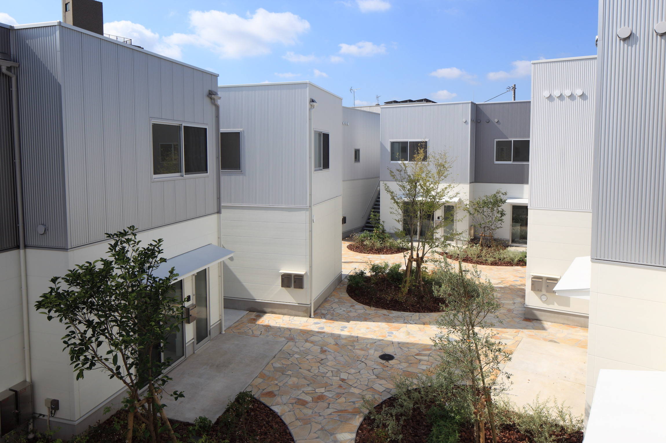 敷地を4つに分け、木造2階建てのアパート4棟が住民共用の中庭をつくるように配置しました。