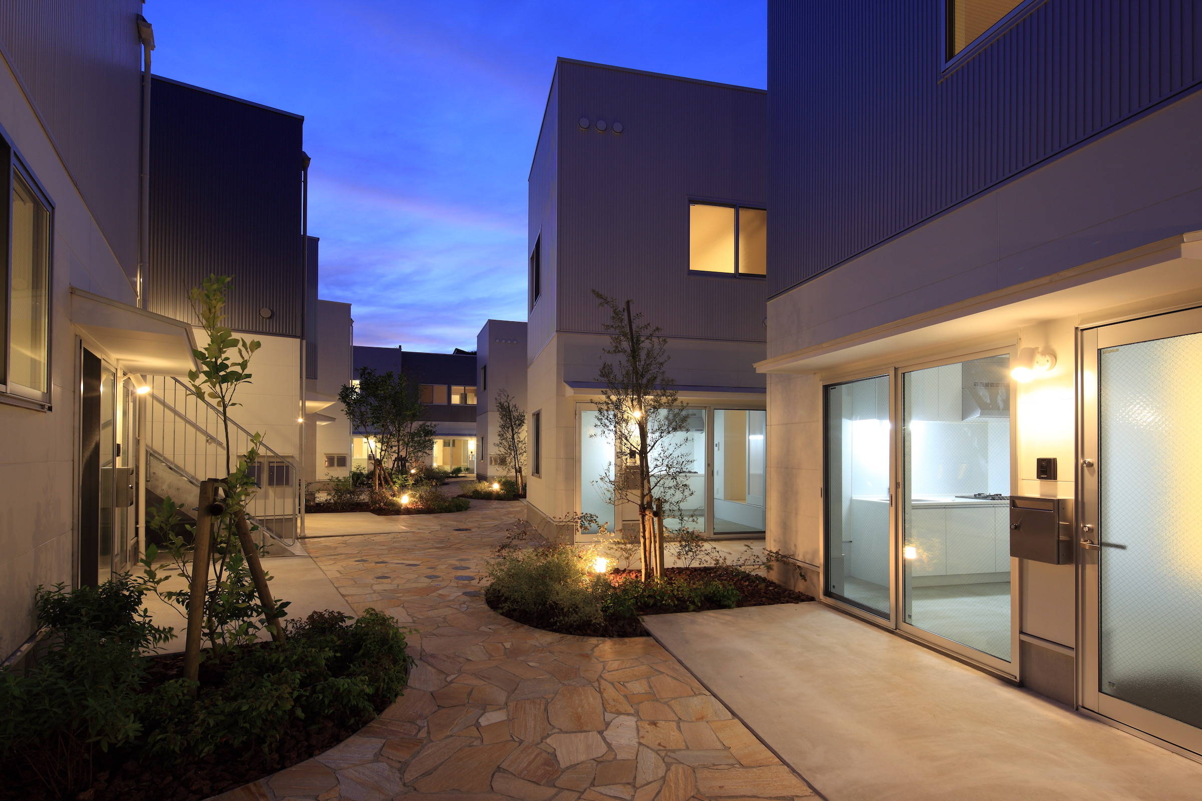 それぞれの住戸は、ダイニングを土間に設け中庭に開けるようにしています。