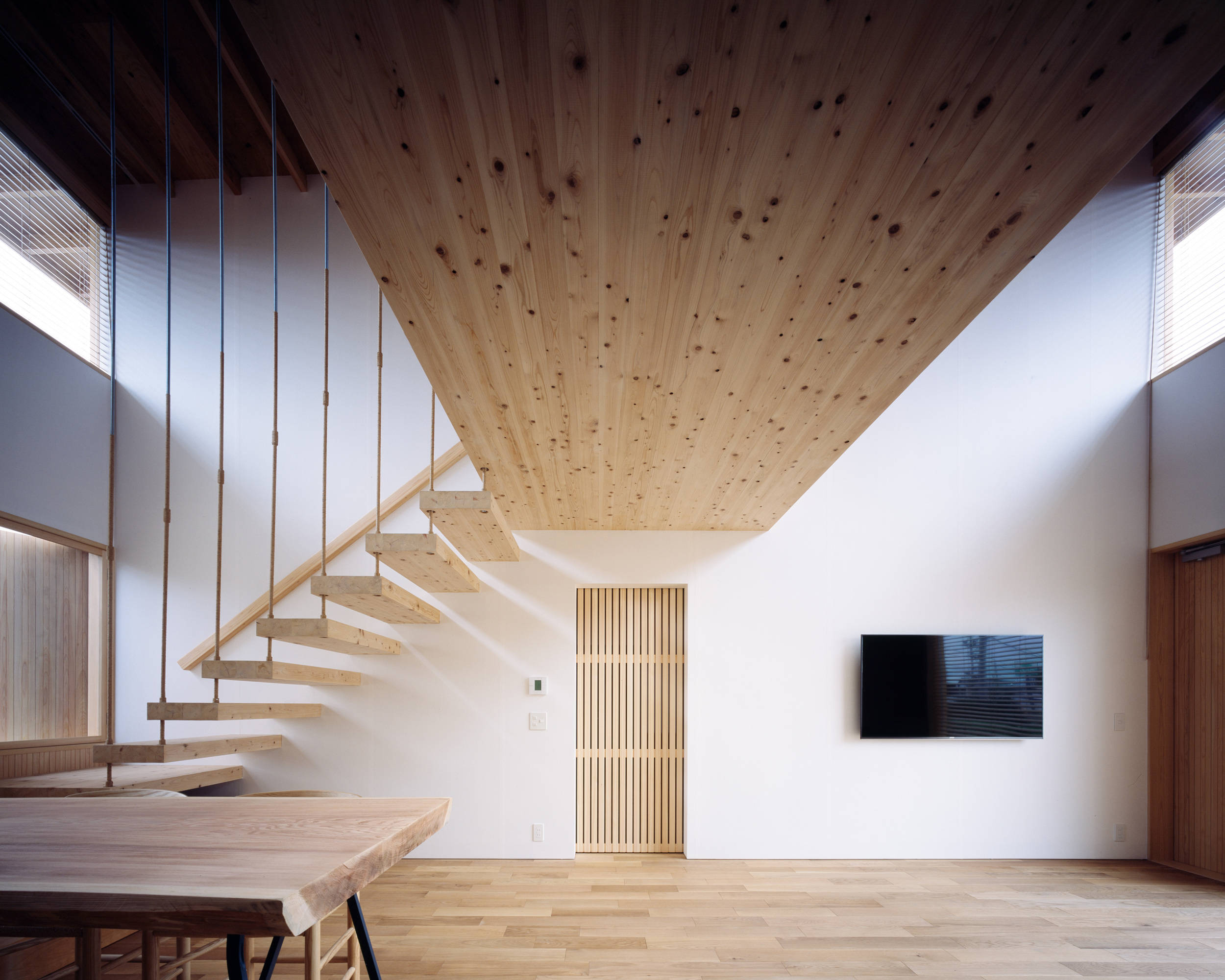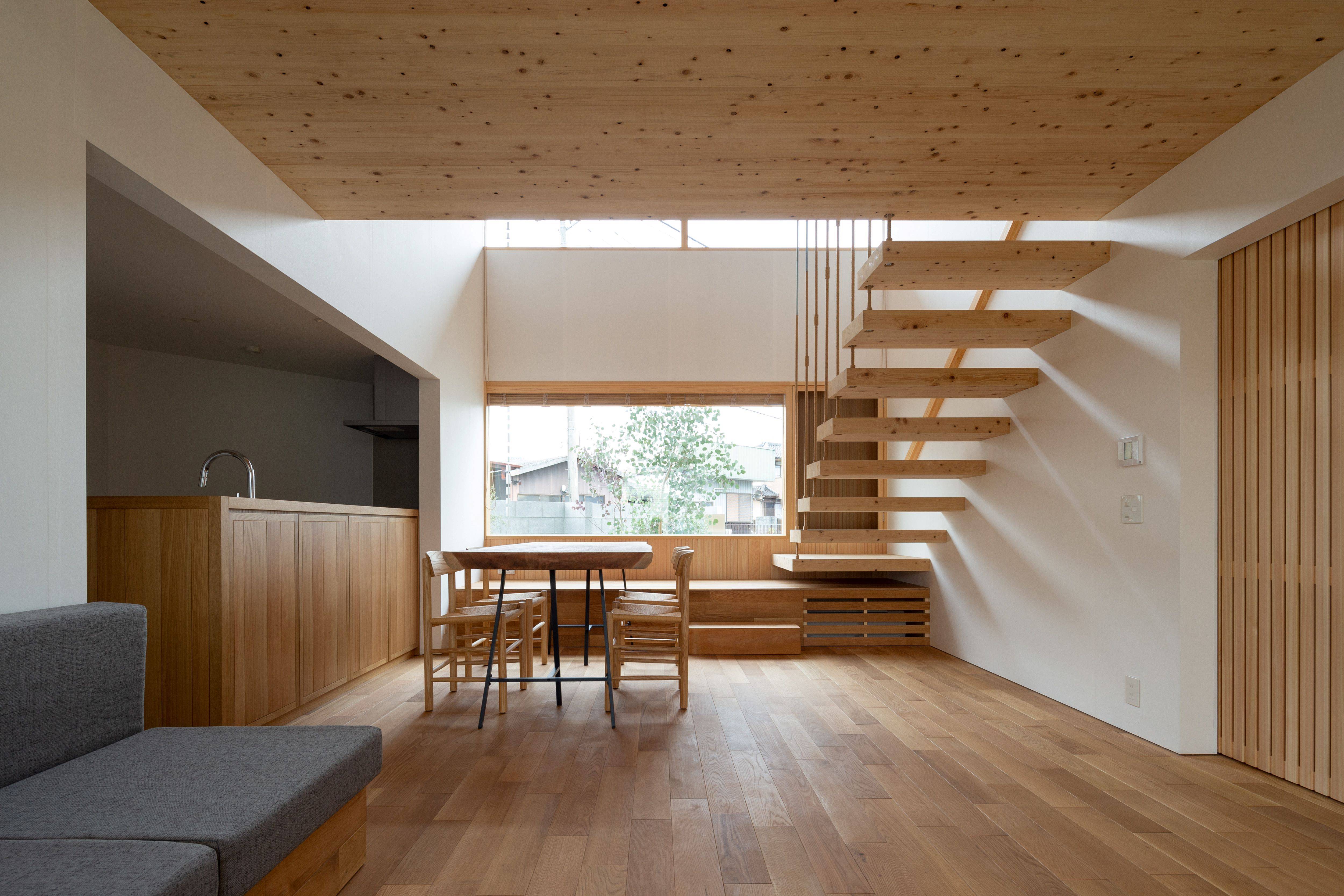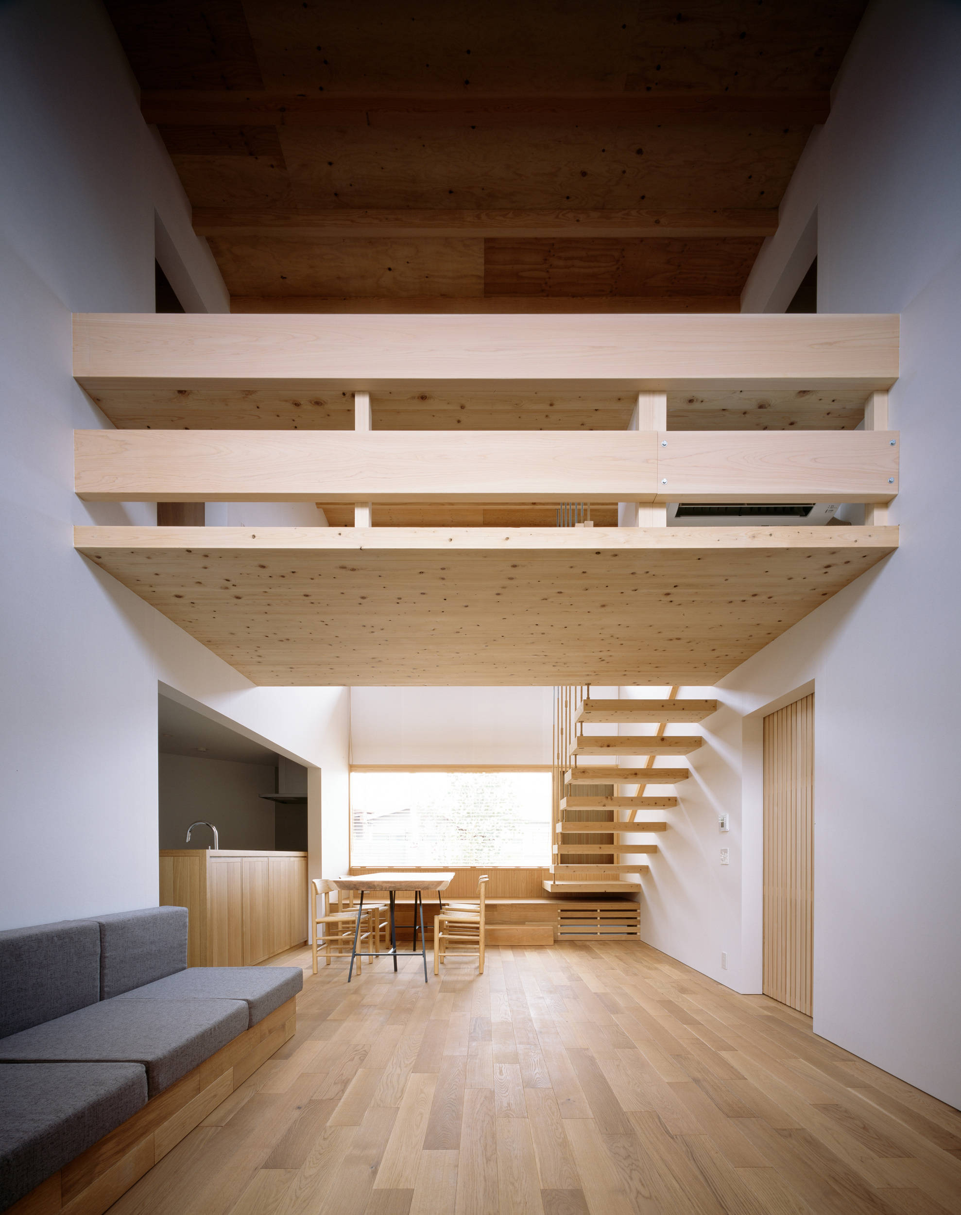 岐阜県可児市にある夫婦と子供2人の為の一戸建て住宅の計画である。「朝起きて思わず背伸びをしたくなるような明るく気持ちのいい場所を作って欲しい」と要望があった。日本有数の猛暑の地域であるこの場所で、いかにして心地よい光空間を実現するかが計画の主眼となった。 ここでは開口部を南北面に絞りリビングダイニングそれぞれに吹き抜けを設けた構成とすることで、北からの朝日が夏の訪れを、南からの光が冬の訪れを知らせてくれる光環境となるように設計している。