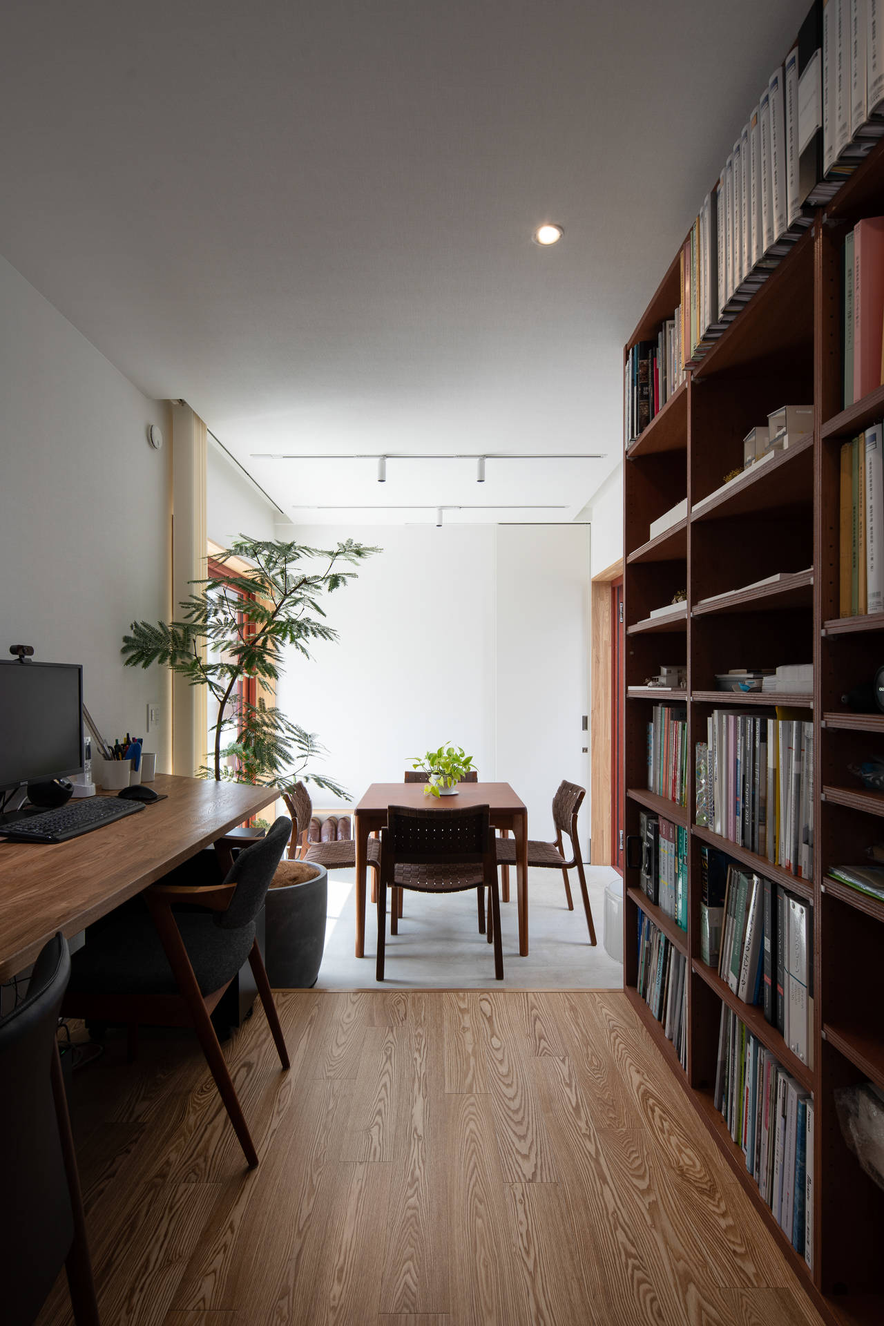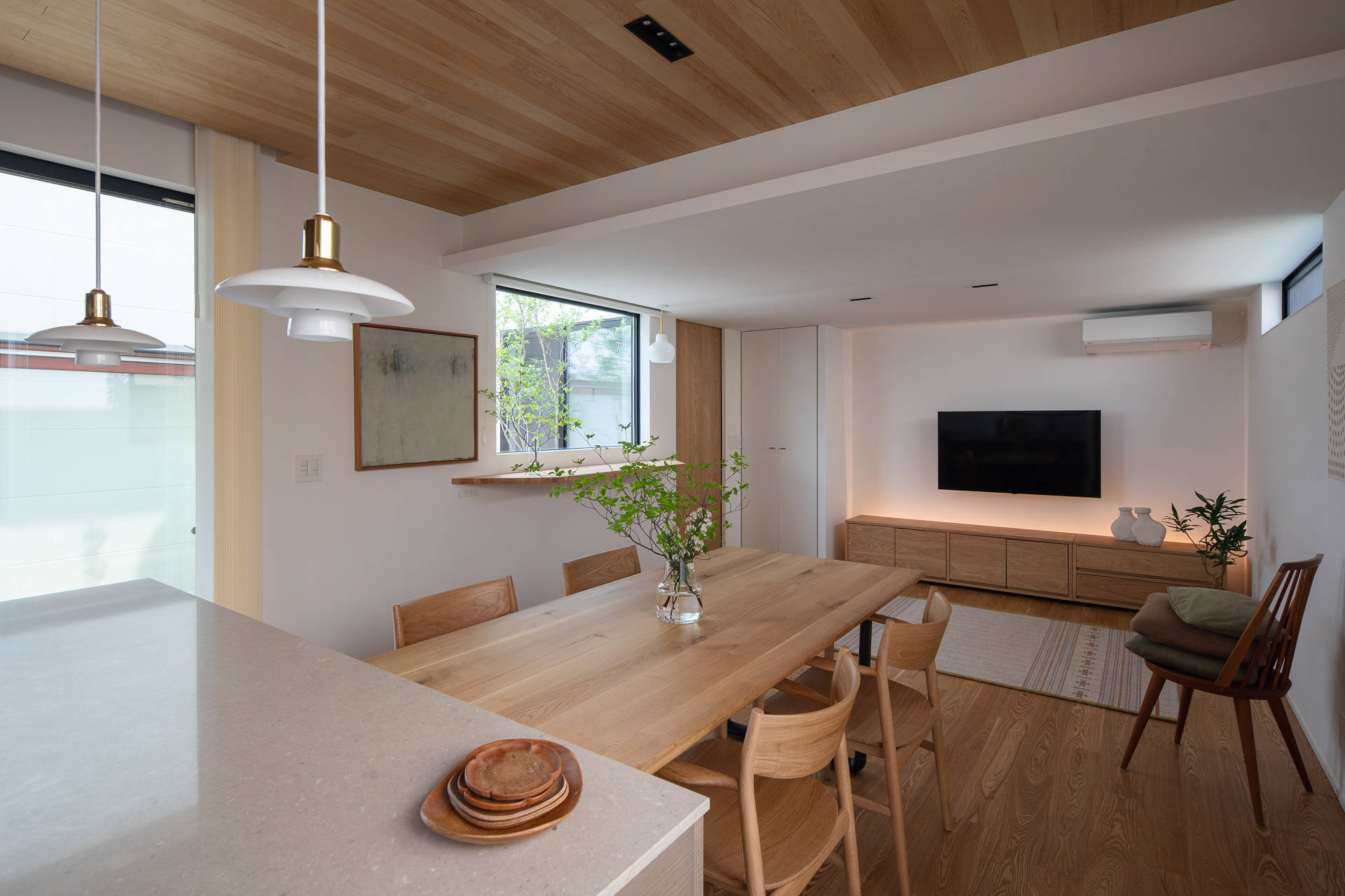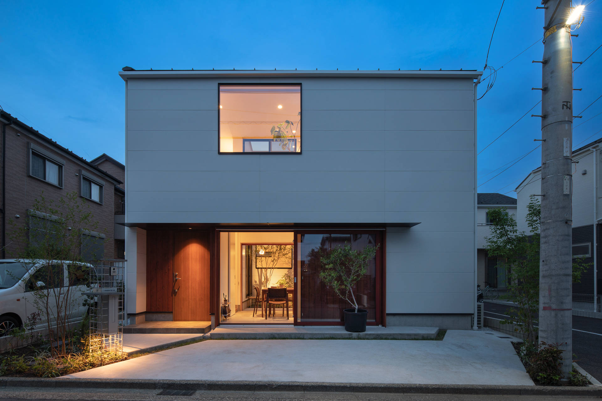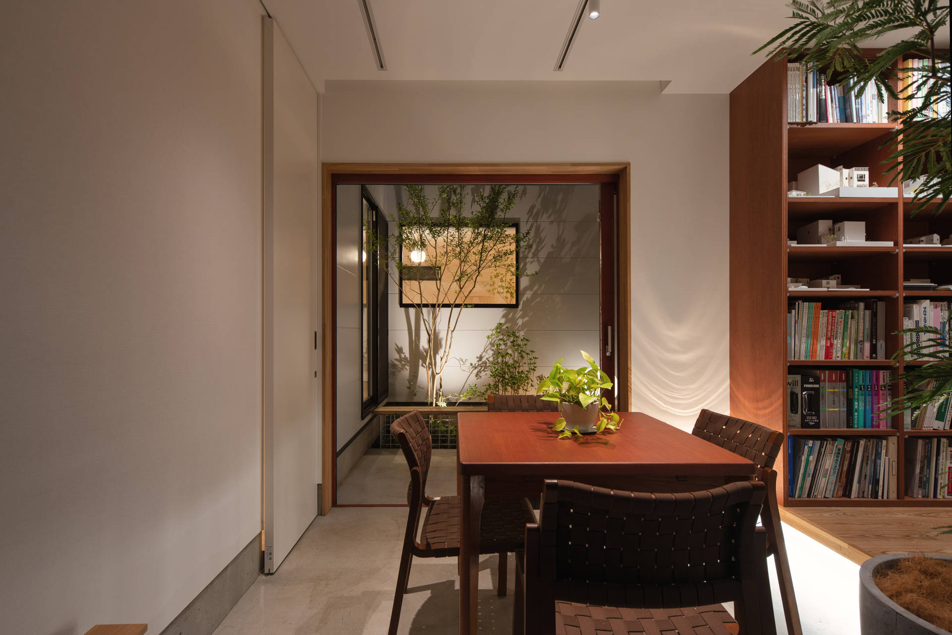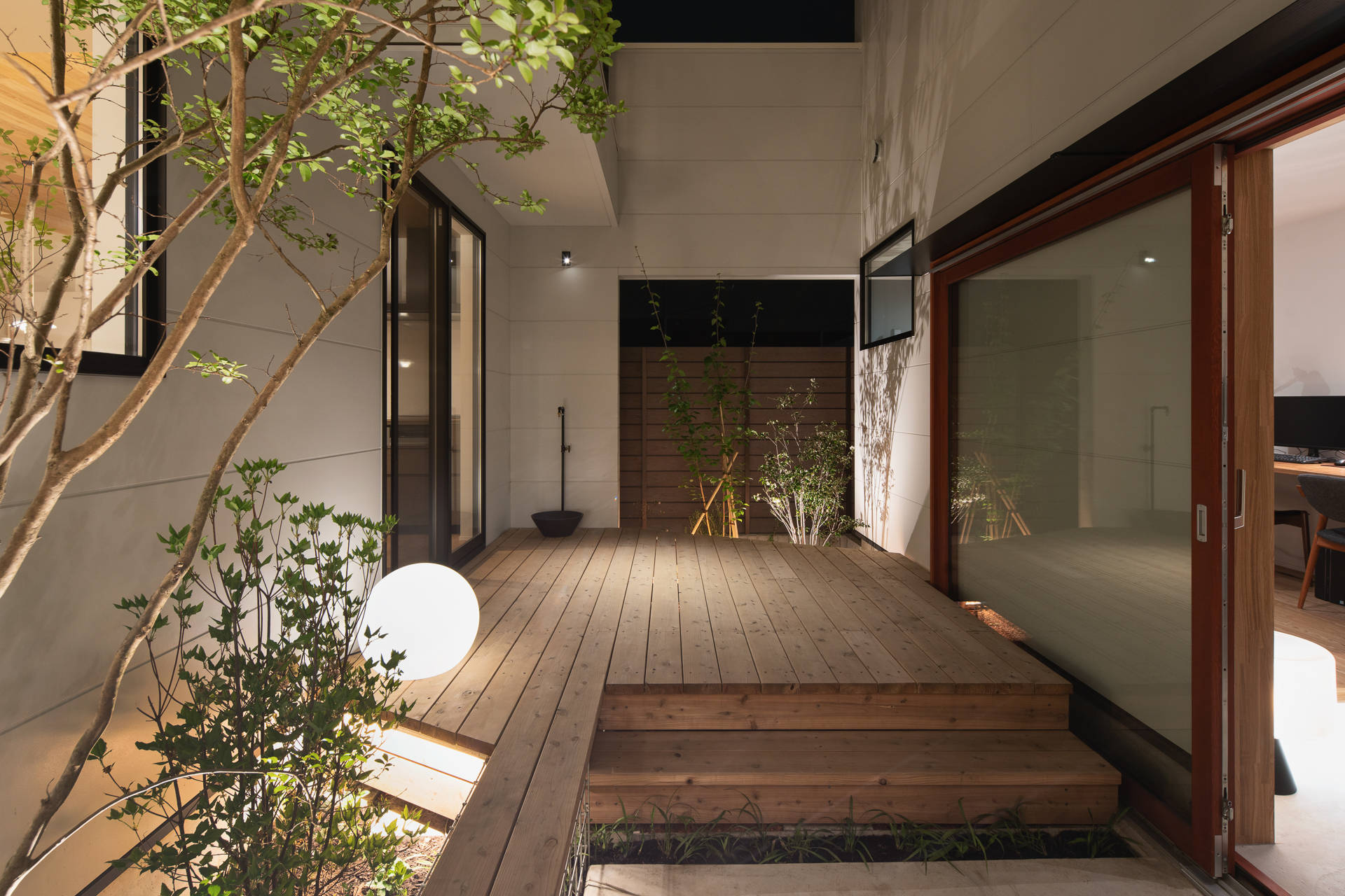 間取りの中に余白(土間、中庭、予備室)をつくりライフサイクルの更新に柔軟に対応できる様にし、床の素材を屋内外で揃えることで相互の空間に拡がりを与えました。また、内外をつなげる微地形の様な床レベルの設定によって居心地の良い空間が連続するようにしています。建築家、ランドスケープデザイナー、照明デザイナーの3者が関わることで家族と町や社会が健やかに繋がる家を計画しました。