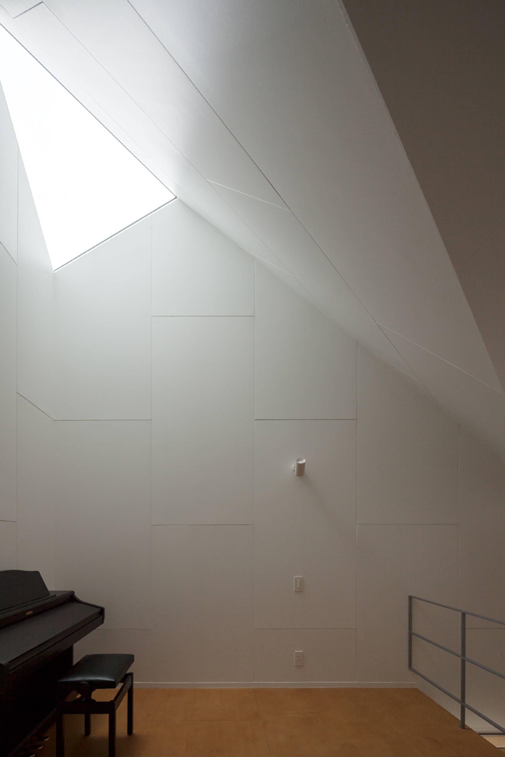 環境性能の最適化を課題とした住宅である。郊外住宅地にある長方形の敷地は南北軸から45度傾いており、道路に面した駐車場を取ると、建物は南東側に寄る。隣家が迫る中では、南側に大開口を取れないため、長方形の1階の上に45度振れた2階の屋根を載せ、敷地南角に向けて大きな高窓を取ることにした。