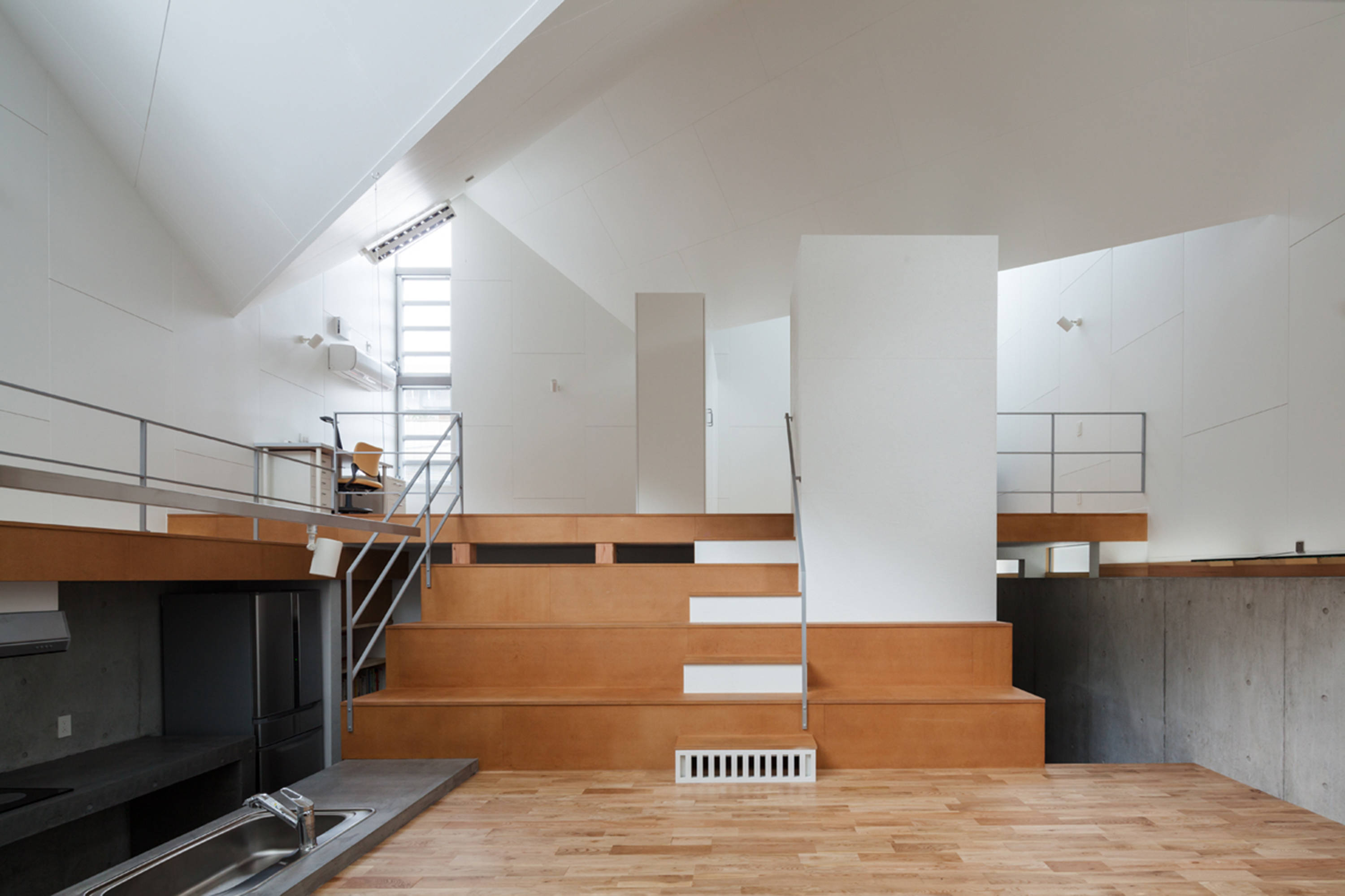 限られた面積の中で開放的な室内を実現するために、1階水回り以外は全て一室空間とした。居室の床面は1階から一段高く、2階の寝室空間と大階段で一体的につながる。