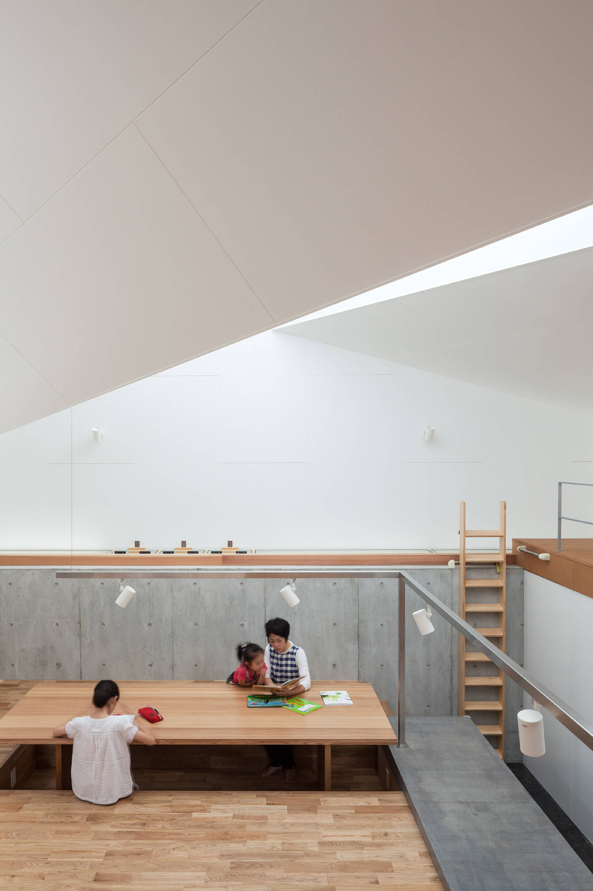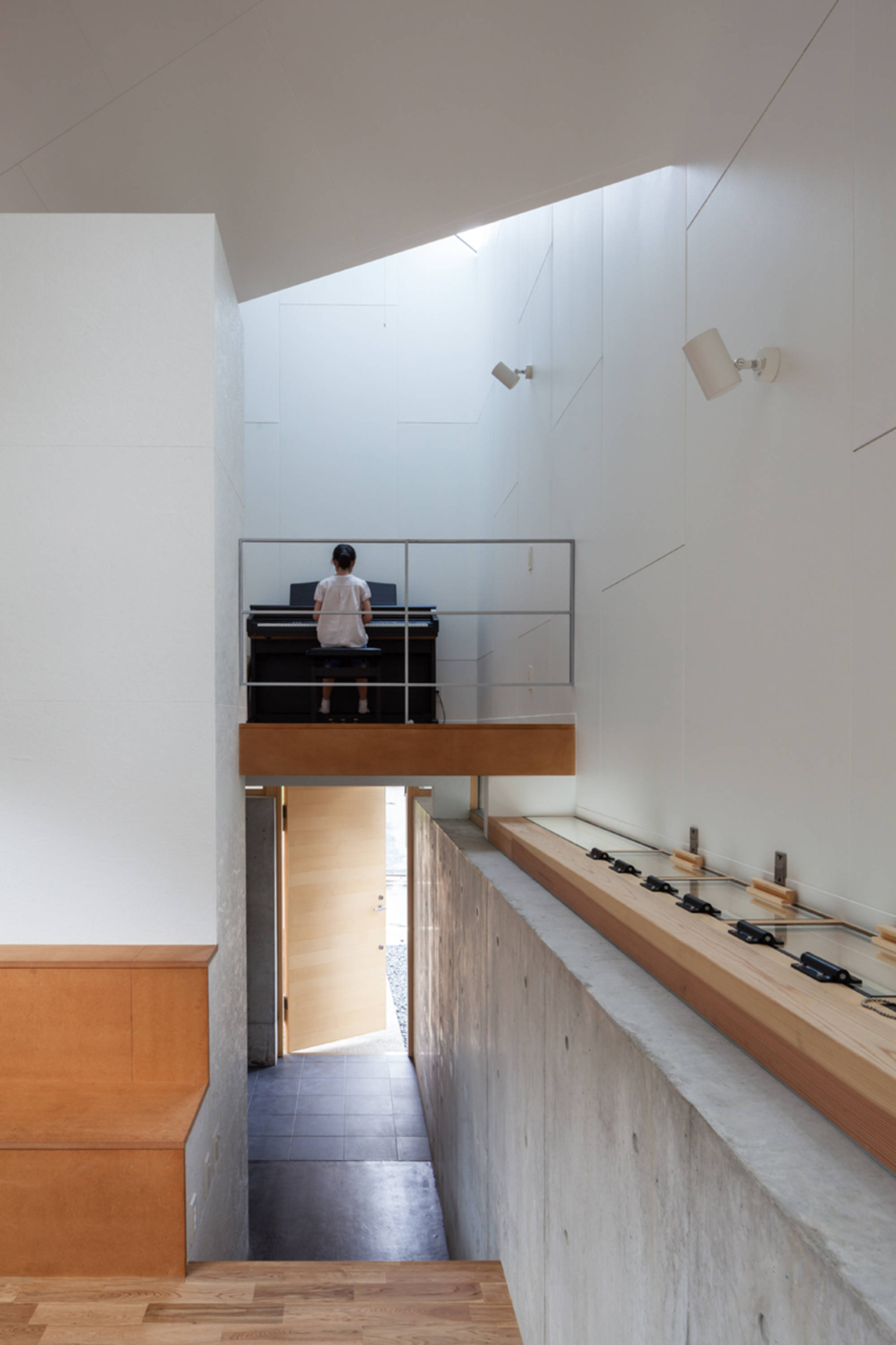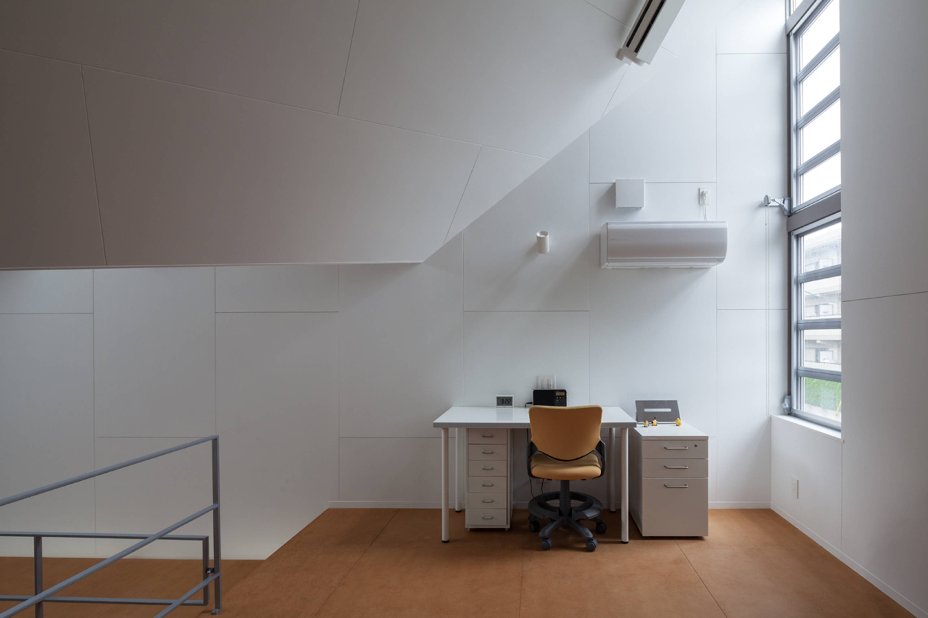 最小の窓面積で豊かな自然採光を得るために、主な窓は高窓とし、南面の大きな窓には庇を設けて、夏期の直射をカットした。2階と1階の間のスリットも採光・換気に利用している。