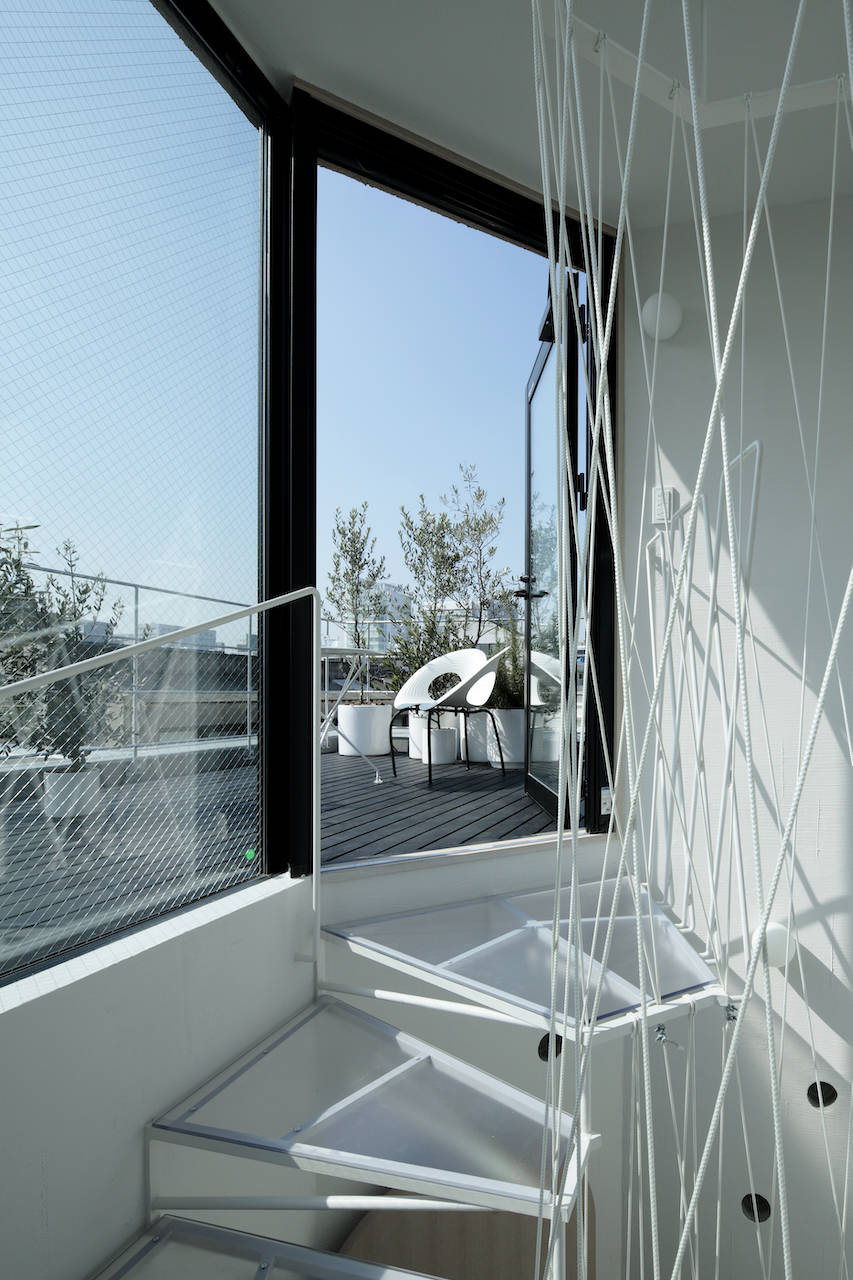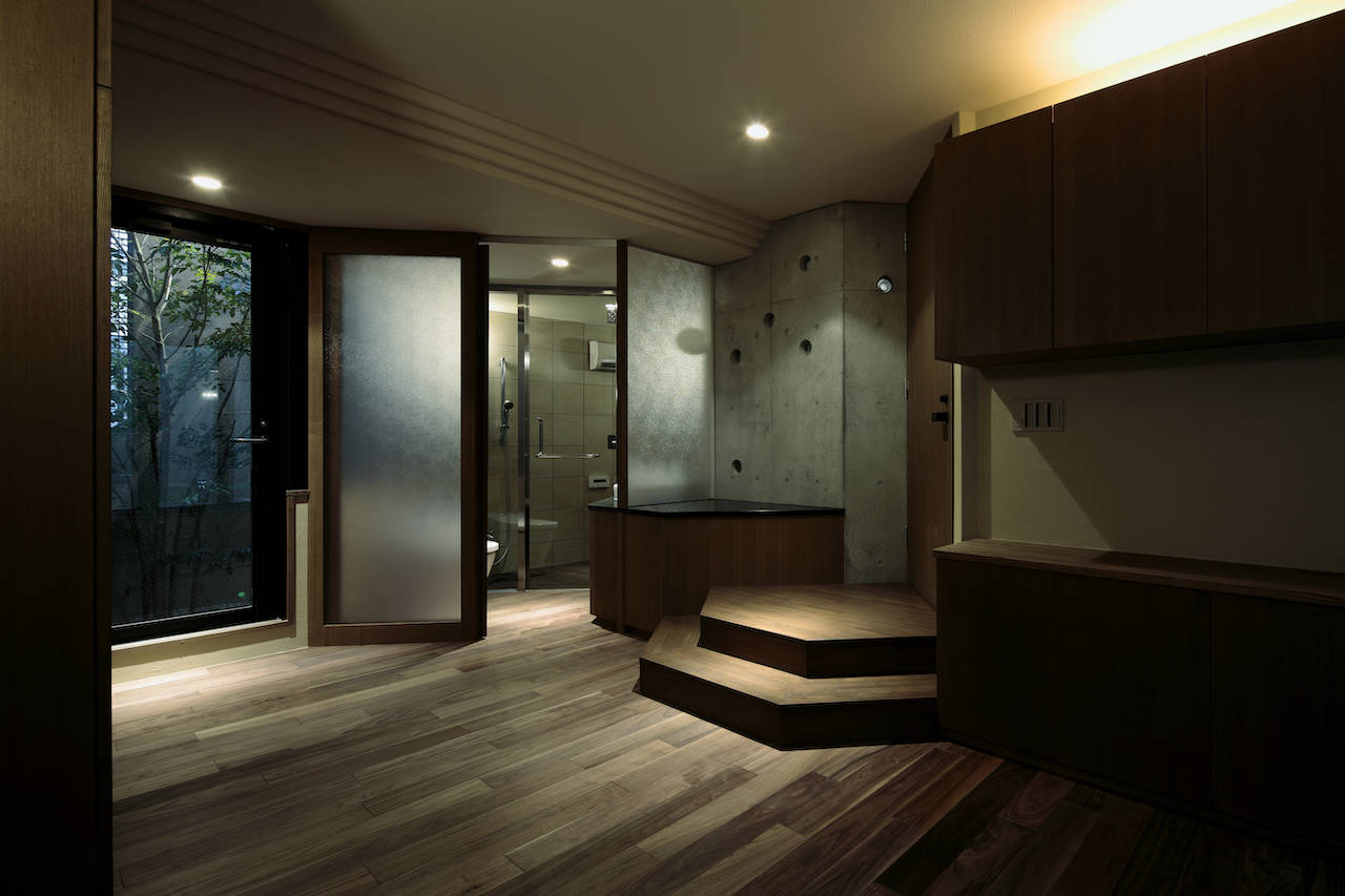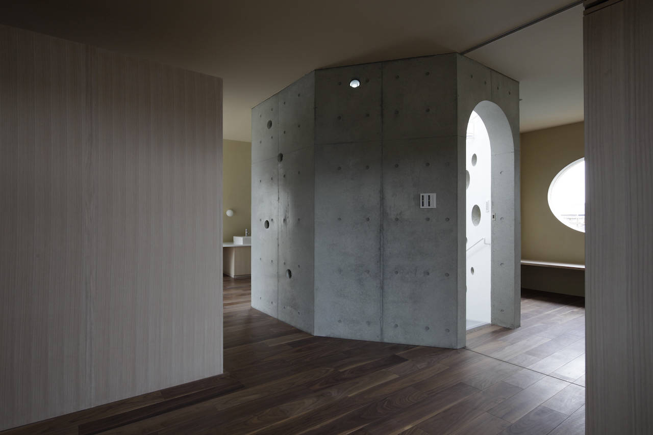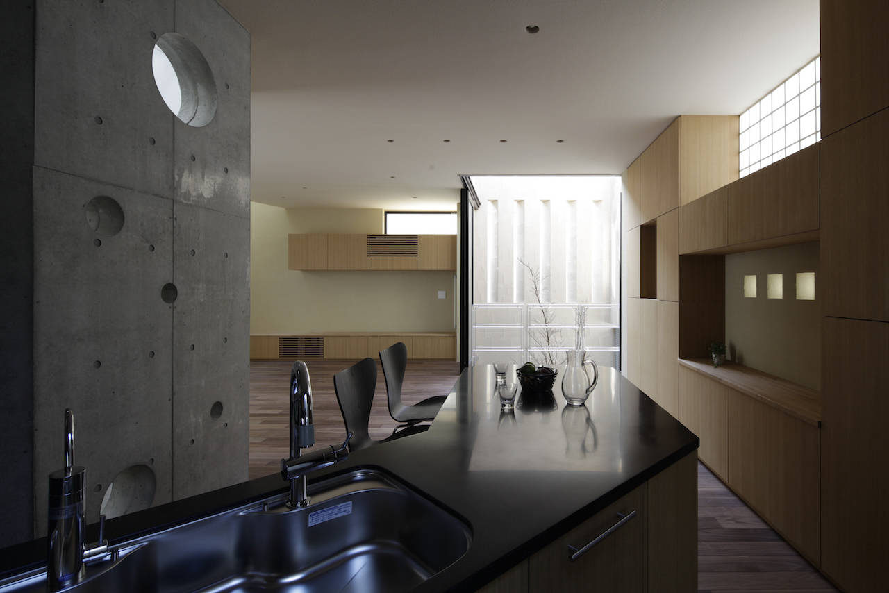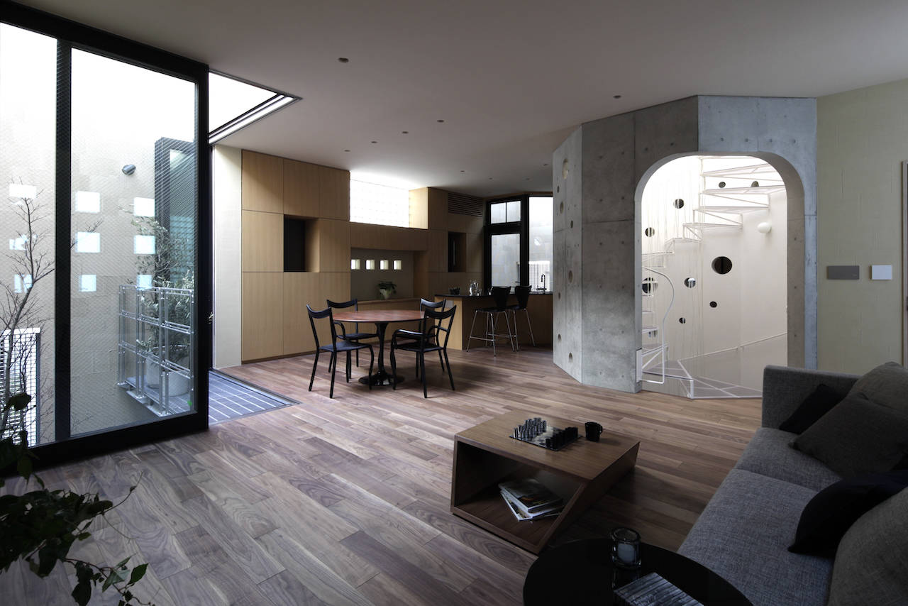 都市に住む、ということを考えるときに、その環境に正面から向き合うような方法を取ることは難しい。やはり、家にいるときに外からの視線を意識しなくてはいけないというのは安心できないと思うからだ。反面、都市に潜む隠者のような空間をつくることもまた、本来 「人が住む」ということに対して背を向けているように感じる。 雨が降ればそれを感じていたいし、夕方になれば変わりゆく 陽光を楽しみたい。だから少々難しくても、建築の中に<外>を導くような空間のあり方からスタートしたくなるのだ。当初、南北2カ所の坪庭と階段を外皮から「切り取る」ところから始まったプランニングでは建築のスケールに対して大きくなりすぎる梁をどのように扱うかが課題だった。しかし、設計も進行中のある日、ふと上下を貫通する八角形の階段室を挿入するプランが浮かんだ。生活上の要求にもそれは上手く作用しただけでなく、構造的にも有利に働き、層間をギリギリまでそぎ落とすことで、梁や柱がなく、2.8mという天井高を持つリビングのボリュームを実現することができた。