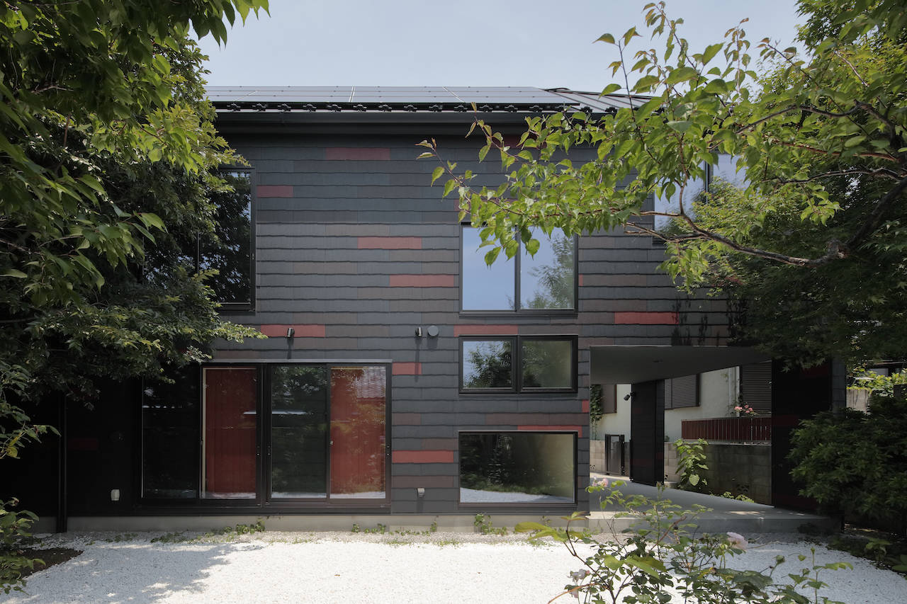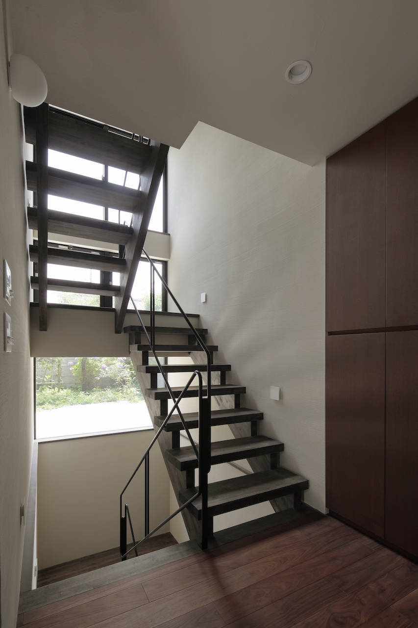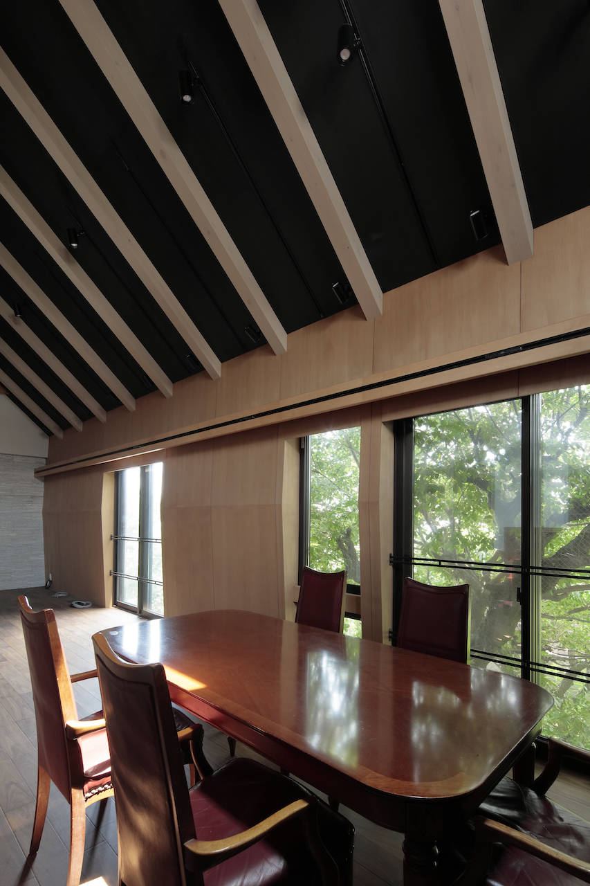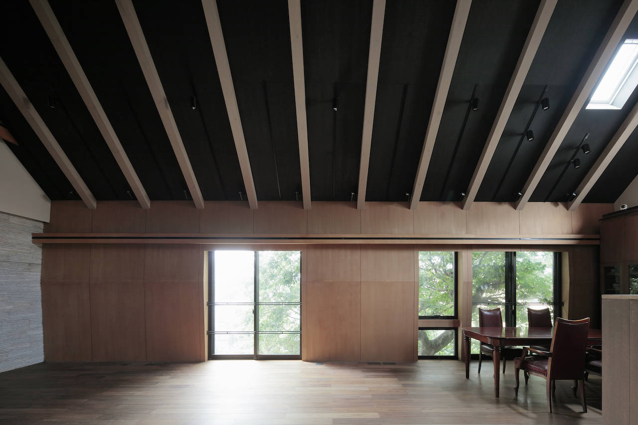 この住宅はクラッシック音楽を愛する住み手が、 若い音楽家達のために演奏・録音、映像収録ができるように...ということを意図して設計されている。そのため2階にあるリビングルームは居間であると同時に、演奏をする場所としてふさわしい 「響き」が求められた。天井高は4mを超える部分もあり、木部の構造体は音を拡散するための要素としても想定されていった。 大きな壁面となる南側の壁には反響を自然にするために角度をつけてあり、 その壁の内側には遮音性能を高めるための遮音材が充填されている。比較的、開口部の面積が抑えられているのも遮音性能と響きを意識してのことだ。
