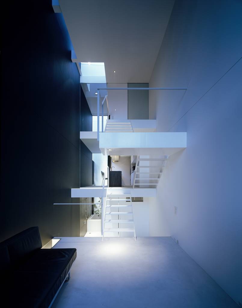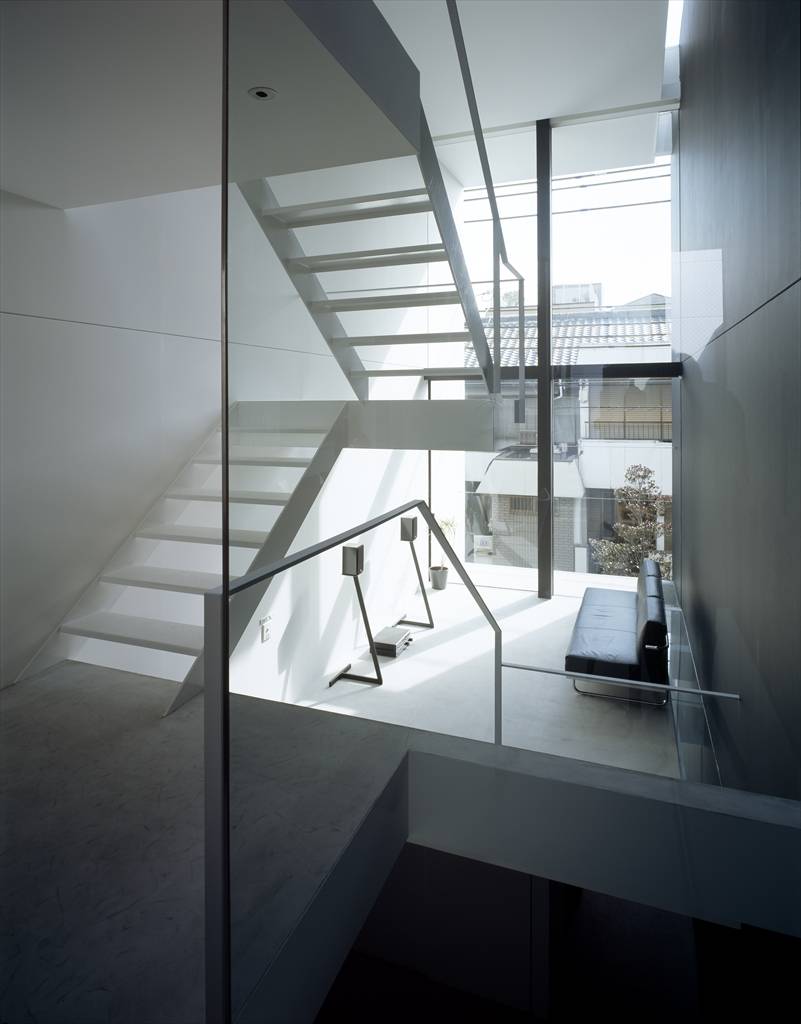 建物のディテールは、建物の長手方向に対しての連続感や透明感を高めることを検討した。階段を、建物の中心にしながらも、視線の抜けを確保した。部屋の仕切りにはガラスを使用し、床や天井にスリットを作り、外部からの連続感を出している。