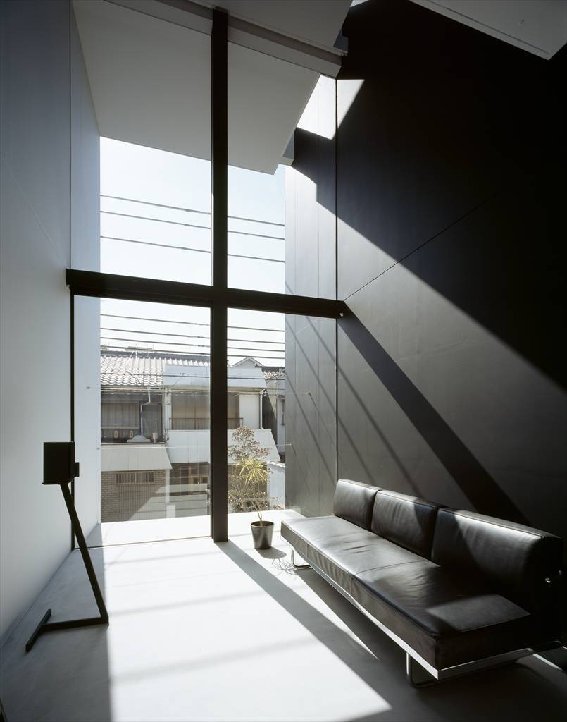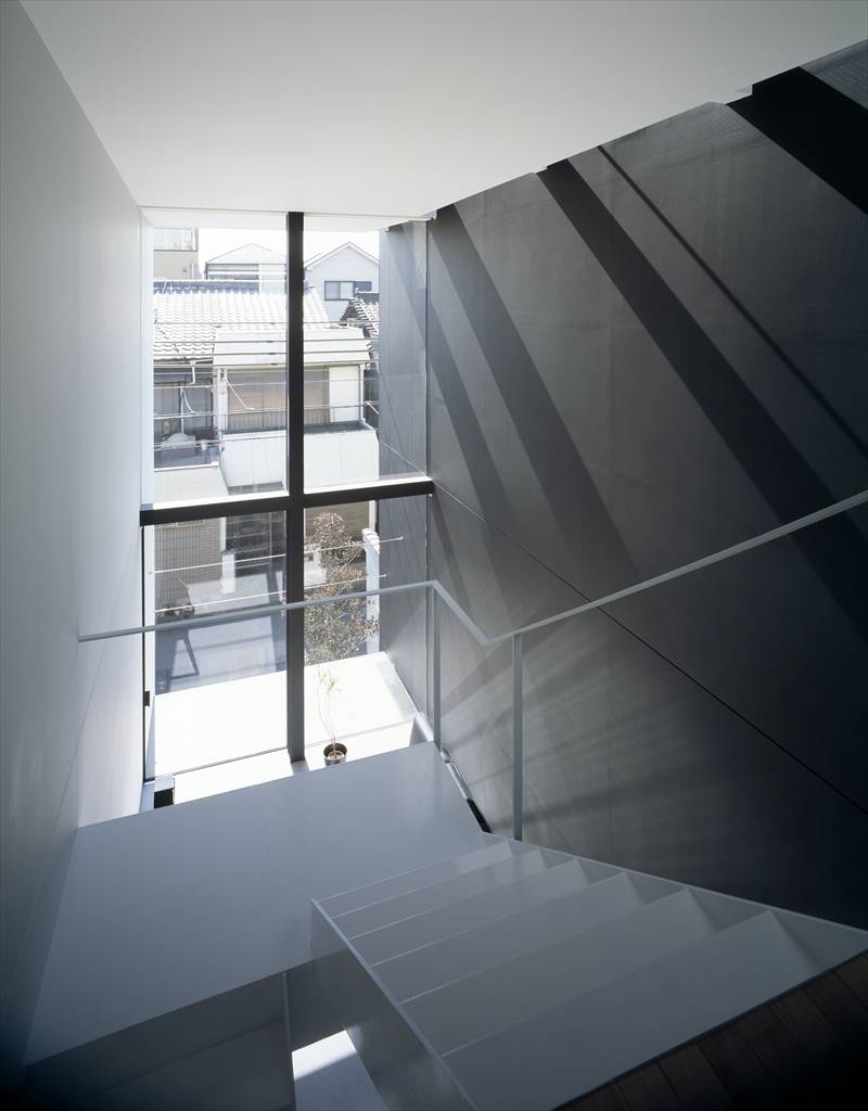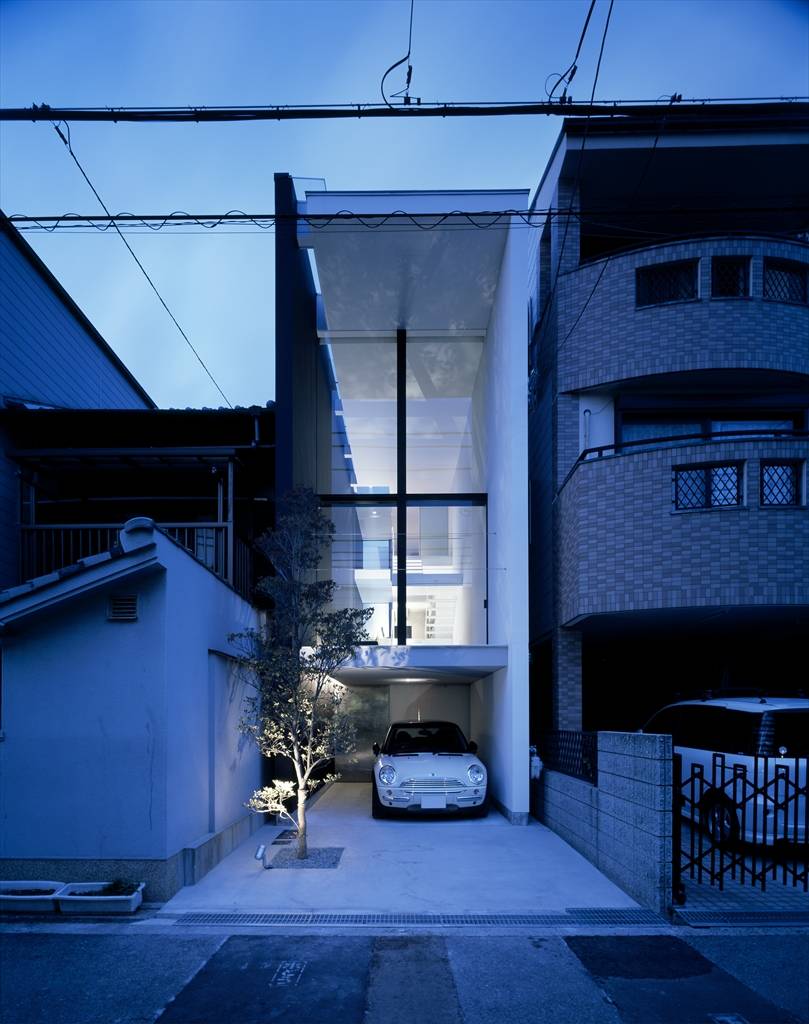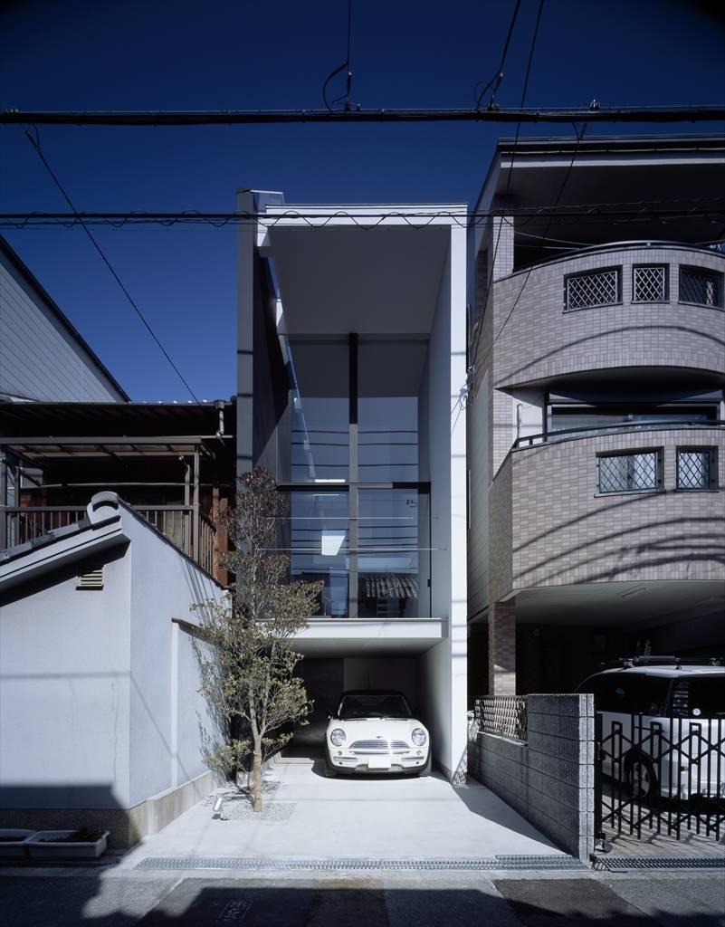 都市部の狭小敷地での計画の場合、一般的には敷地いっぱいに建物を建て、建蔽率をクリアする為に中庭を設けることで、内部に広がりとプライバシーを保つ、といった方法がよく取られる。そのような計画の場合、道路側である都市側は壁が主体となり、圧迫感が感じられるファサードとなる。