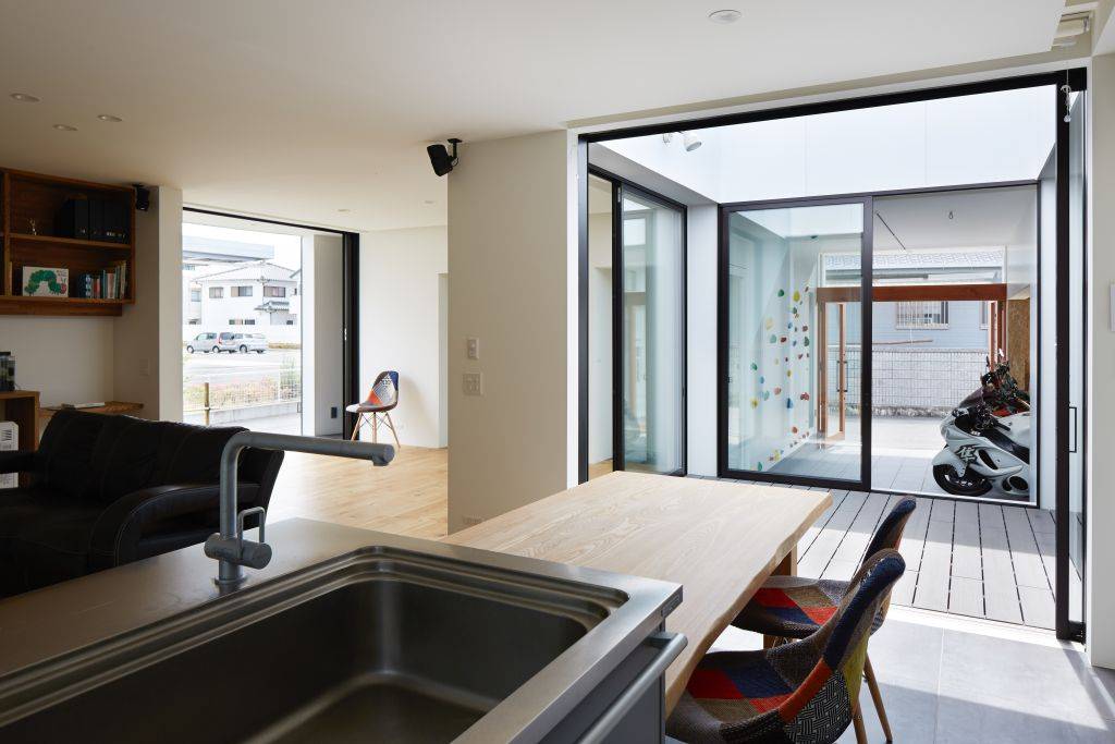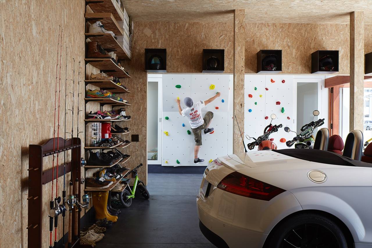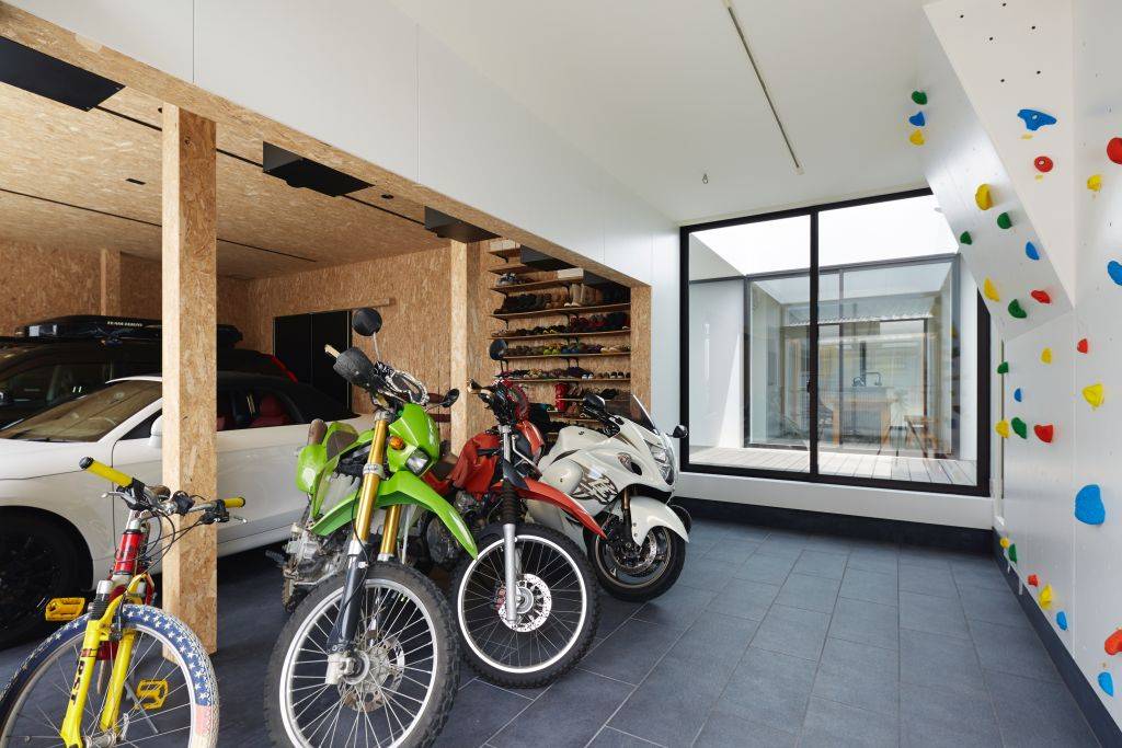 建物の大きな部分を占めるガレージは、車2台、バイク4台を停めることが出来、それらのパーツや、アウトドアの道具が置ける場所になっています。また、施主自身が、後々カスタマイズできる空間としています。玄関は、バイクガレージと一体となっています。通りに面しショップのようなガラス張とし、壁面にはボルダリングが設置されています。