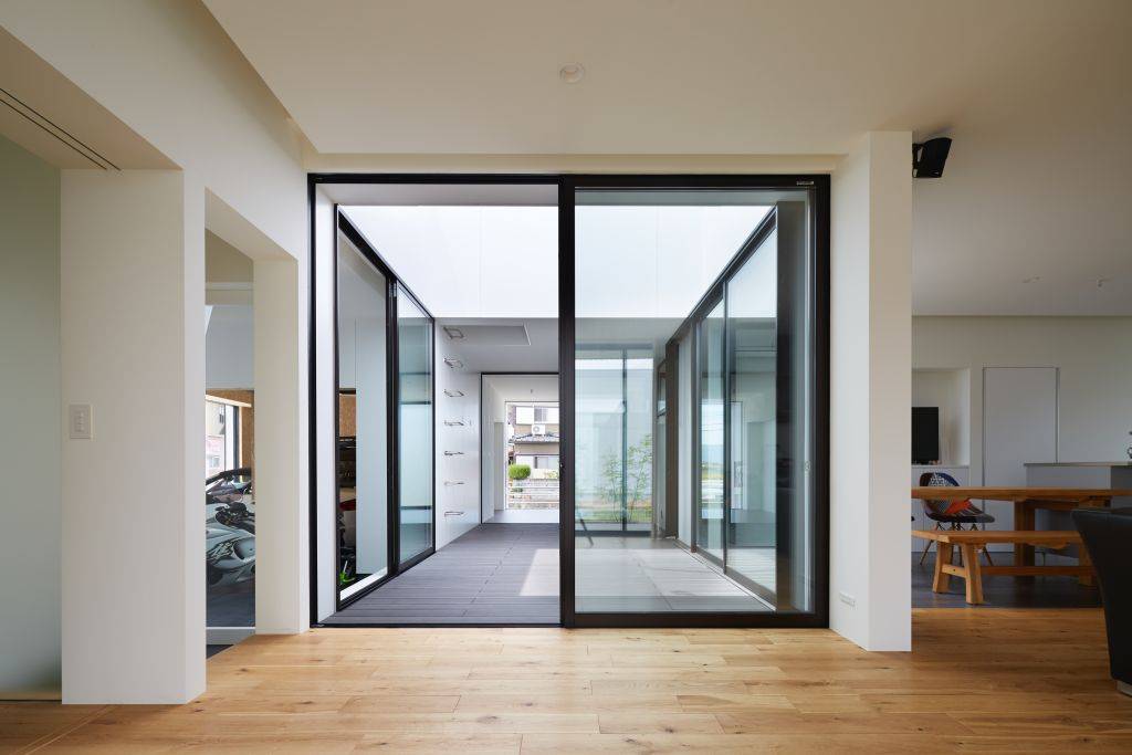 建物内部は、デッキの中庭に面して居室を設けることで、開放感を考えました。ダイニングからは、屋外での食事がすぐに楽しめるようになっています。ダイニング、リビング2、趣味室、玄関は中庭に面しています。中庭を中心とすることで、バーベキューなど、人が集えるように考えています。