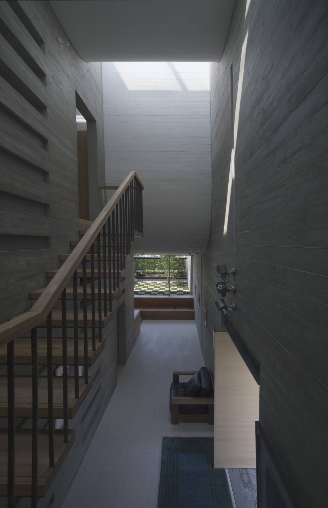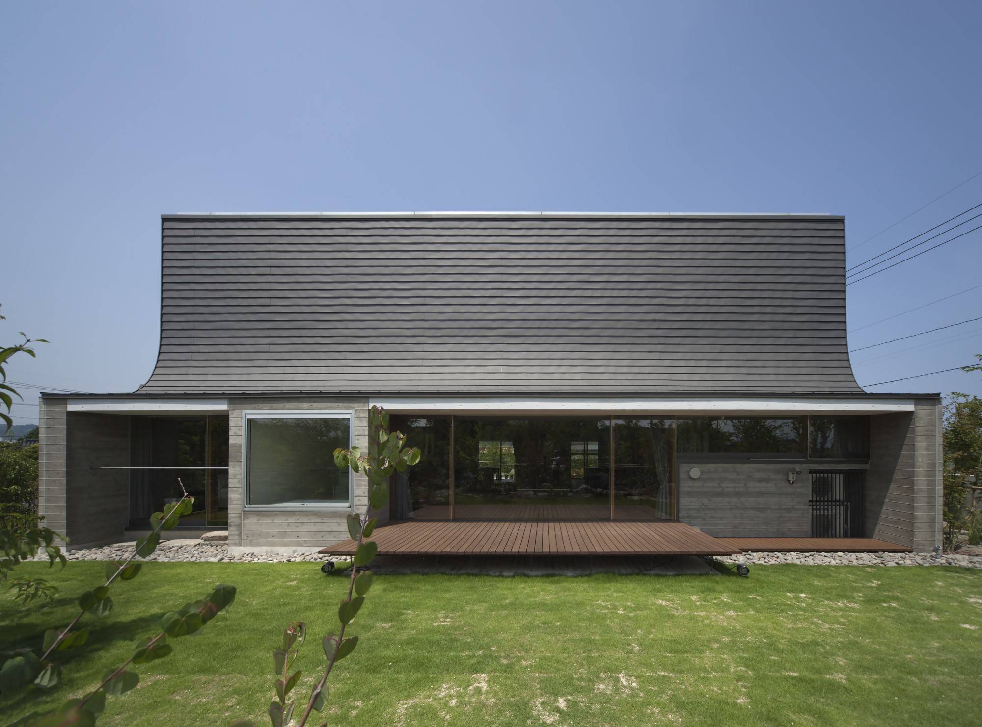 敷地の東側を流れる川の向こうには田園風景が広がり、西側には筑豊の山々が見える。川沿いの道路からの視線をコントロールするために、敷地を少し高くして道路沿いに塀を設け、南北に長い敷地中央に建物を建てて四季が感じられる庭を両側に確保した。