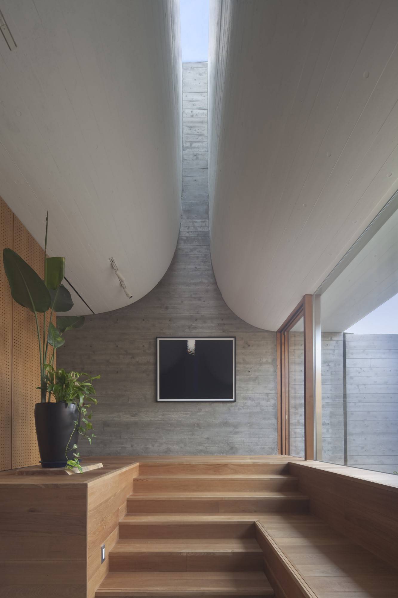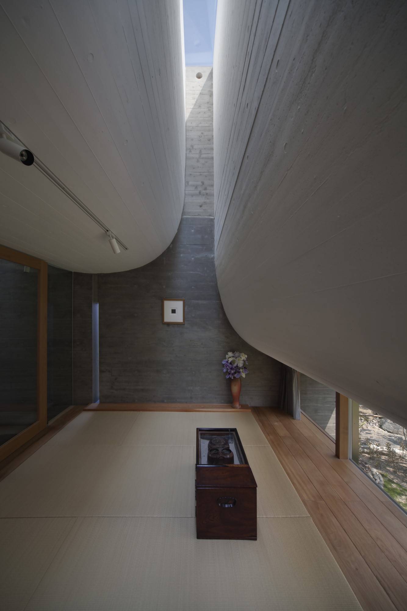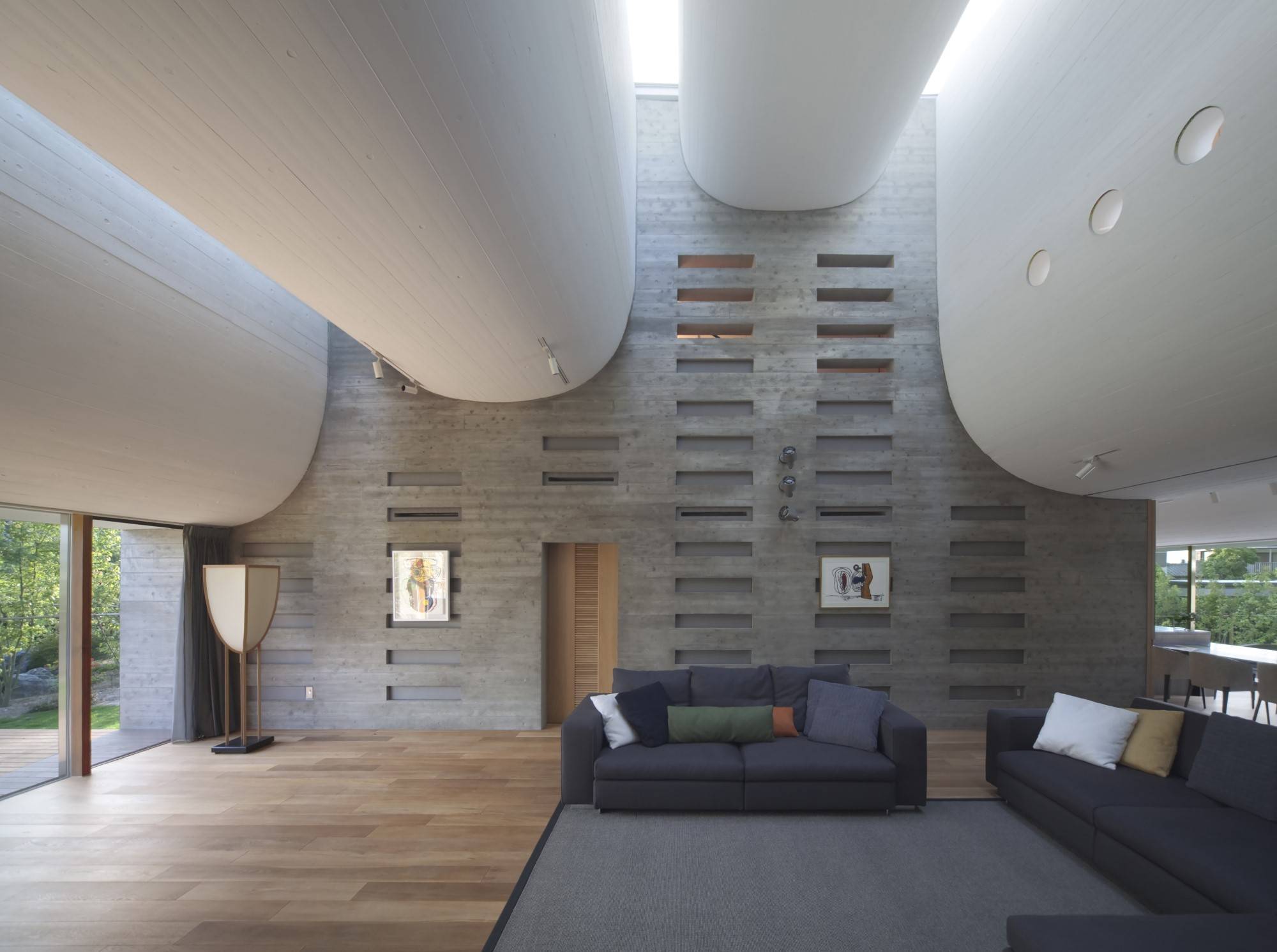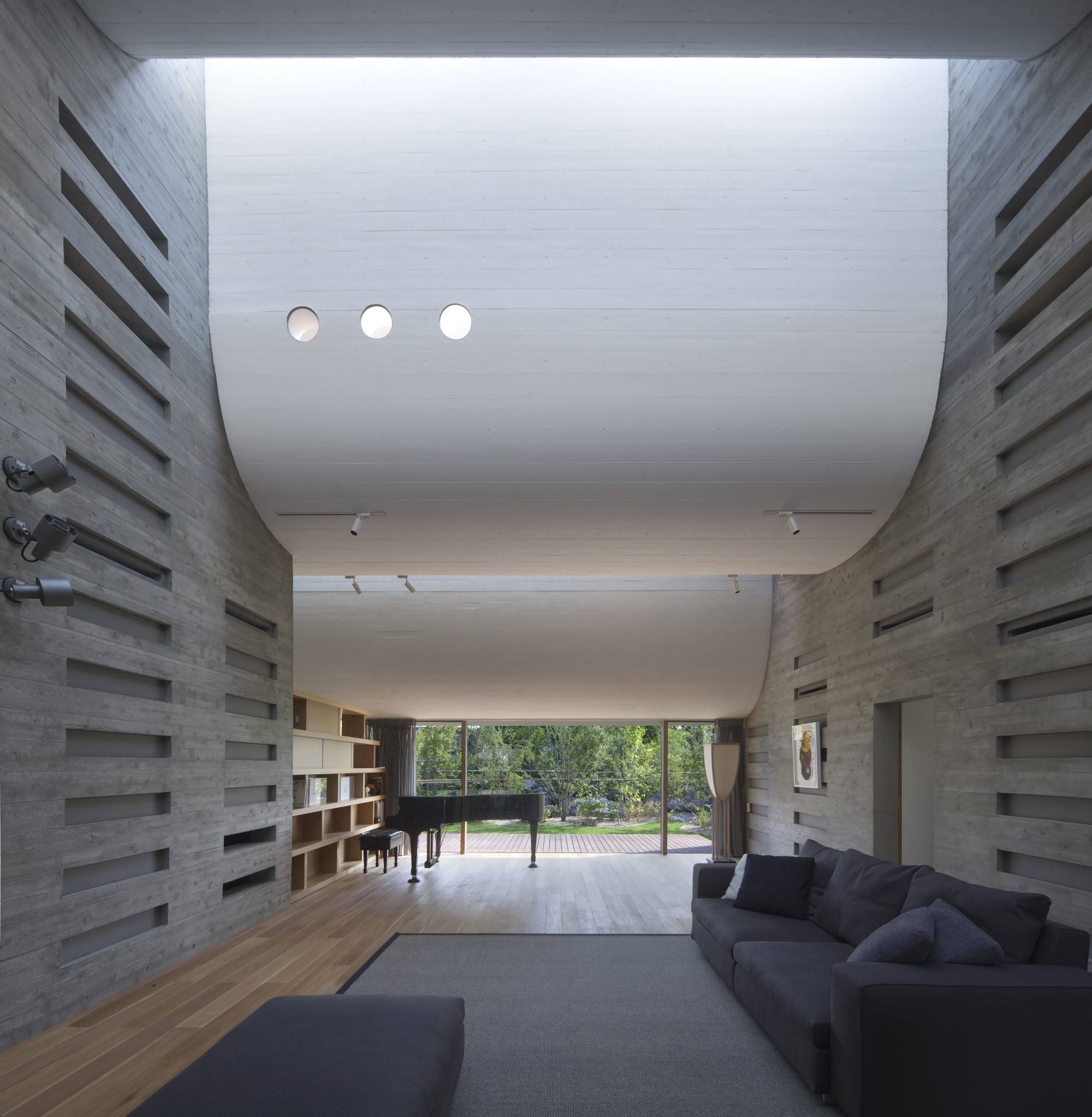1階は南北の庭に対して開放し、芸術作品のギャラリーになる広い玄関、音楽ホールになる居間、そして主に子世帯が使う食堂、厨房、寝室などを配置している。特徴的な曲面を描く高い天井の頂部には天窓があり、曲面は光を柔らかく拡散させ、音楽の演奏時には音を拡散させる役割を果たす。一方親世帯の住戸と個室中心の2階は東西方向に開放し、できるだけ自然豊かな眺望が得られるようにしている。