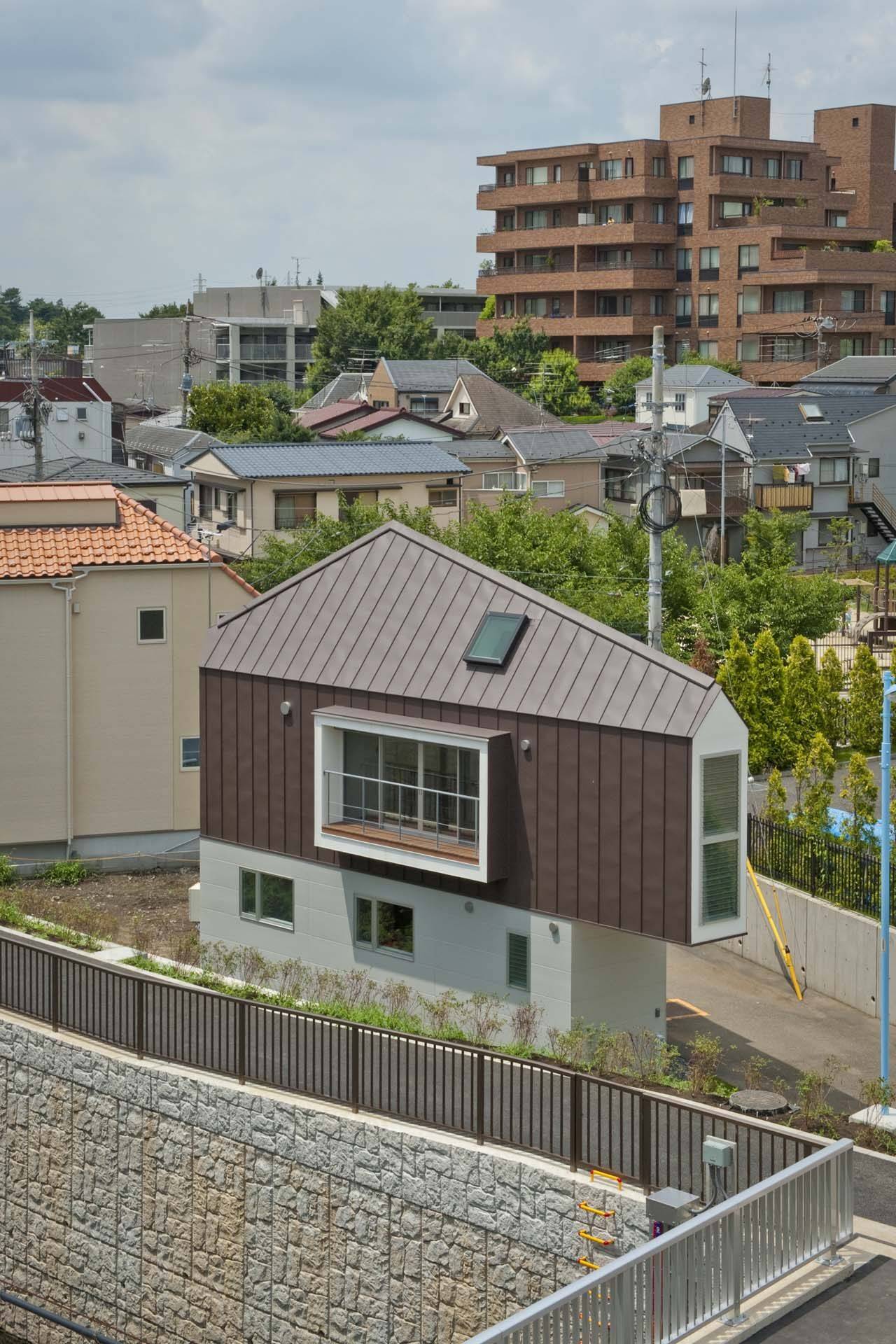 川と道が鋭角に交わってできた三角形敷地と相似の三角形平面を、鋭角部分でカットして斜線制限内で最大限確保できる変形寄棟の外形ボリュームとしている。1階はプライベートな階だが、水廻り以外は仕切らずに、玄関・階段・収納などとはレースのカーテンで仕切るにとどめた。2階は屋根の稜線によって一体につながりながら耐力小壁によってエリア分けされ、それぞれ違った開放感と川との関係をつくりだしている。西側で平面的に最も広いダイニングキッチンは天井が高い上昇感。中央部のリビングは天井が低く両側の出窓が外側に延びる浮遊感。東側の予備室は川の流れの向かって深淵の先を見るようである。中央上部のロフトには2つの天窓が設けて川と空が見える。限定されたボリュームにも様々な空間をつくることができた。
