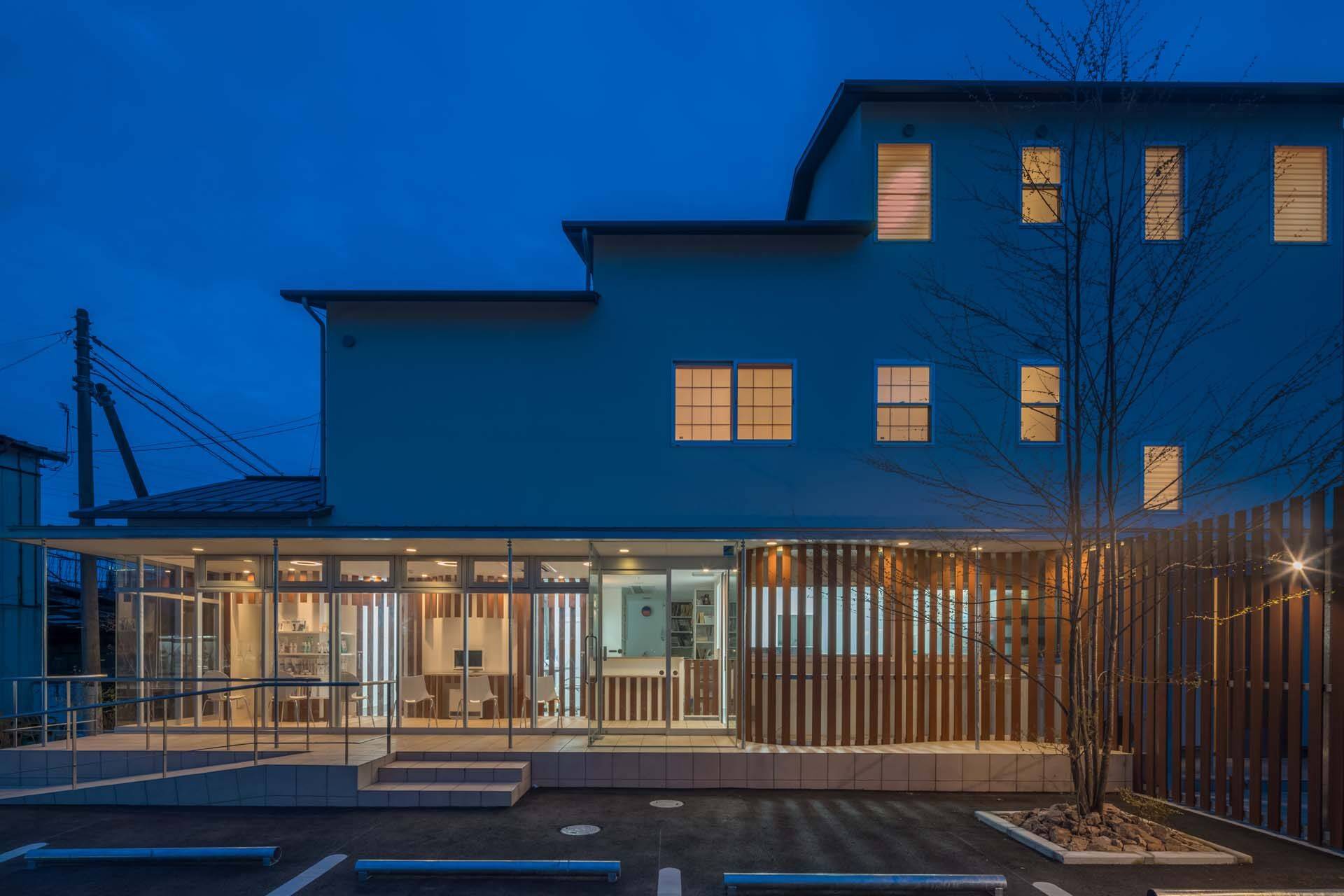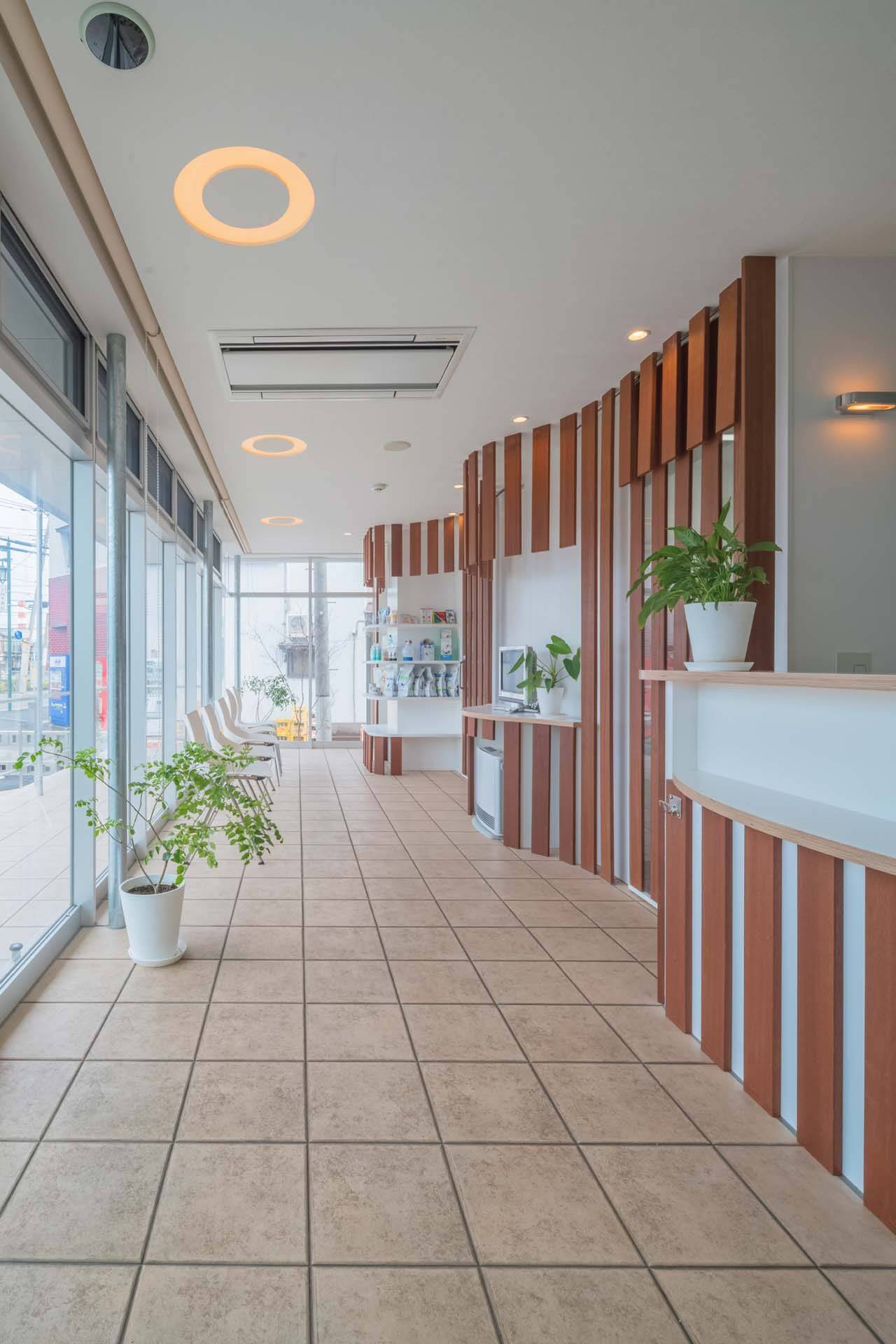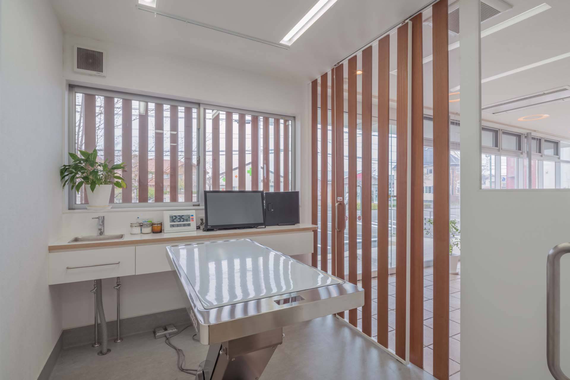 動物病院併用住宅の建て替え計画。1階動物病院と2,3階住宅部分で必要な機能と面積を形にすると、1階>2階>3階と上階へ行くほど小さくなるボリュームとなったため、東側道路に対しては上階へ行くほどセットバックすることで威圧感を軽減している。さらに2階広間の一部が半階分の吹抜となることで、1階、2階、2.5階、3階の4つの切妻屋根が連続した形となった。 駐車スペースの病院/住宅エリアを分けるルーバー壁はガラス張りの待合内部にまで曲面を描きながら連続し、4つの切妻屋根のボリュームを浮き上がらせて見せている。住宅部は2階で畳敷きが連続する広間が特徴的で、LDK・寝室・客間・勉強室といった機能が、襖で仕切られつつ続き間としてつながった家である。