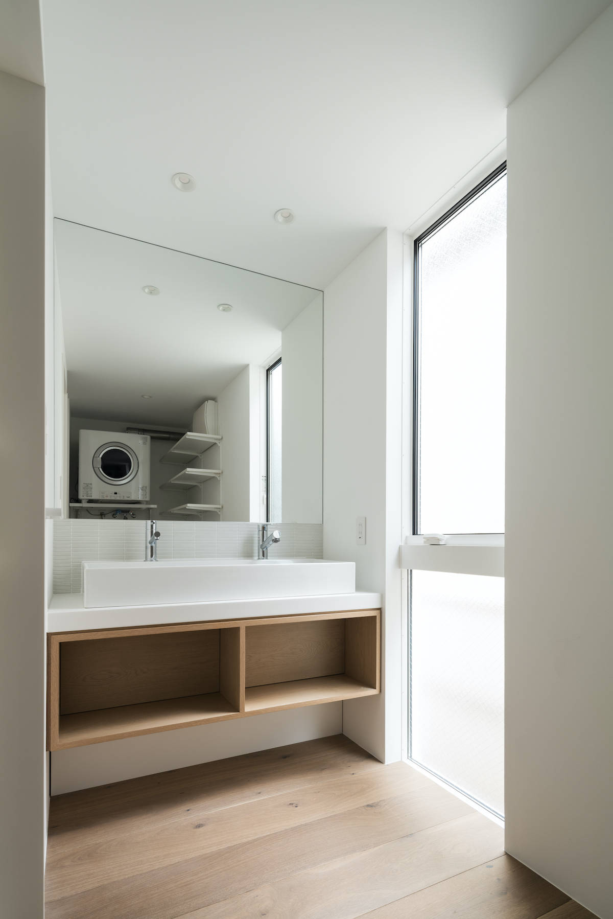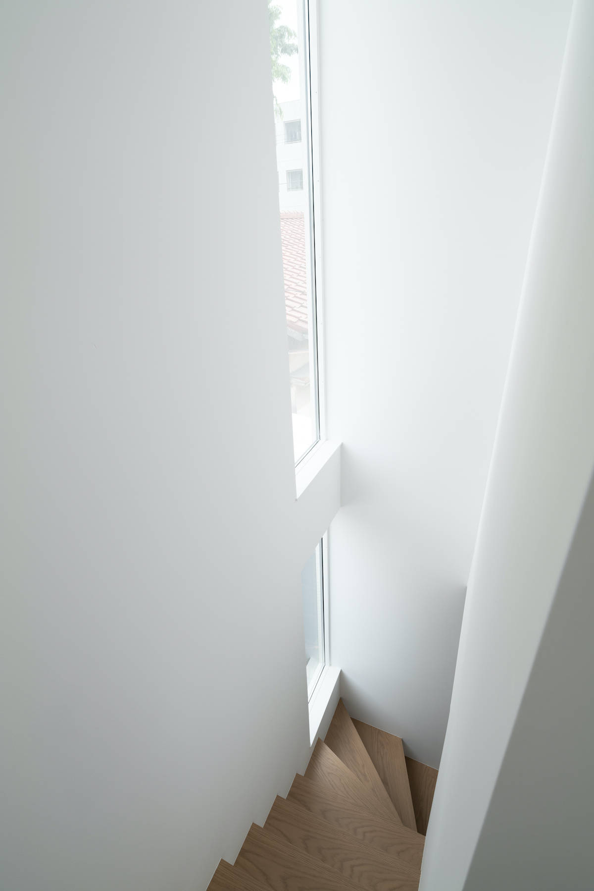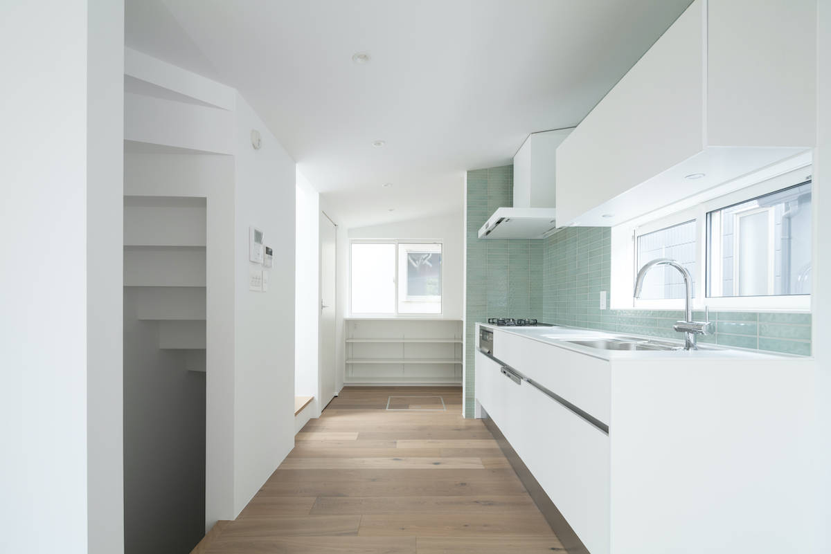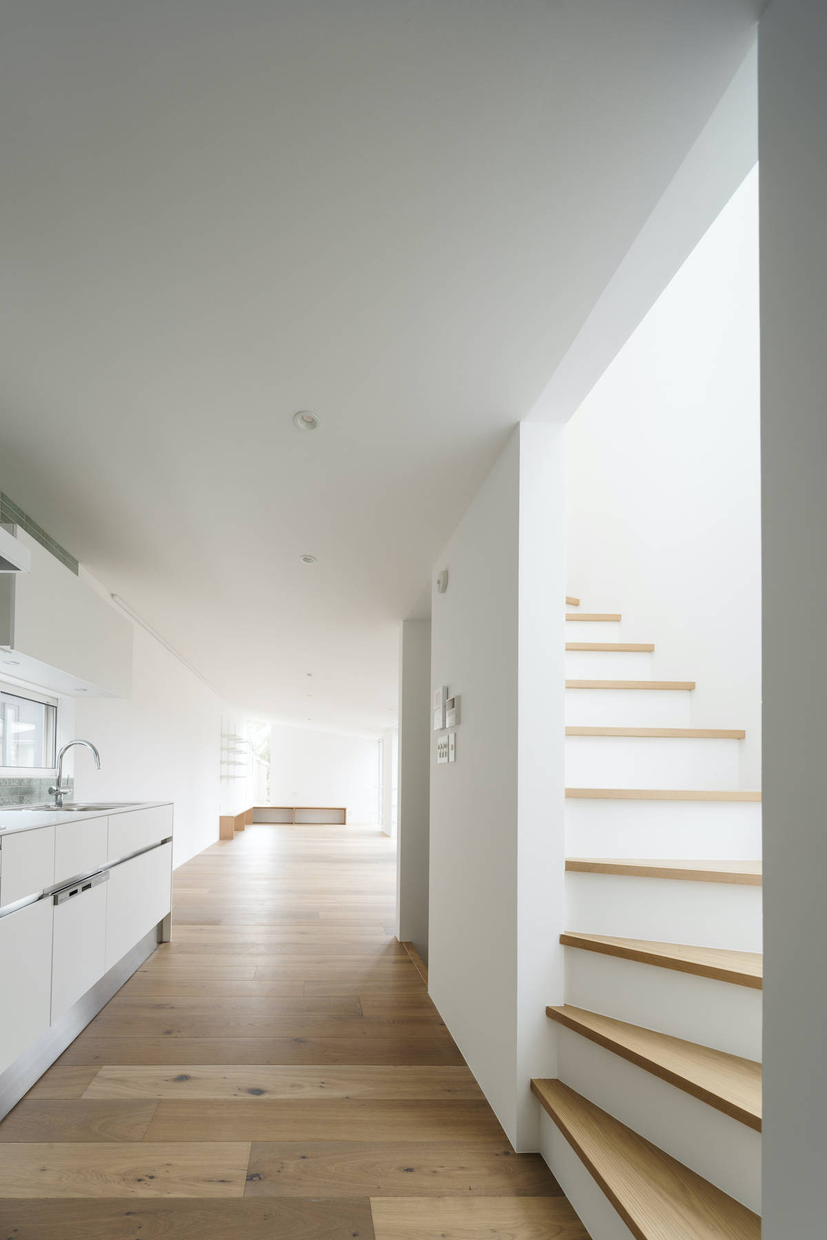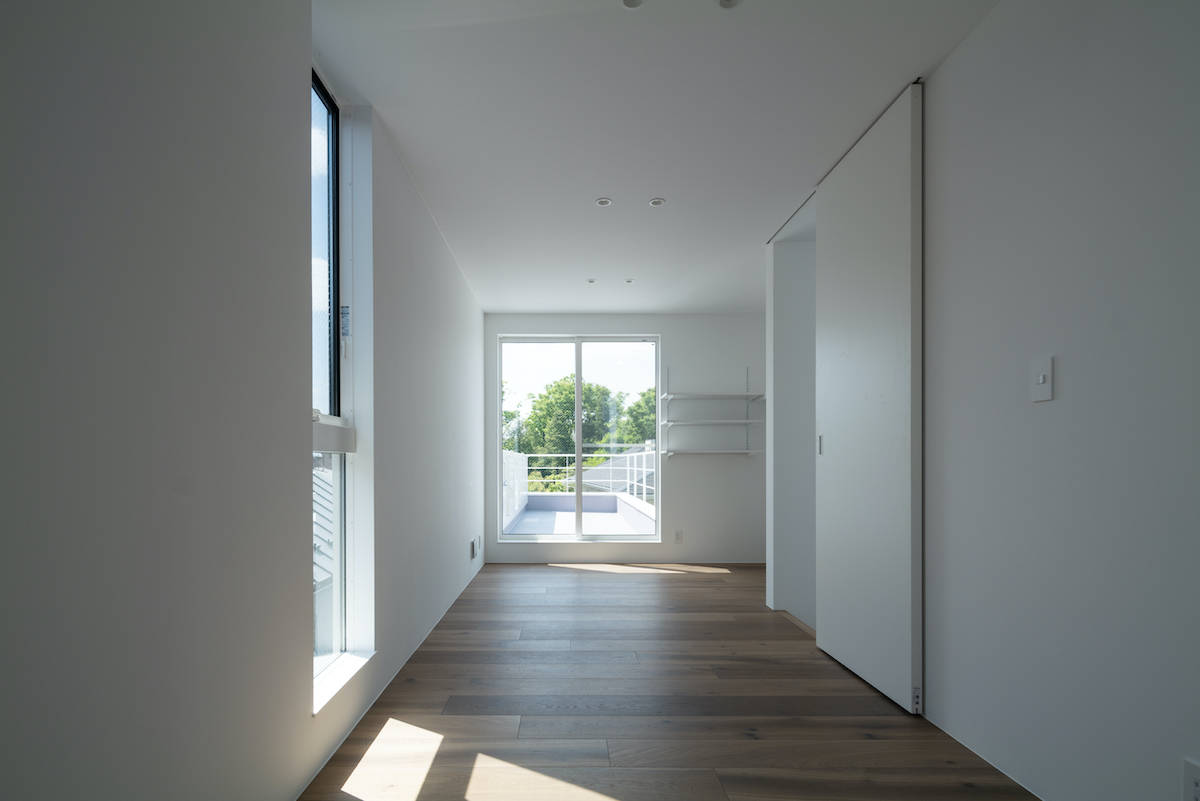 建主は真っ白で明るいシンプルな家を希望しており、視線の先に明るさや抜け感のある光が美しい住宅を提案した。