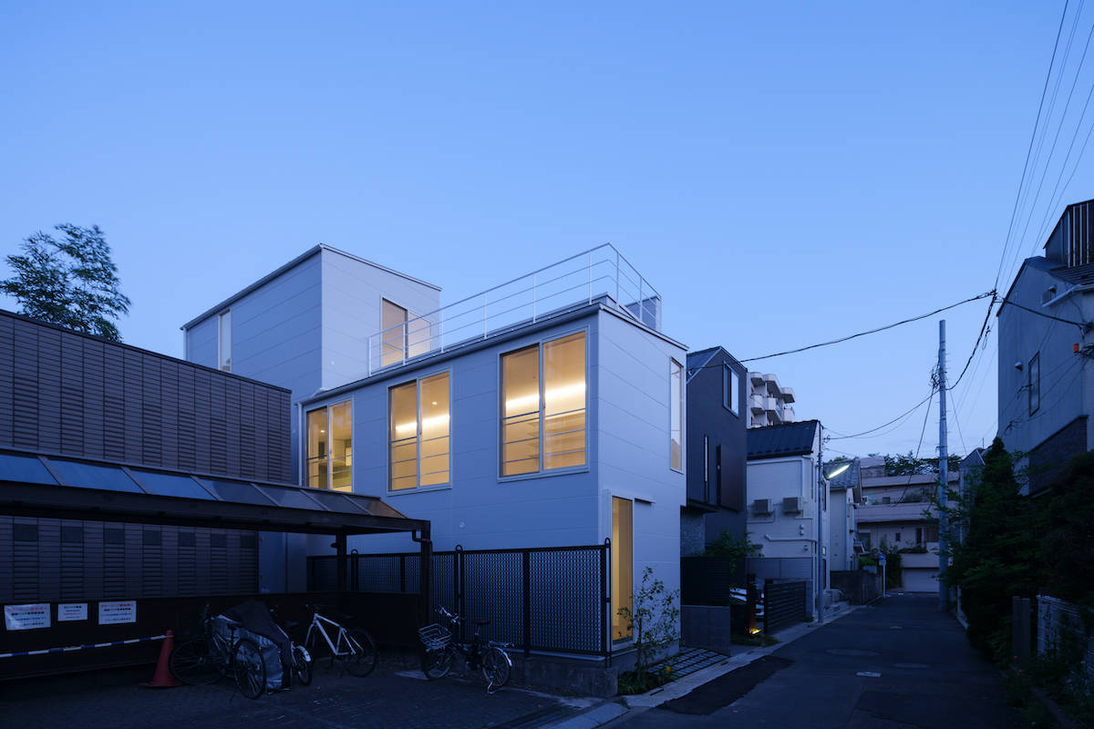 駒沢公園近くの木造3階建ての新築一戸建て住宅。間口は約4.5m奥行き14.5mの細長い敷地をしており、近隣商業地域と第一種低層住居専用地域にまたがっている。