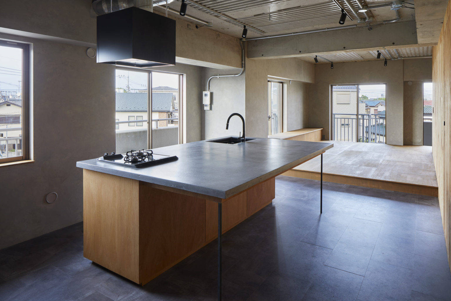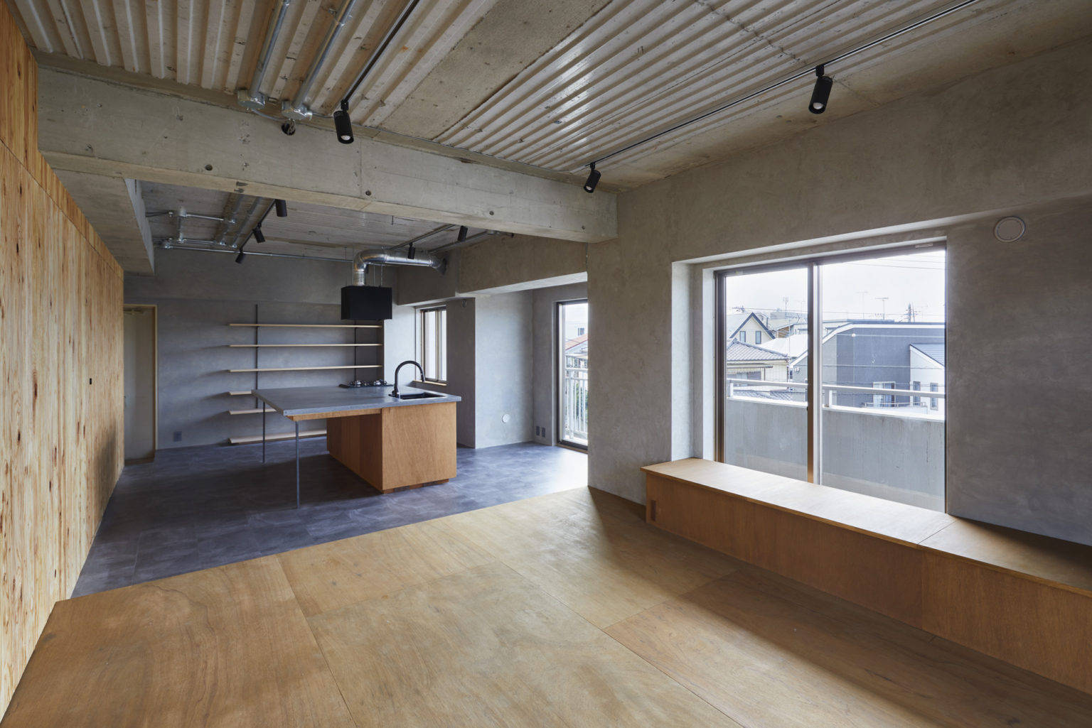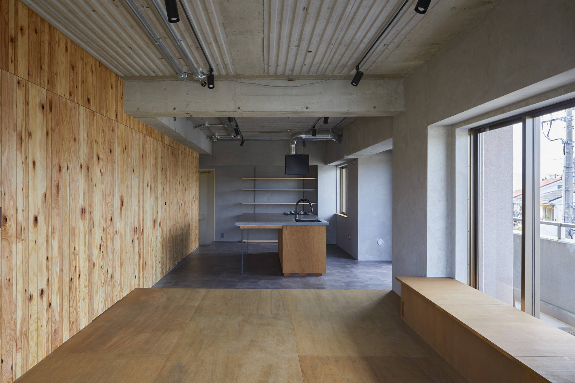 角部屋の魅力を活かすために、すべての開口部に面するような大きな部屋を計画した。リビング、ダイニング、キッチン、寝室までがひとつながりになっている大きなワンルームである。特定の機能を持たせず、小さな段差やベンチなど、居場所の手掛かりだけを計画した。出来上がった空間はワンルームだが、夫婦が思い思いの場所で過ごし、今後どのような生活スタイルに変わったとしても、その変化を受け入れられる可能性を持った空間である。