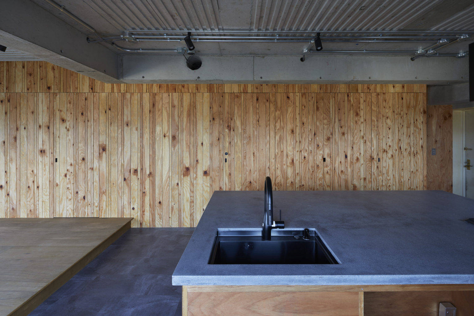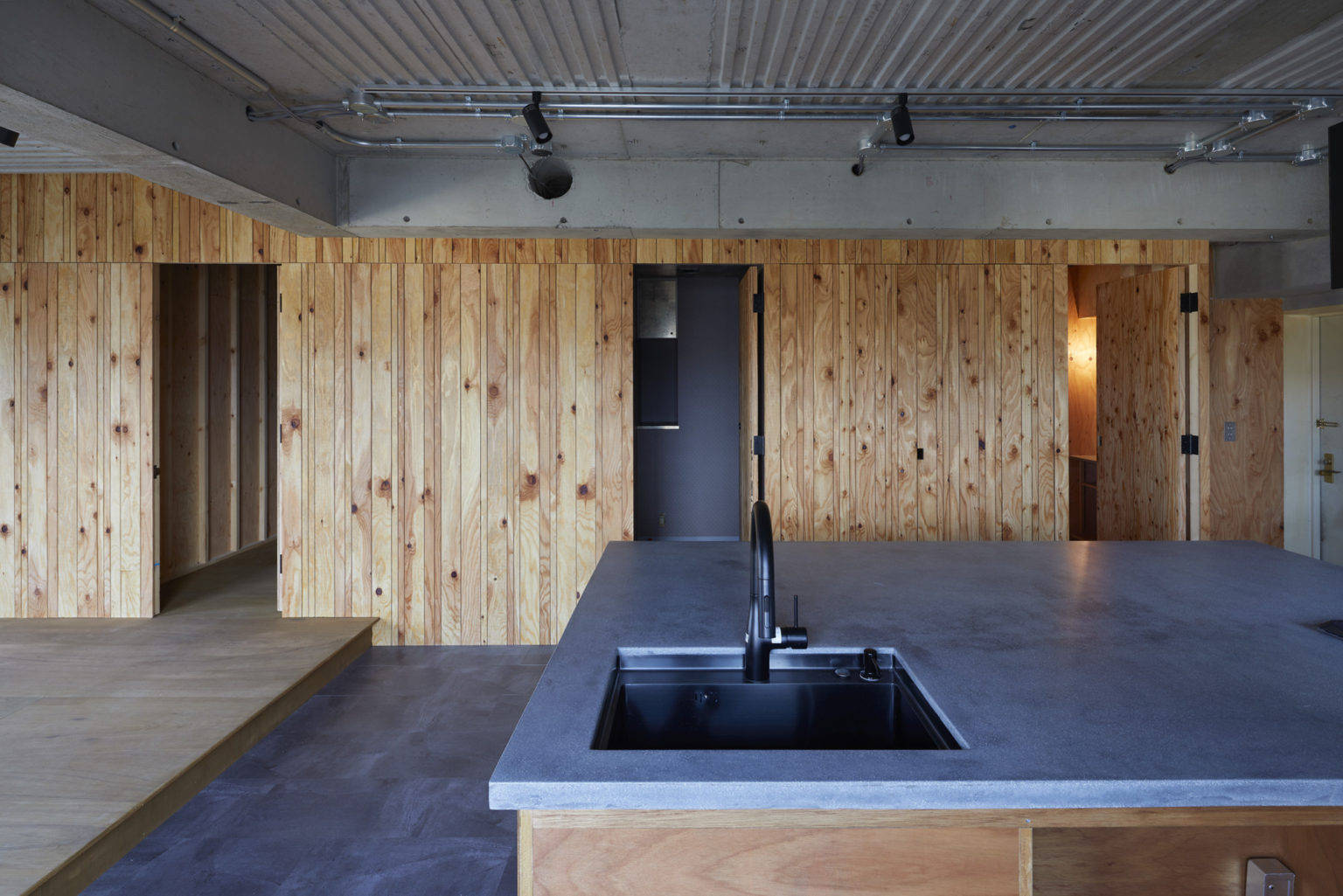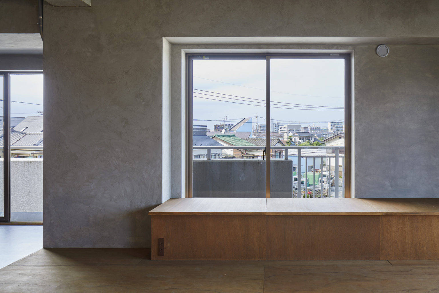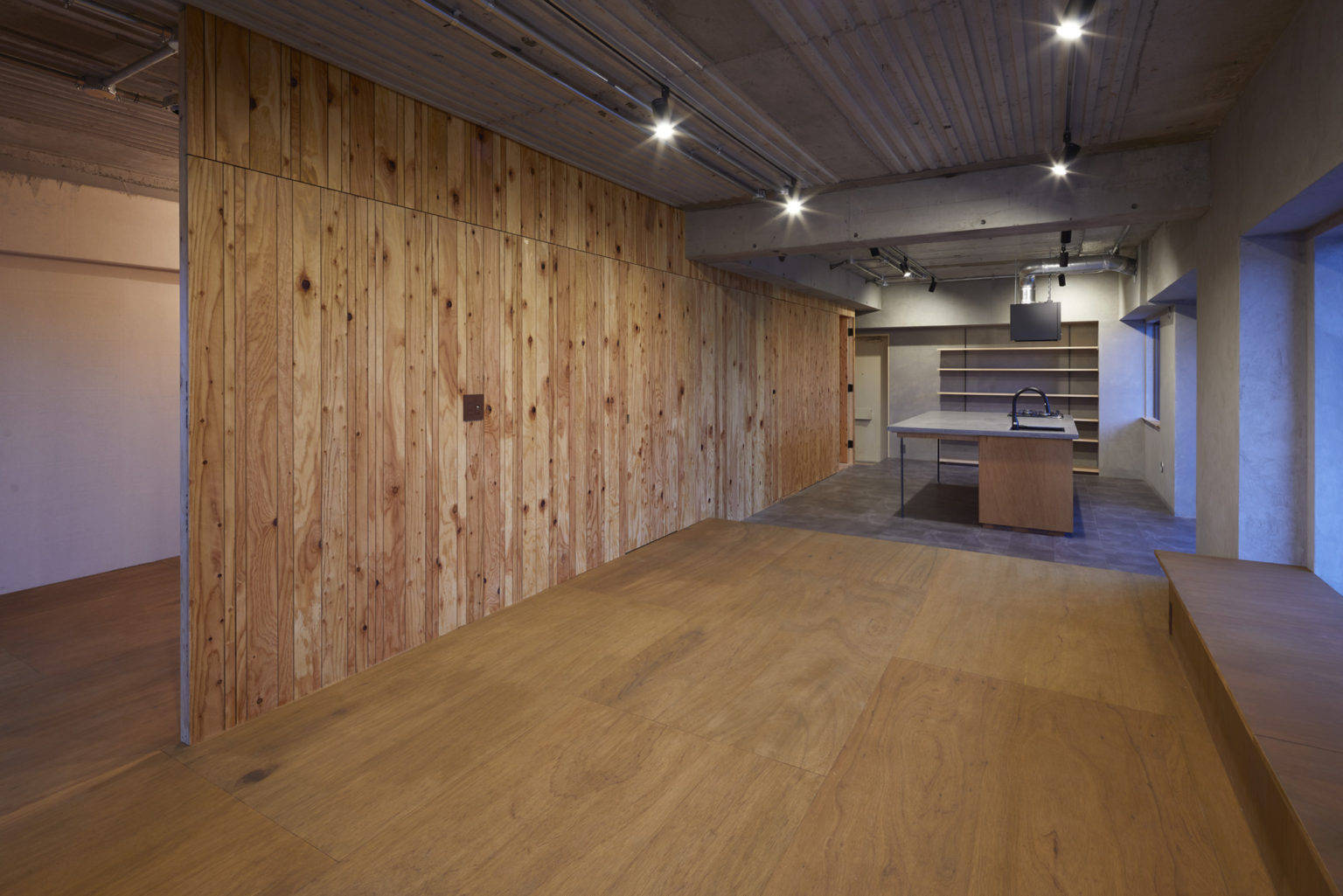 角部屋の魅力を活かすために、すべての開口部に面するような大きな部屋を計画した。リビング、ダイニング、キッチン、寝室までがひとつながりになっている大きなワンルームである。特定の機能を持たせず、小さな段差やベンチなど、居場所の手掛かりだけを計画した。出来上がった空間はワンルームだが、夫婦が思い思いの場所で過ごし、今後どのような生活スタイルに変わったとしても、その変化を受け入れられる可能性を持った空間である。