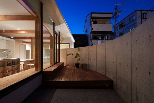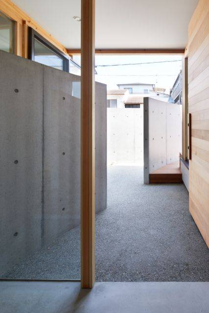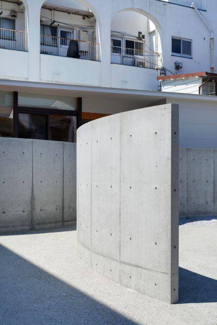 円弧を描くコンクリート塀は建物内部まで入り込むと、間仕切りとなります。