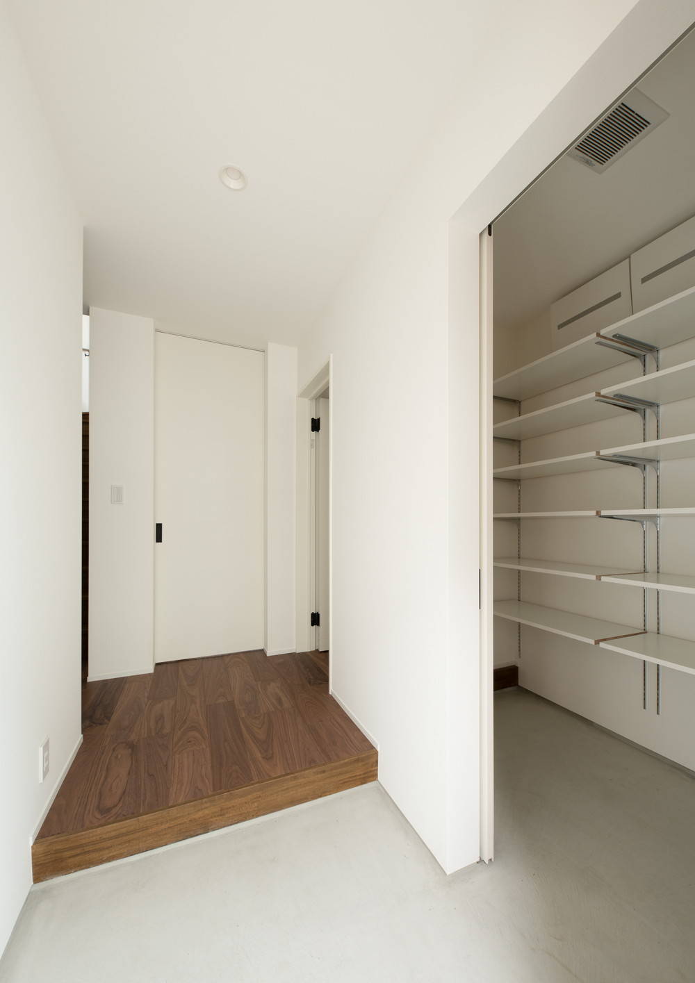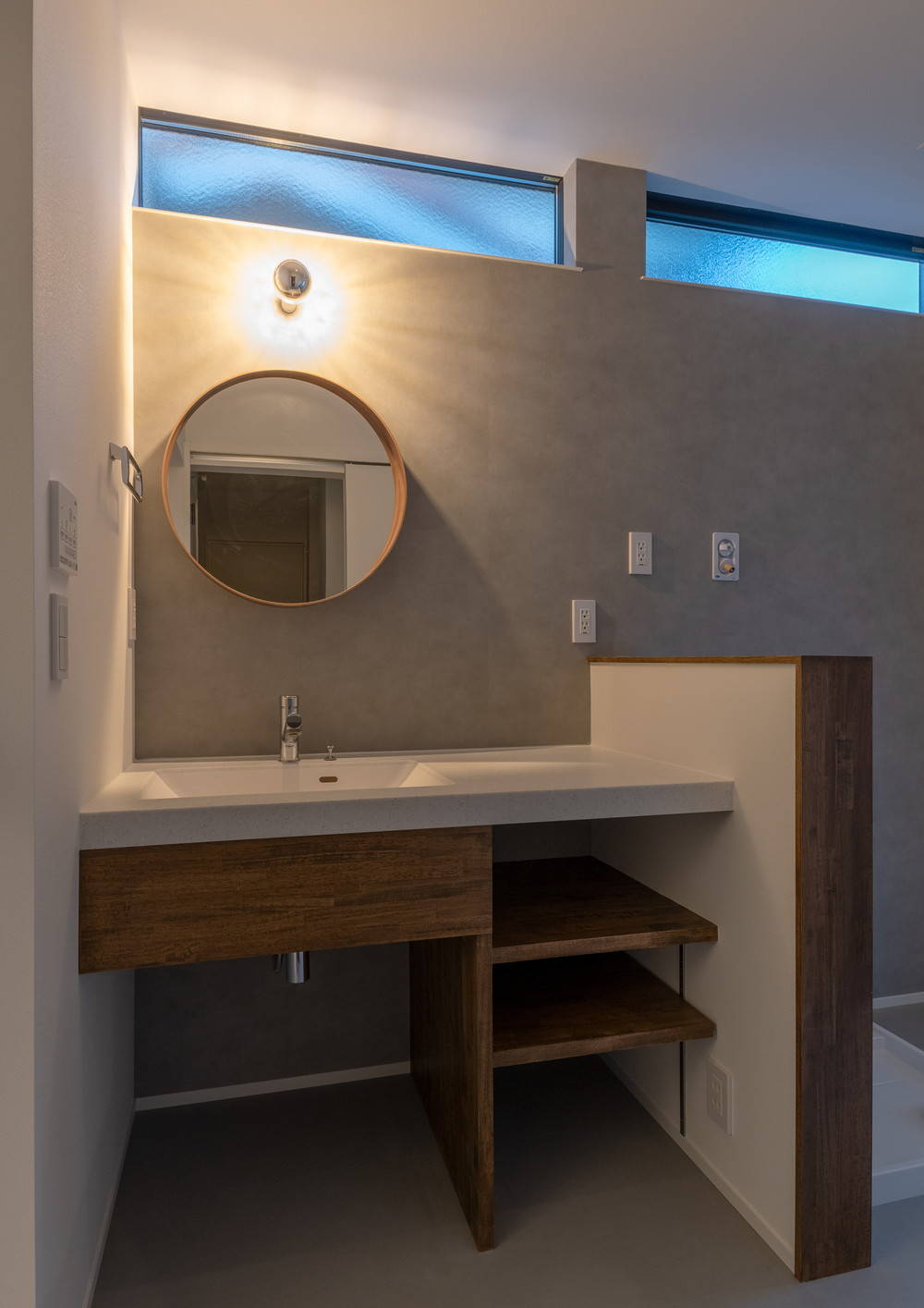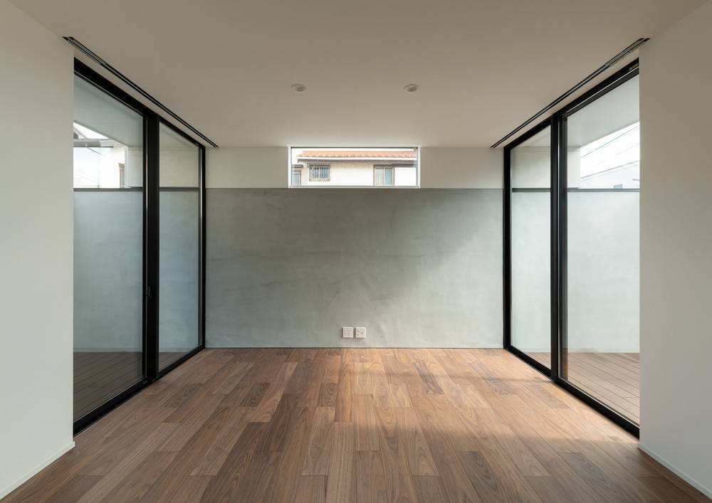 固いイメージを与えるモルタル壁が、外部に対しては守る印象を、内部に対しては素材の柔らかさを演出します。