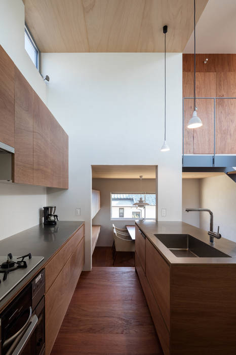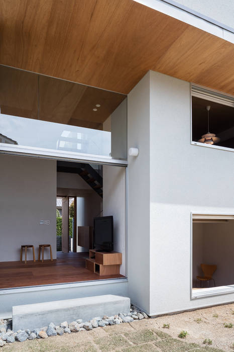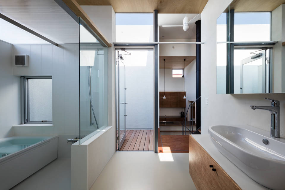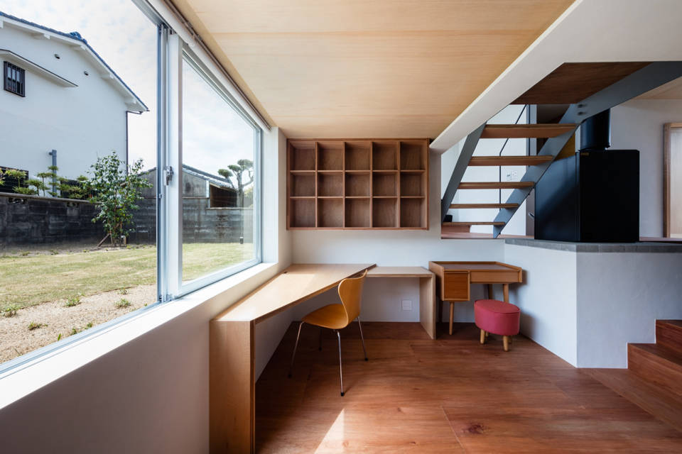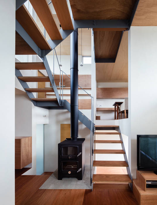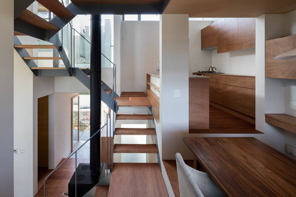 敷地と道路との高低差を利用して各室をスキップさせ、それらを中央の階段でつないだプランを持つ住宅。それぞれのスペースが独立しながらも大きなワンルーム空間となっている。その階段下には薪ストーブが置かれ、文字通り火を取り囲むようなプランとなっている。