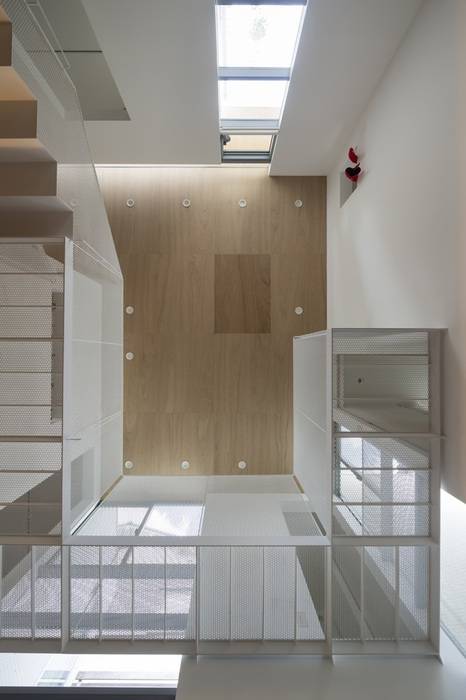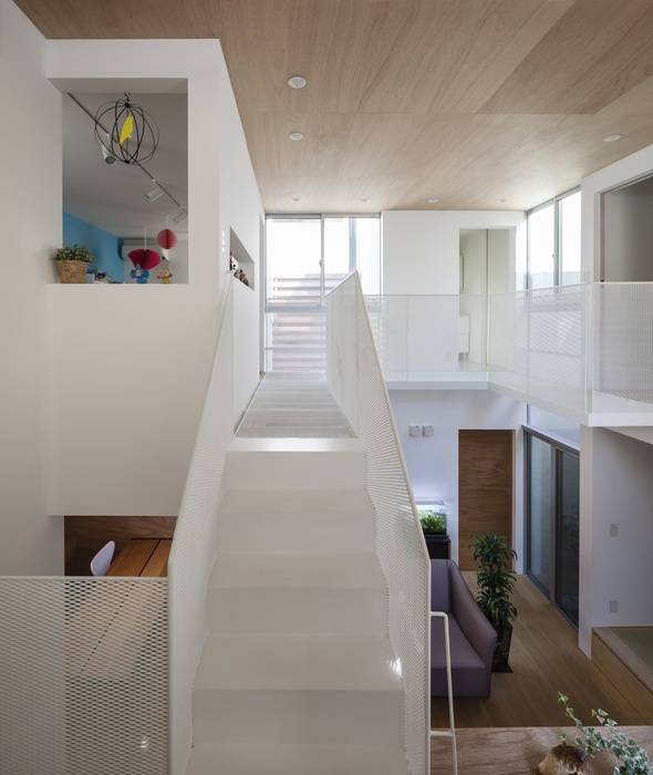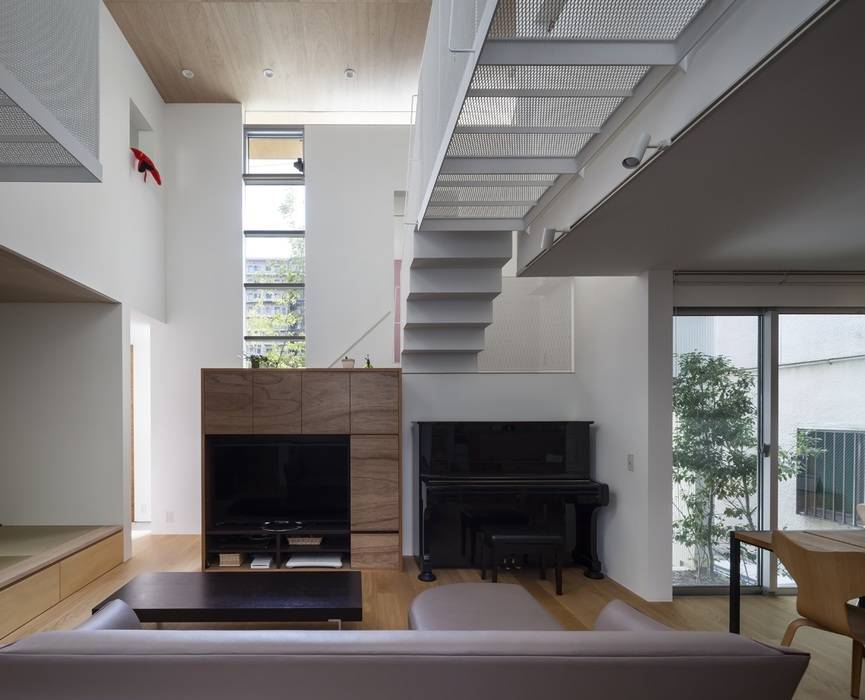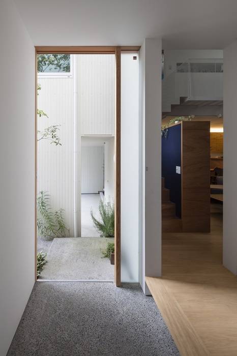 三方を隣家に囲まれた住宅密集地での建て替え。外壁面はかつてここにあった住宅の輪郭をトレースするように、できる限り隣家に近づけながら、三方それぞれに小さな庭を設けている。隣家との隙間を通り抜けた風は、凹状に設けられた小さな庭を通って光とともに内部へもたらされる。