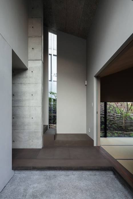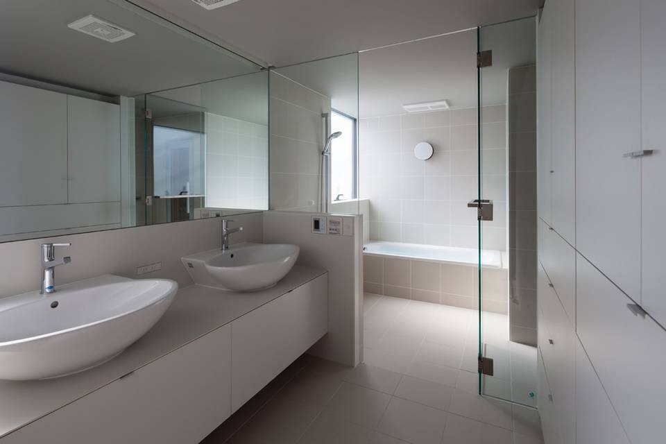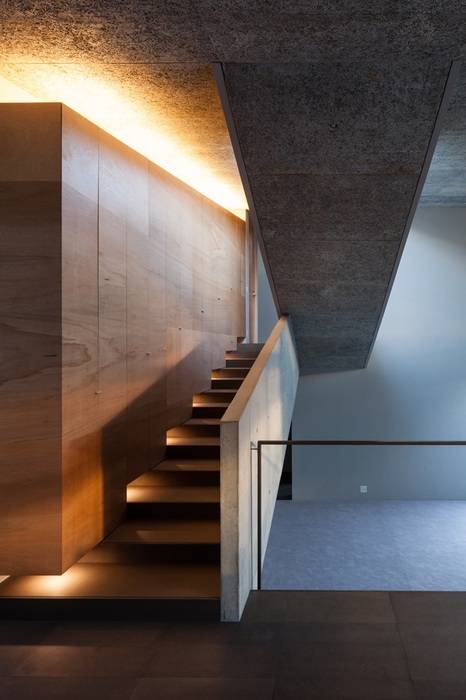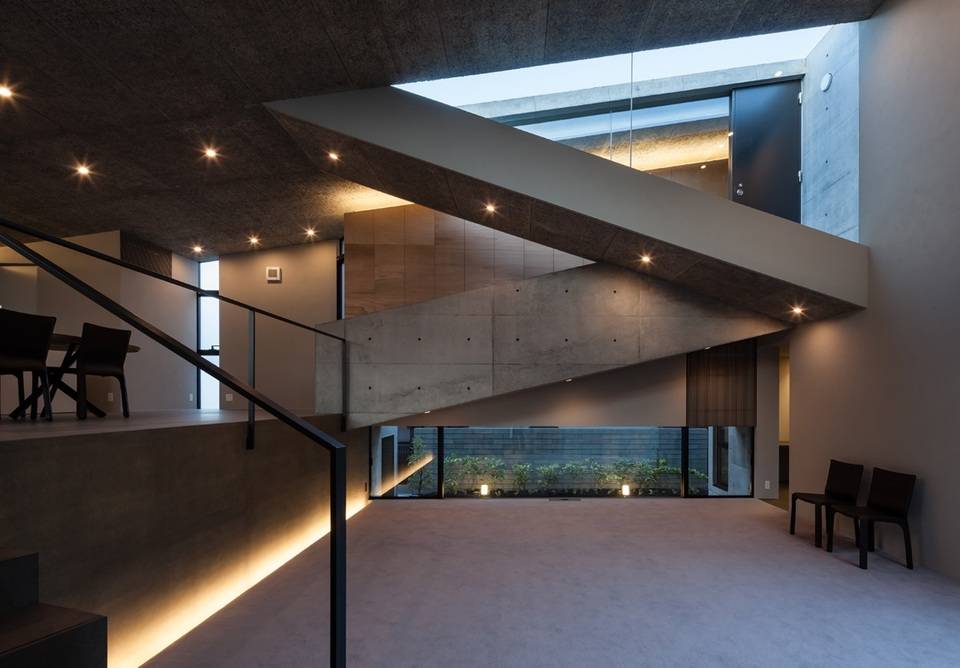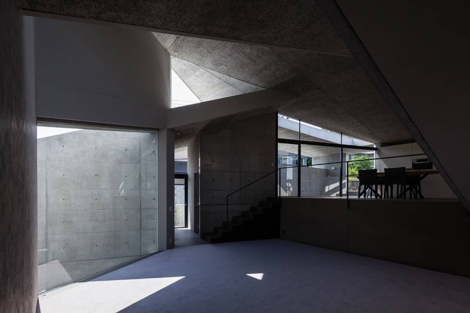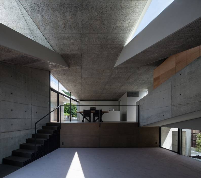 3つのレベルを持つ造成地に建てられた住宅。それぞれのレベルに置かれたボリュームを一枚のプレートで覆うように確保された居住空間となっている。敷地の持つ高低差をそのまま内部に取り込んだスキップフロアによるプランとなっている。