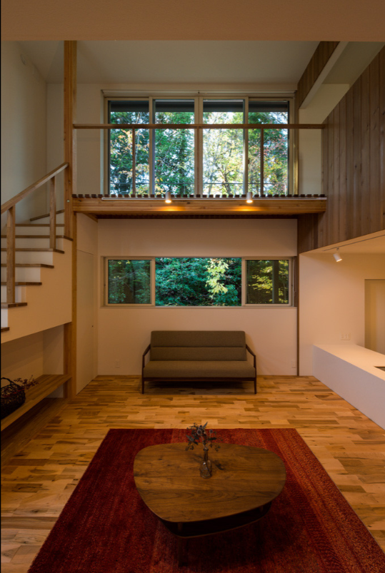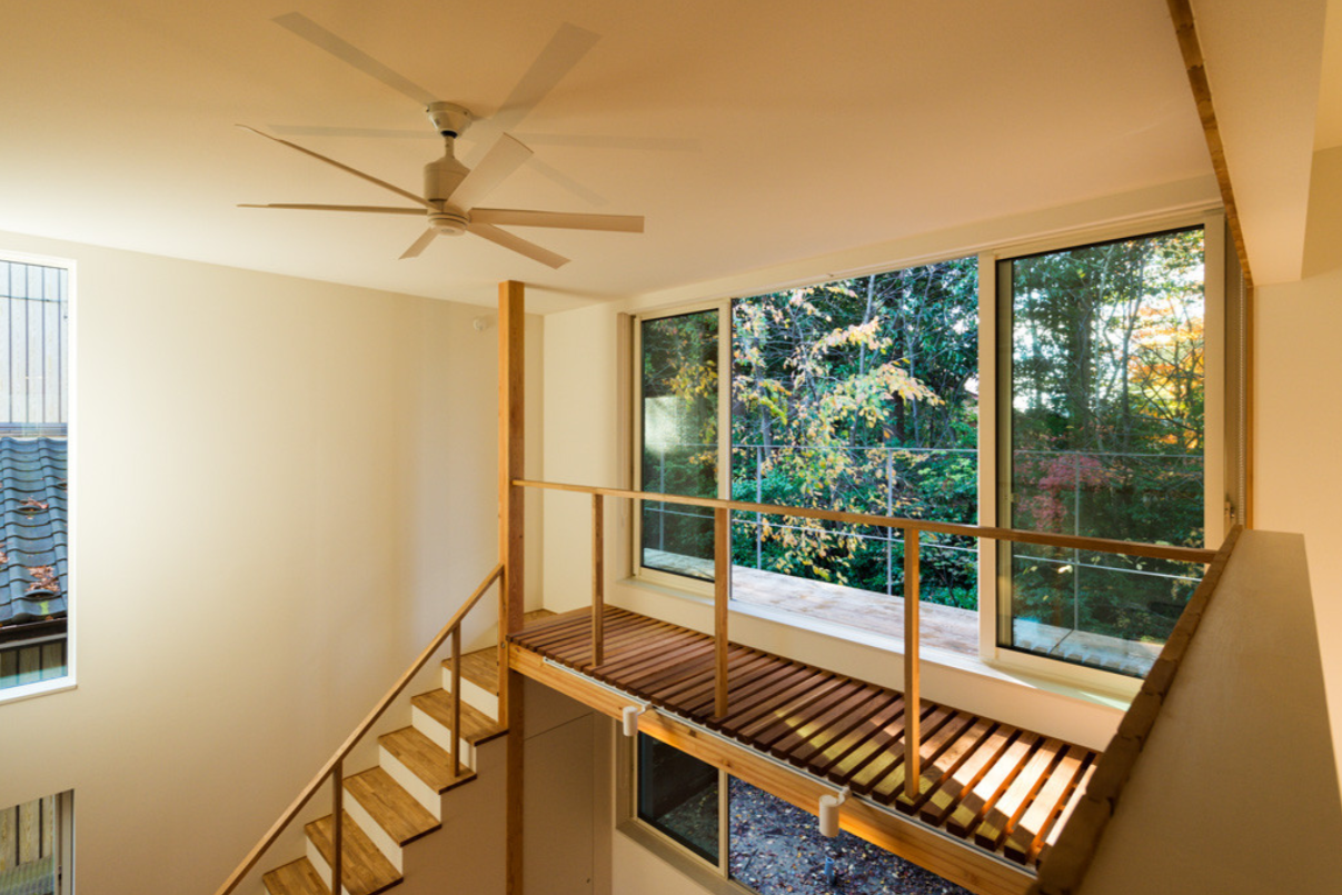 外とつながる、大きな吹き抜けと二つのベランダ。表からは、小高い山々が望め、裏手は一面、緑で覆われていおり、四季折々の変化を感じながらの暮らしが満喫できる環境です。