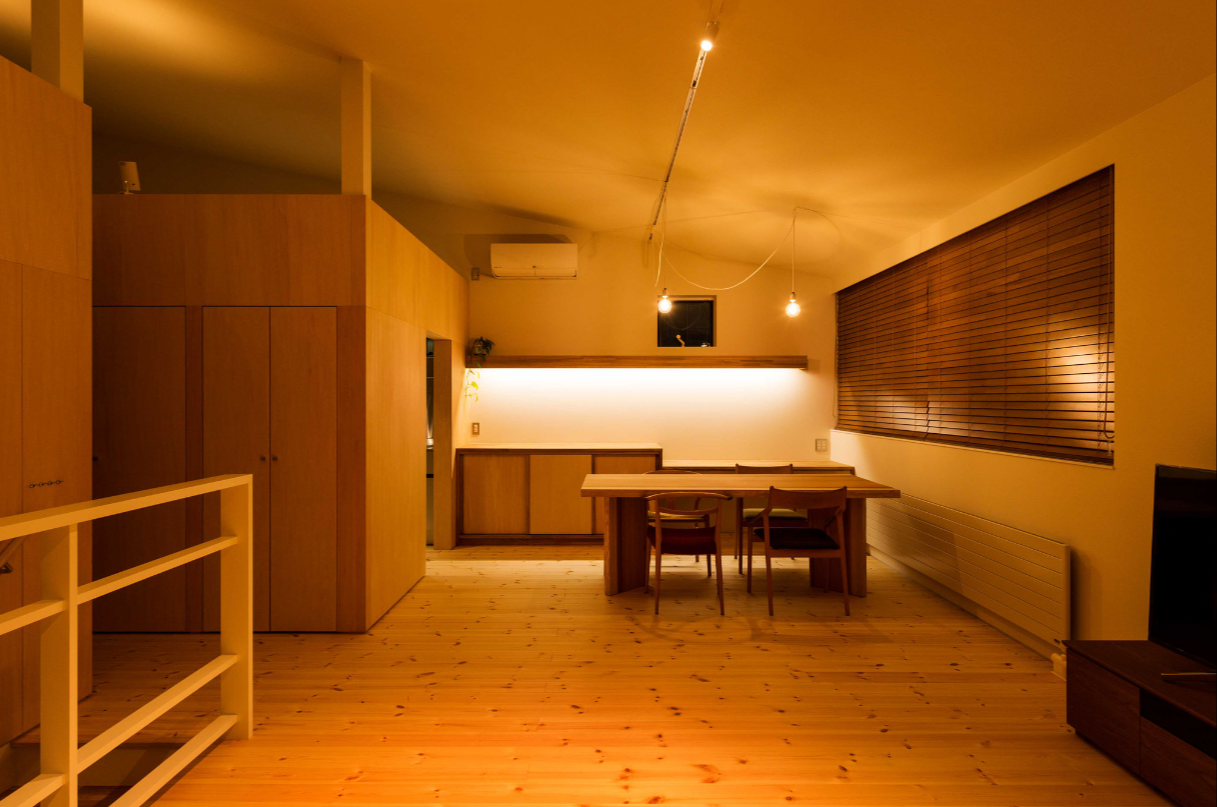 キッチン、寝室、W.I.Cを箱の中に納め、入れ子状に配置することで、隅から隅まで一望できる、開放的で変化に富んだ空間が出来ました。(居間は14帖の広さを見通すことが出来ます)