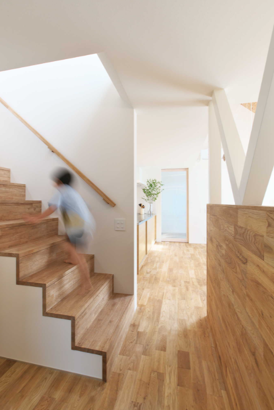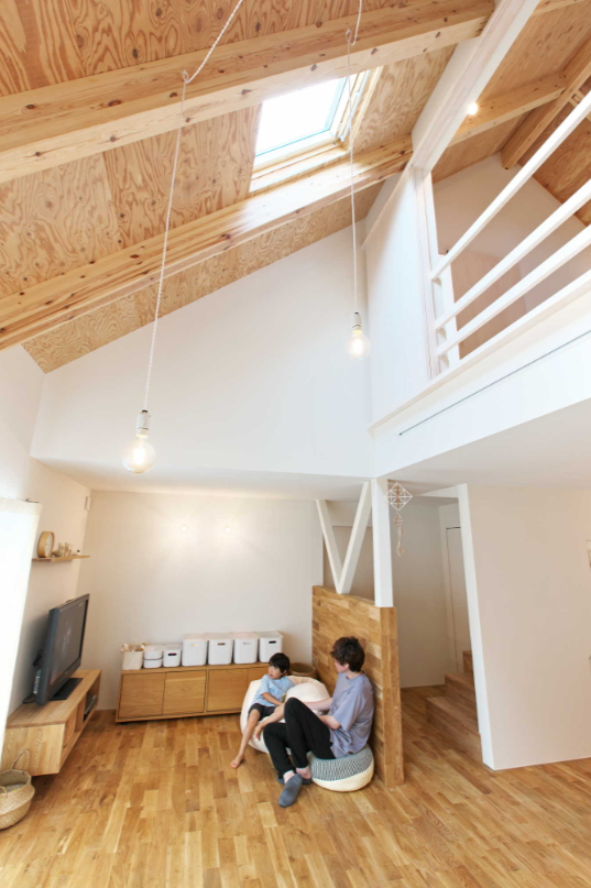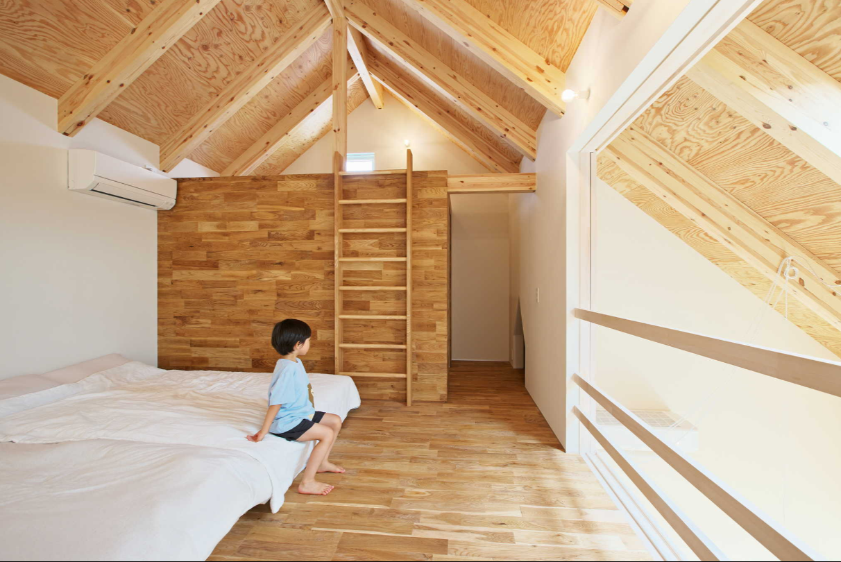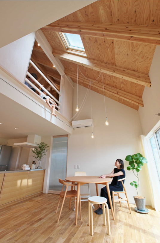 三角屋根でつながる1階と2階。開いたり閉じたりできる個室。個室から真横に見通す天窓。屋根からひょっこりと顔を出すようなバルコニー。