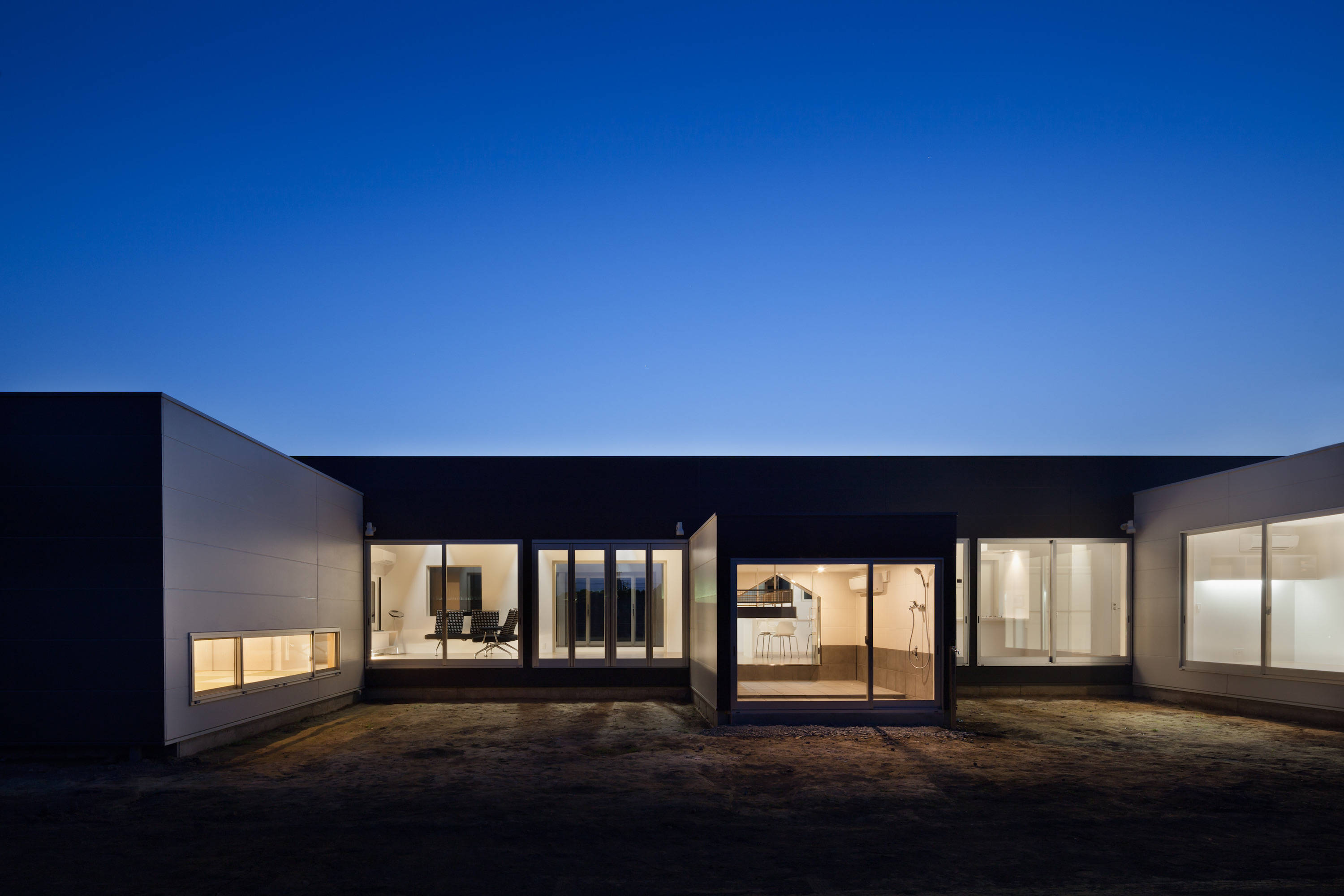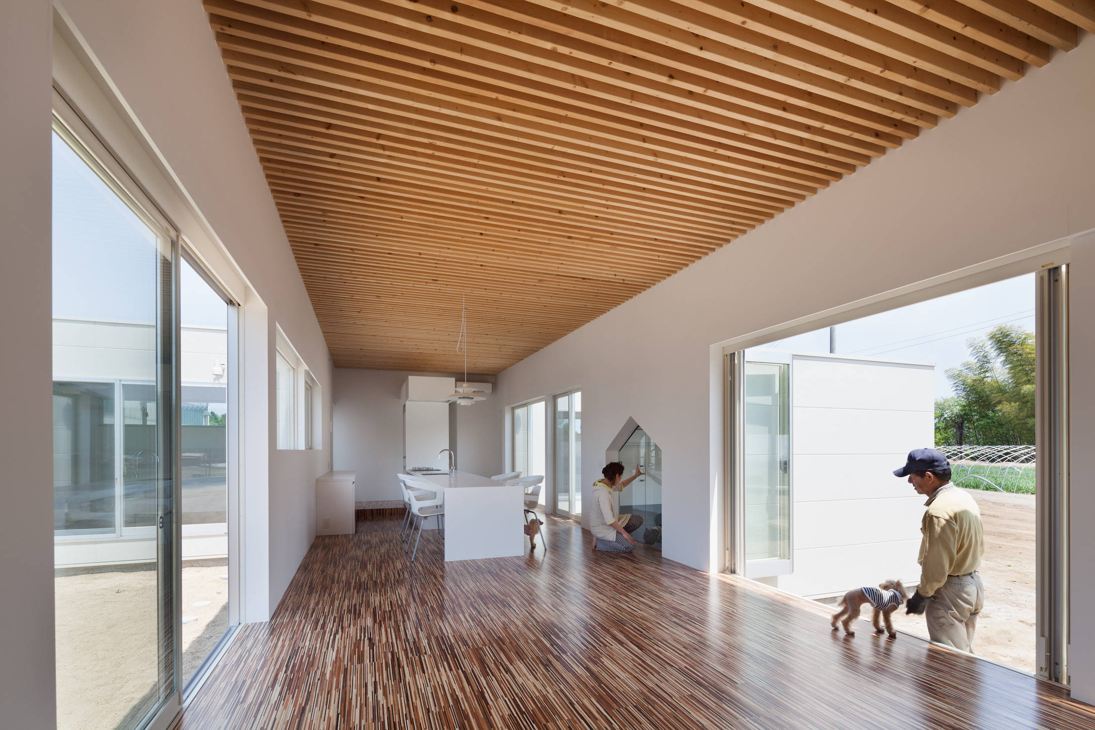 個室の間には庭が生まれ、畑と住宅をつなぎます。リビングからは個室に挟まれた庭を介して畑の様子が見え、畑からは半分開かれたリビングが垣間見れます。