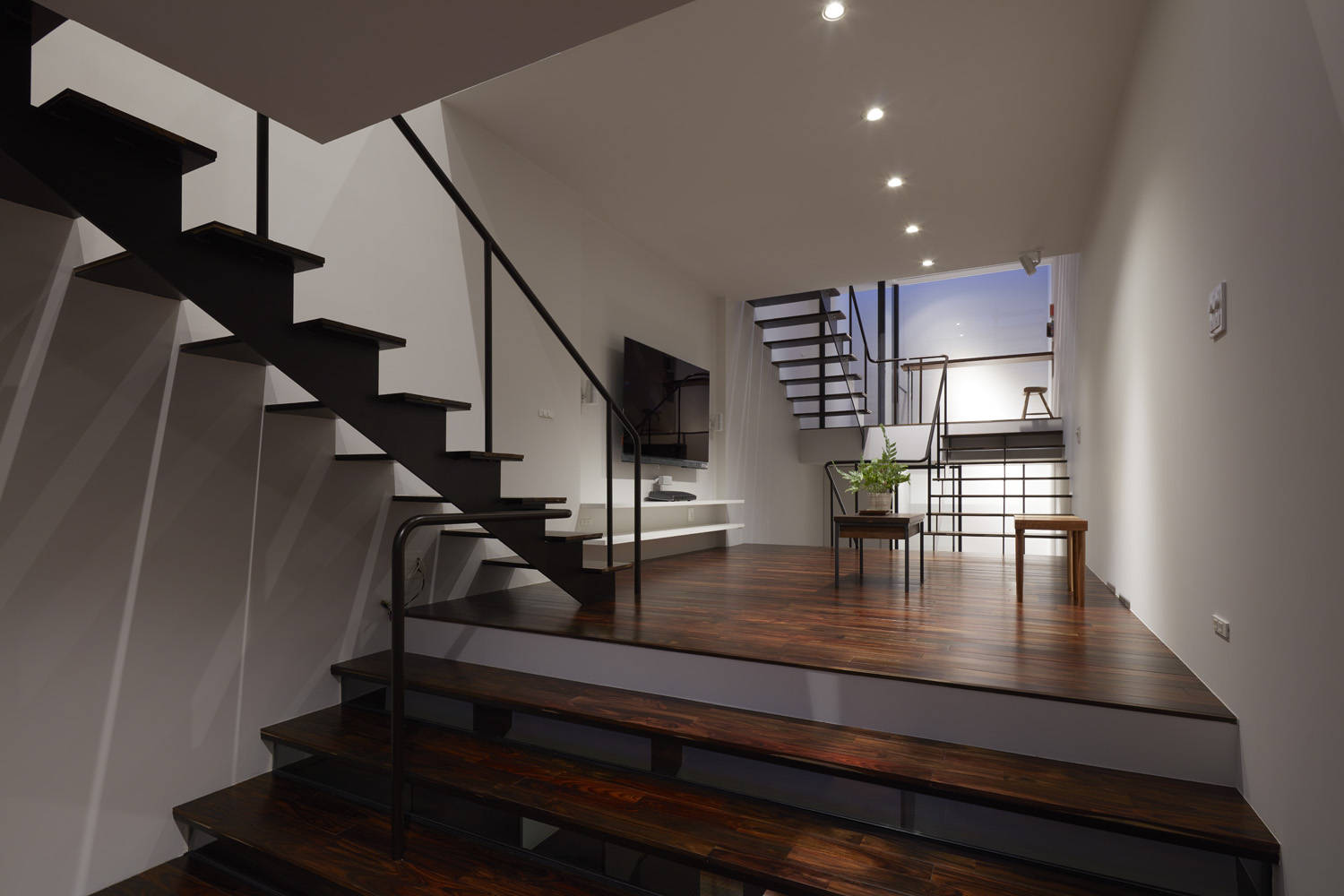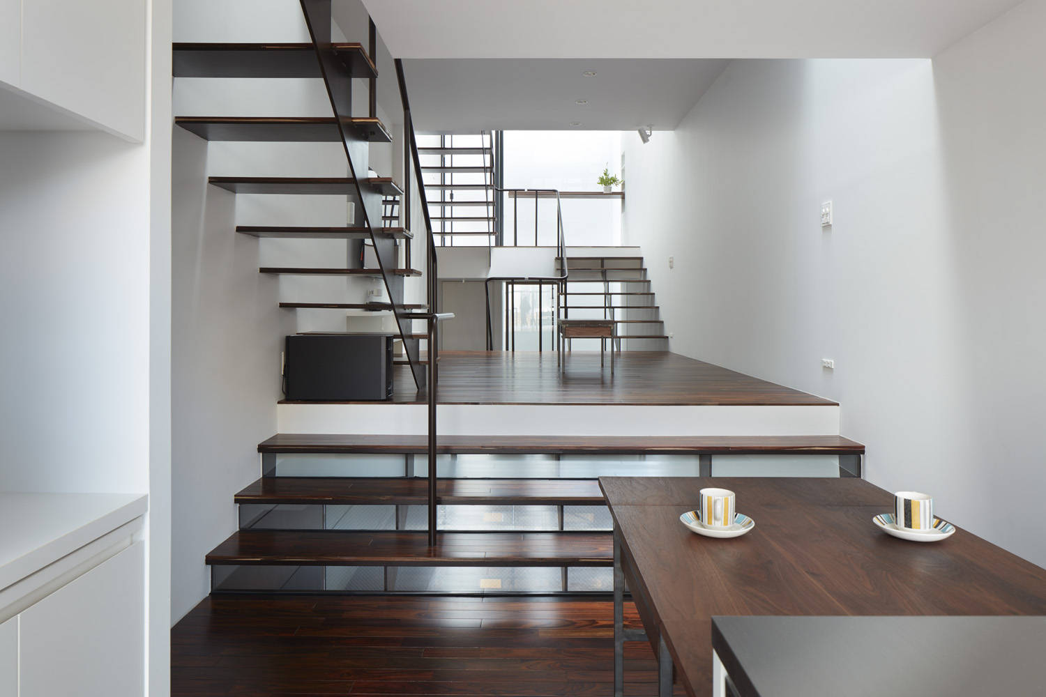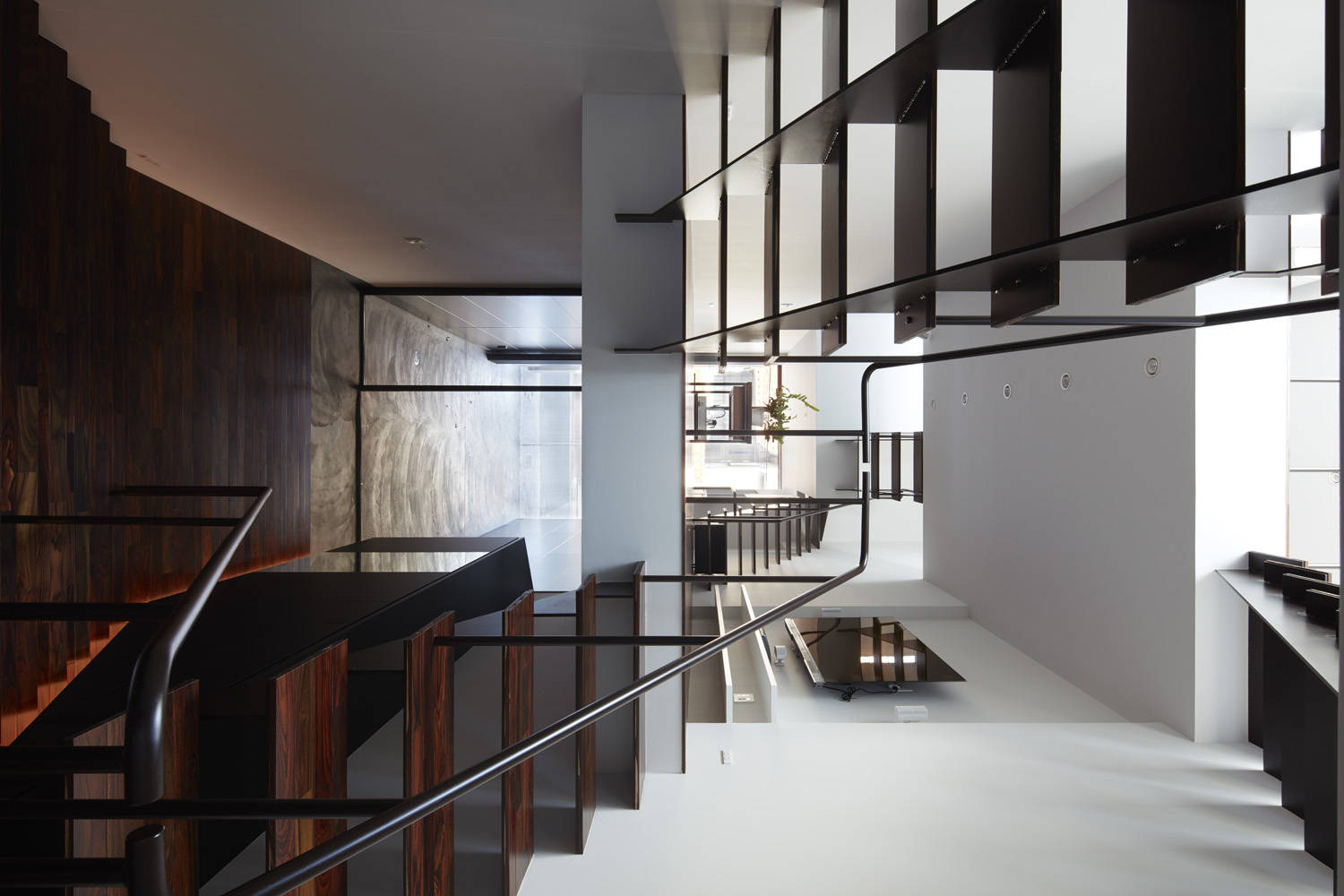 敷地の特徴を踏まえ奥行の視線を生かすよう計画した内部の構成は、分節されたフロアがスキップフロア状に地下1階地上3階と重層することで視線が様々な方向に抜けるよう工夫しています。