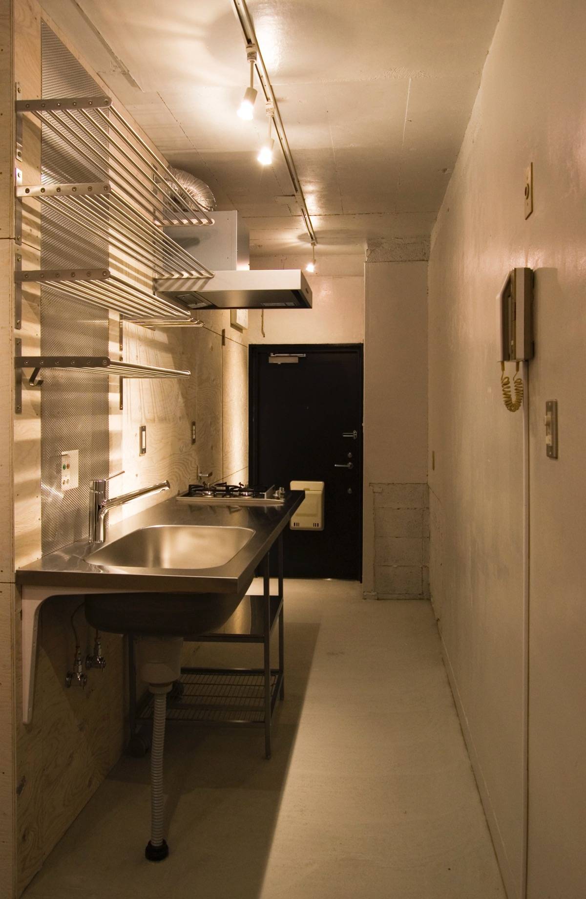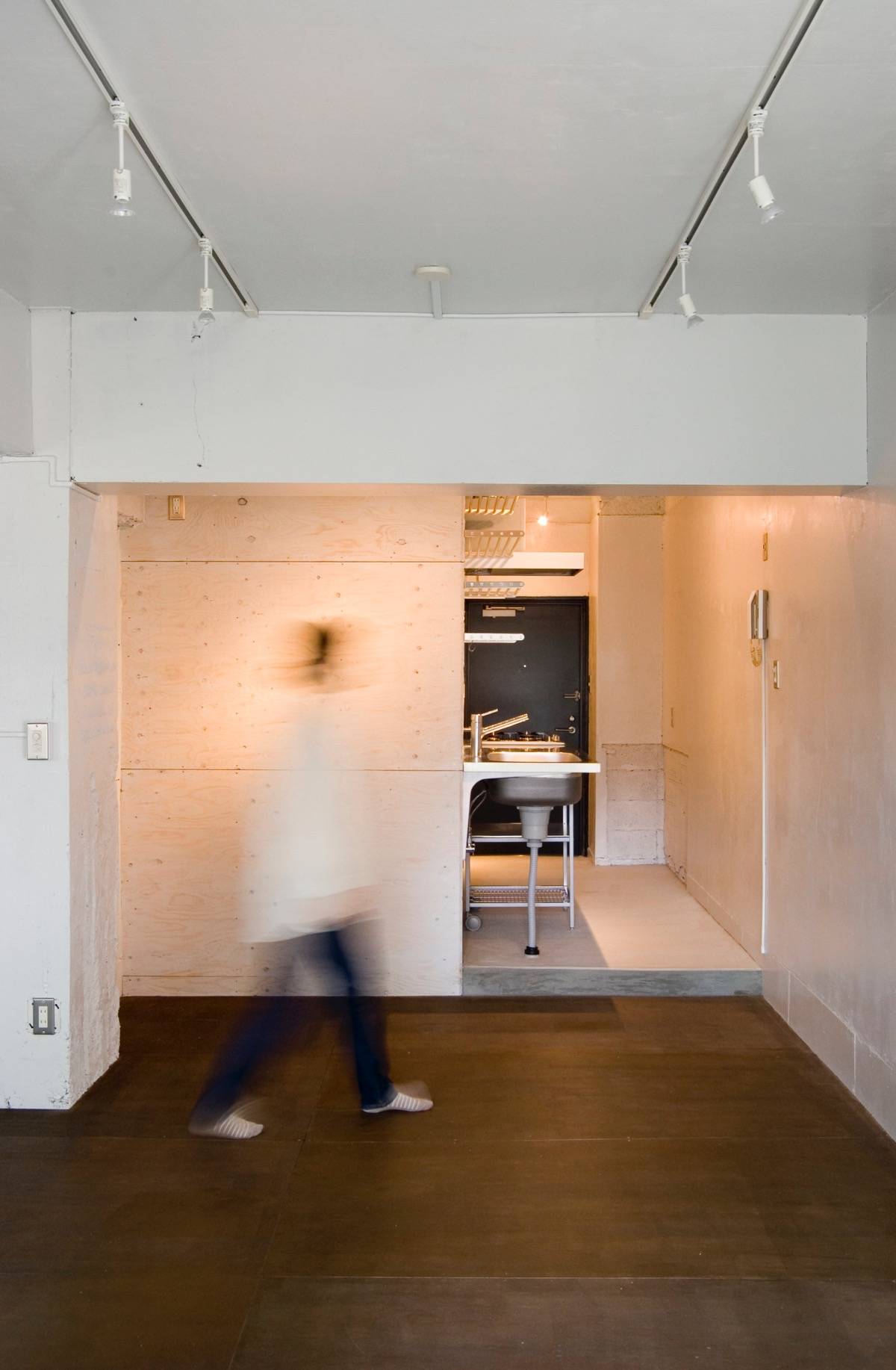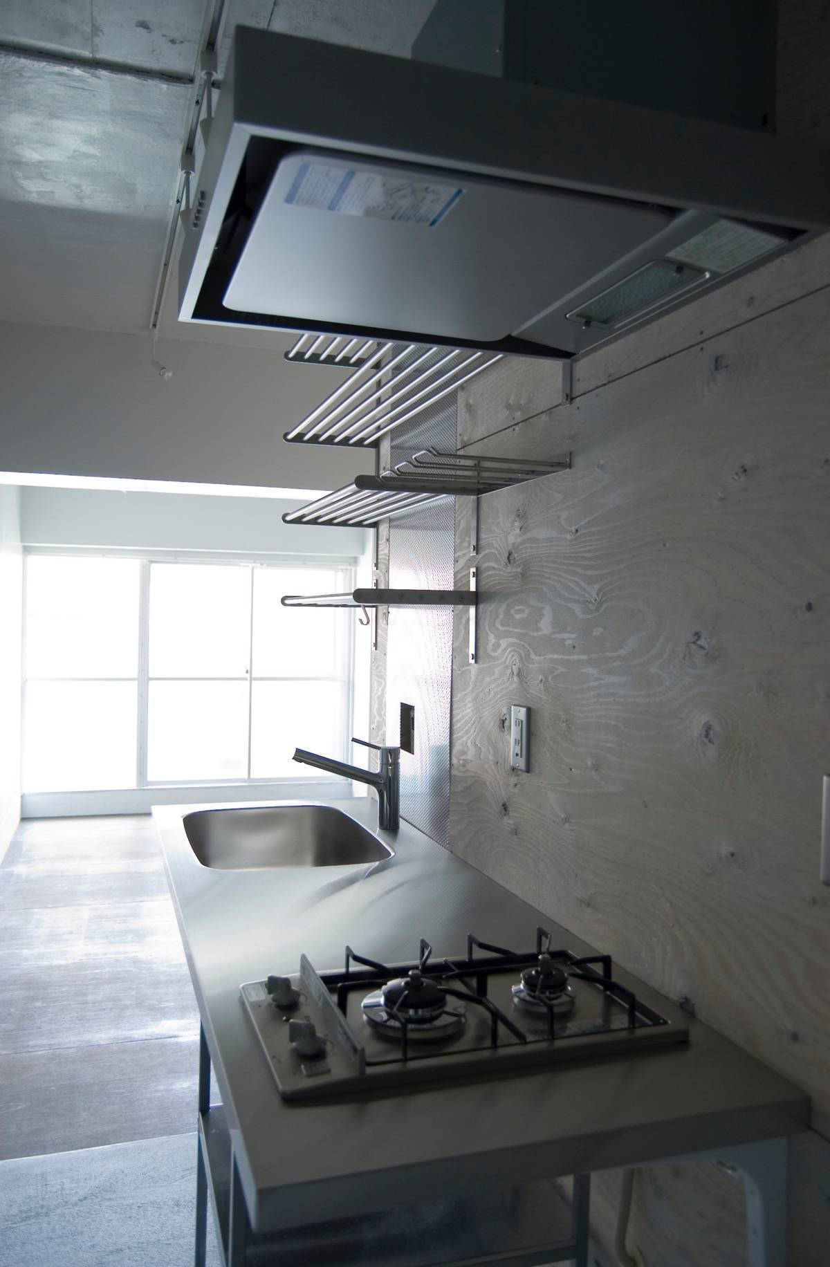 床はラワンベニヤ、新設の壁は針葉樹合板、キッチンはステンレスの天板一枚のみでしつらえました。