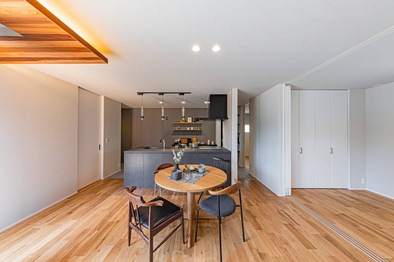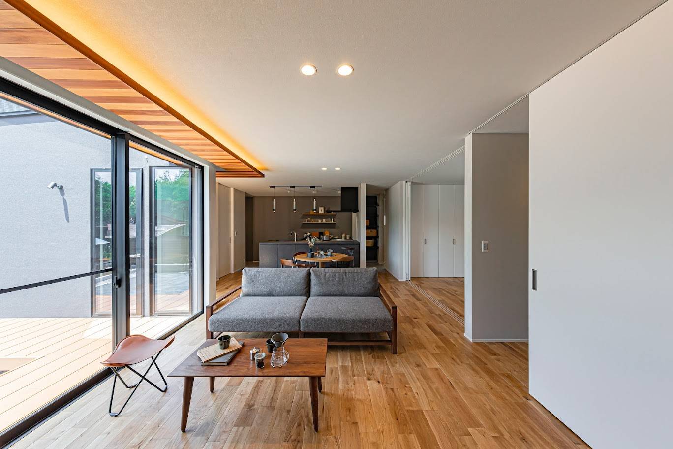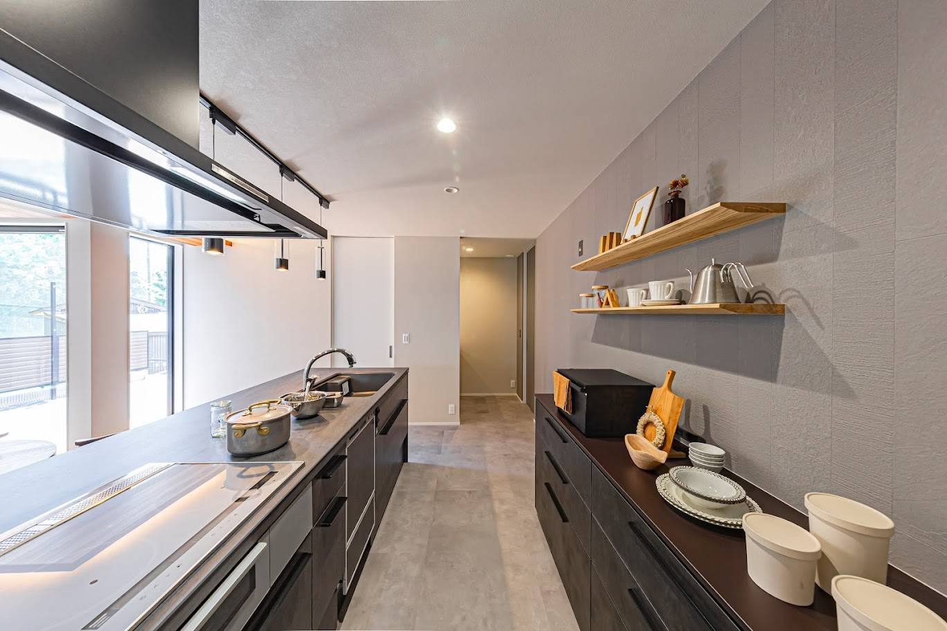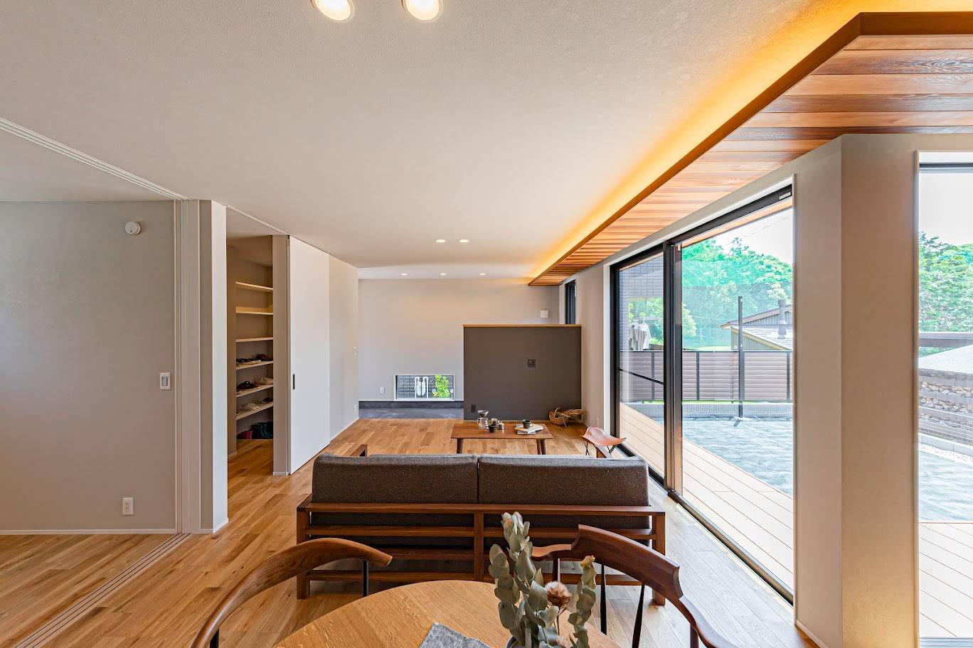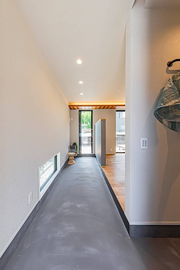 敷地に佇んだ際に感じた南東への解放感に着想を得て、強いご要望である通り土間のある住まいというフレーズから「抜ける」と言う所作をテーマにした住まい。玄関へ入ると目に飛び込んでくる通り土間の先に続く外部空間への高揚感。また室内からは窓先に視線が抜けて空や足元の植物などを眺めた時の安心感。「抜ける」と言う所作が豊かに感じられる家。抜けた先にある風景が日々の日常を魅力的にしてくれる暮らし方をご提案した住まいです。