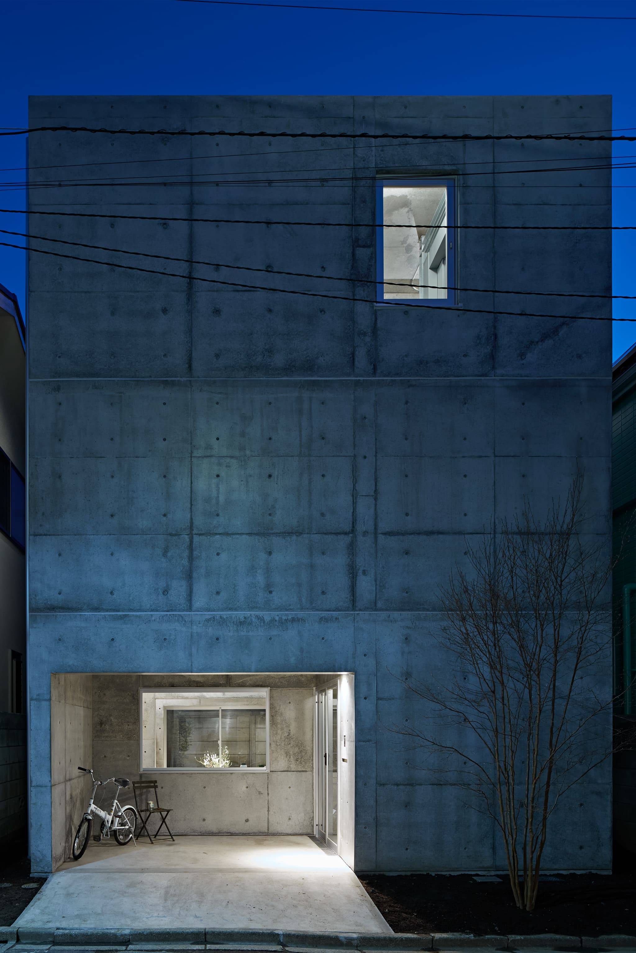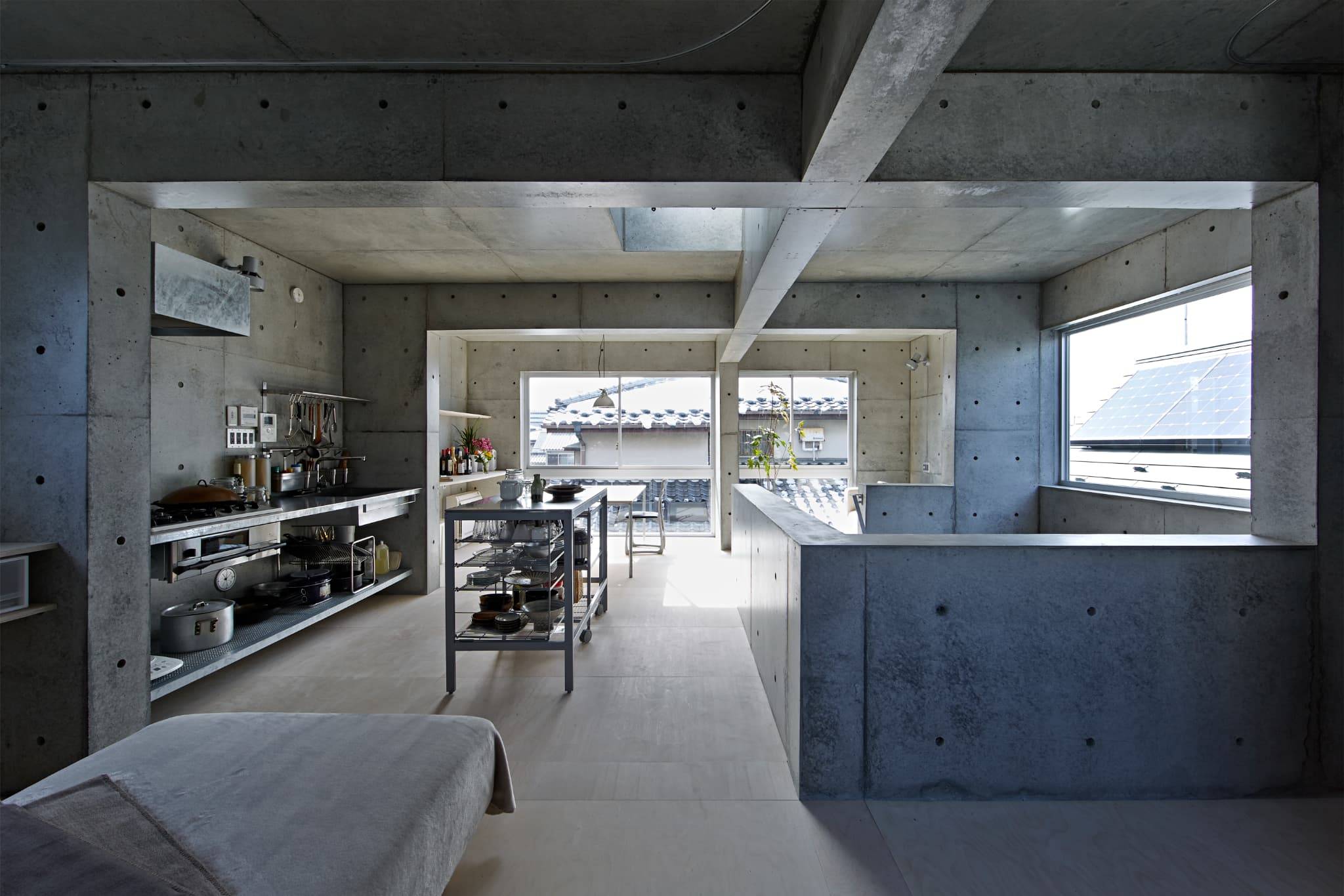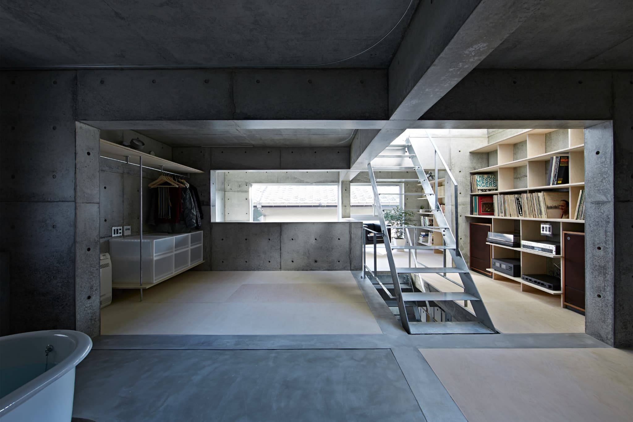 東京都郊外の住宅地に建つキュービックな住宅。コンクリート打放し仕上げを主体とし、構造躯体を露わしました。袖壁と梁型で構成される構造フレーム(=リブ)により、内部空間は各フロア6つのエリアにゆるやかに領域分けされます。