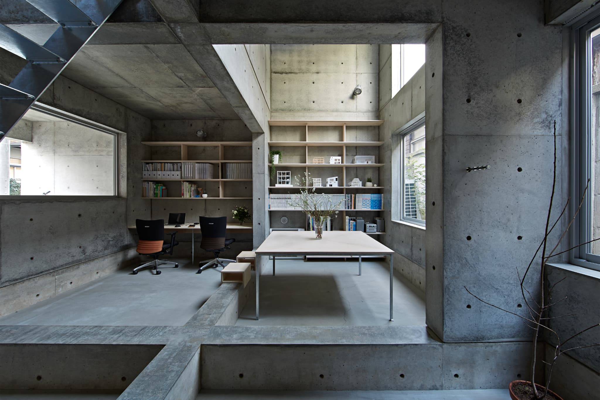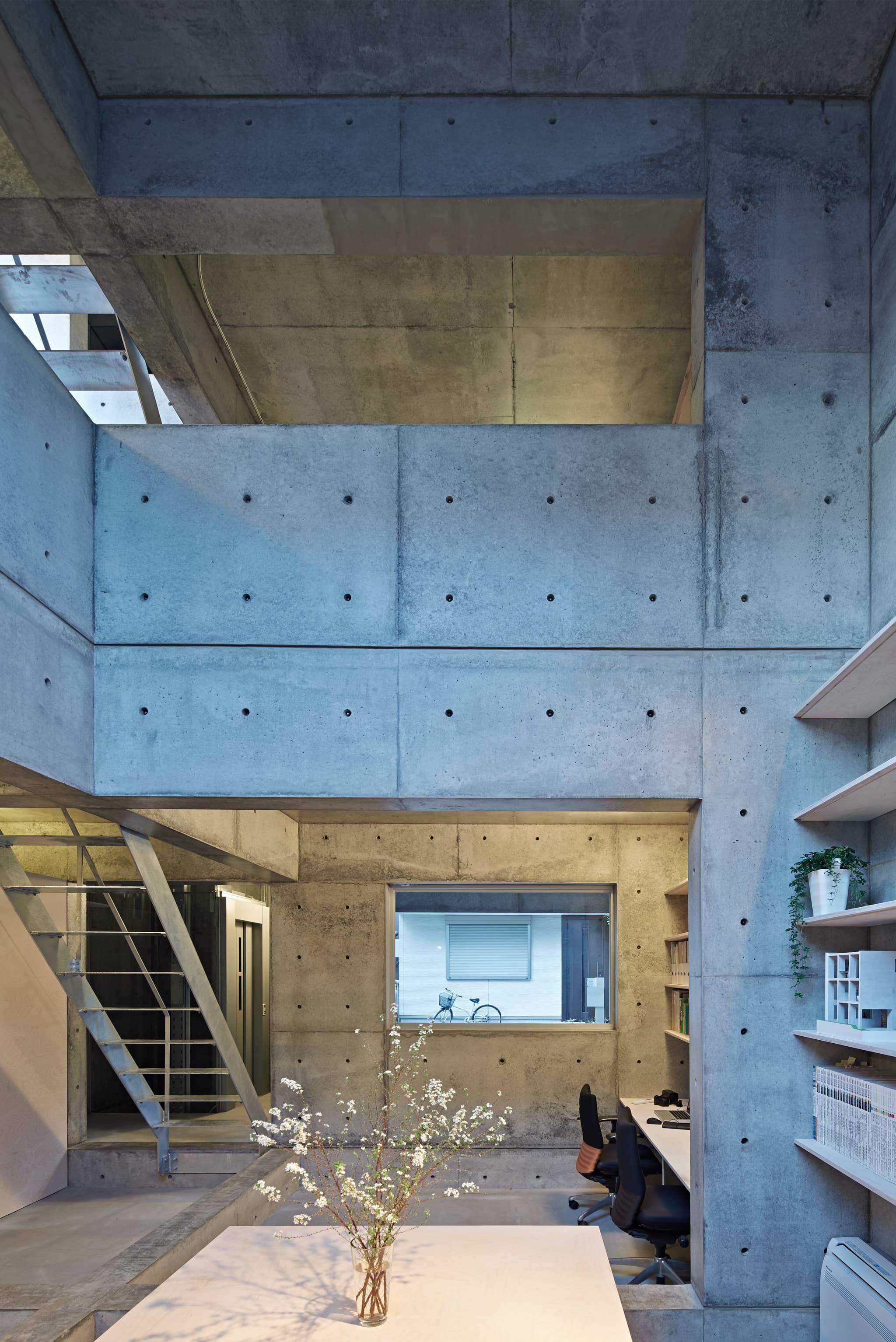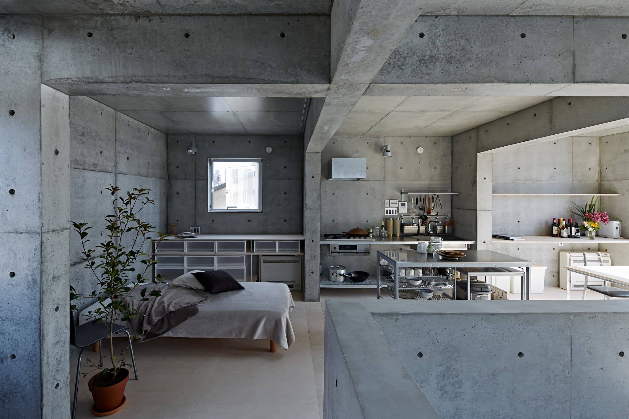 東京都郊外の住宅地に建つキュービックな住宅。コンクリート打放し仕上げを主体とし、構造躯体を露わしました。袖壁と梁型で構成される構造フレーム(=リブ)により、内部空間は各フロア6つのエリアにゆるやかに領域分けされます。