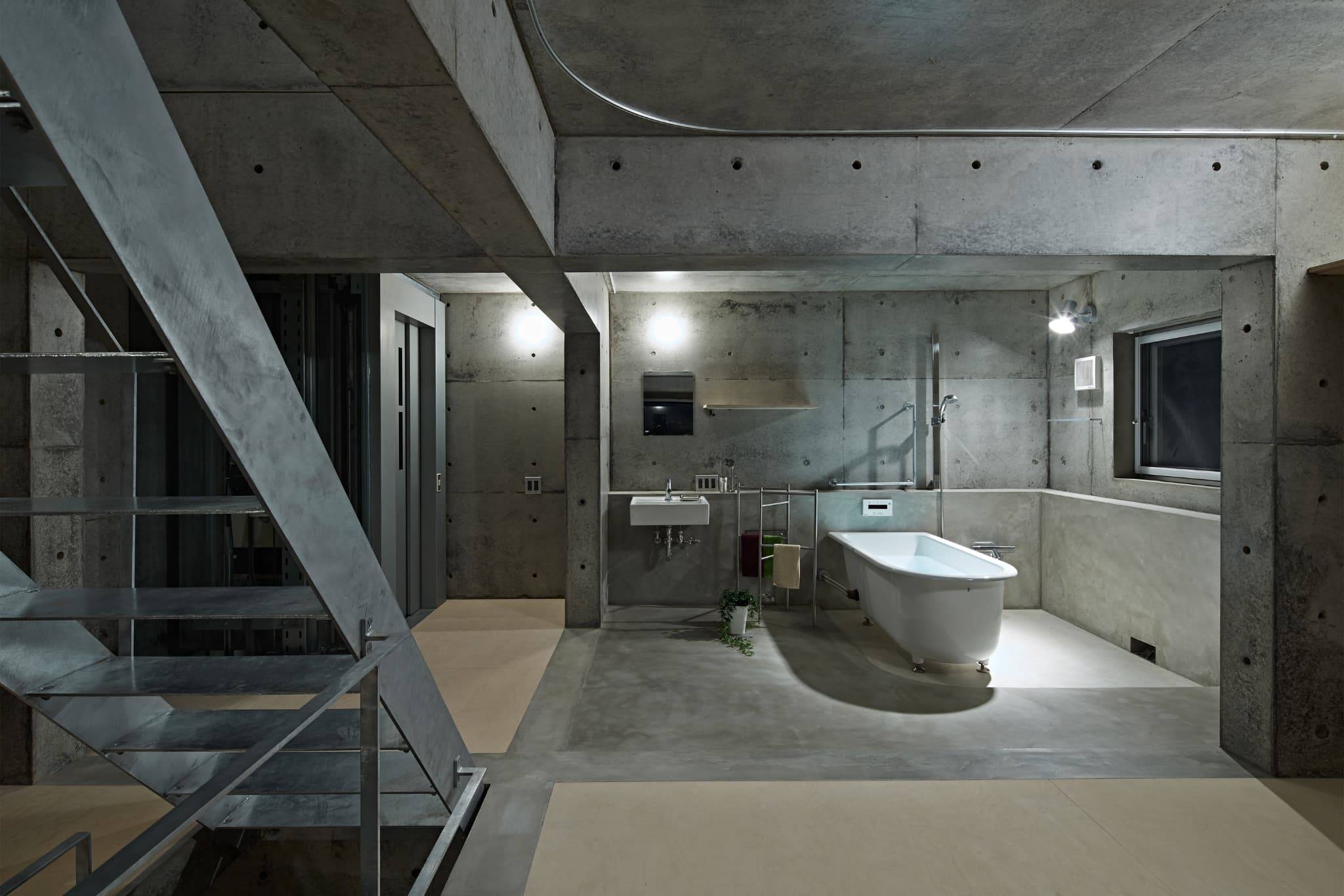 また、バスタブや便器はあたかもインテリアの一部のようにしつらえています。各階にある吹抜けは煙突効果をもたらし、夏季の熱気を最上階のトップライトから排出します。
