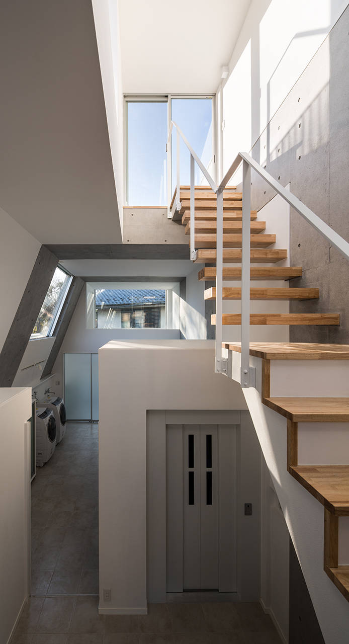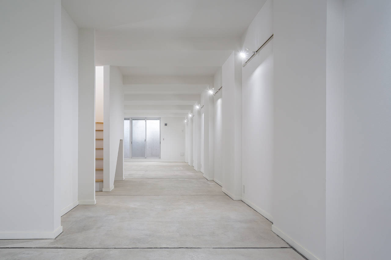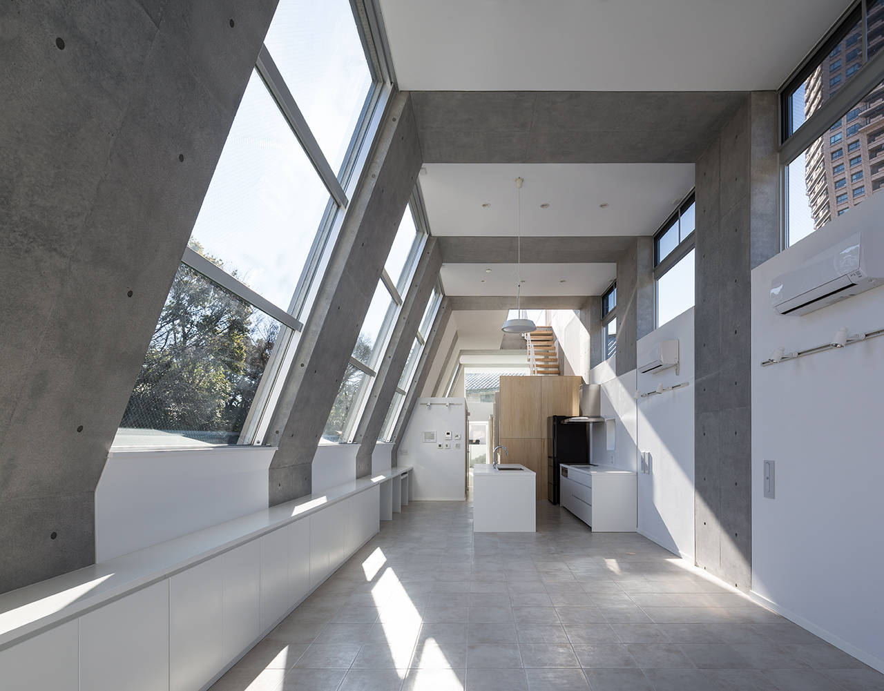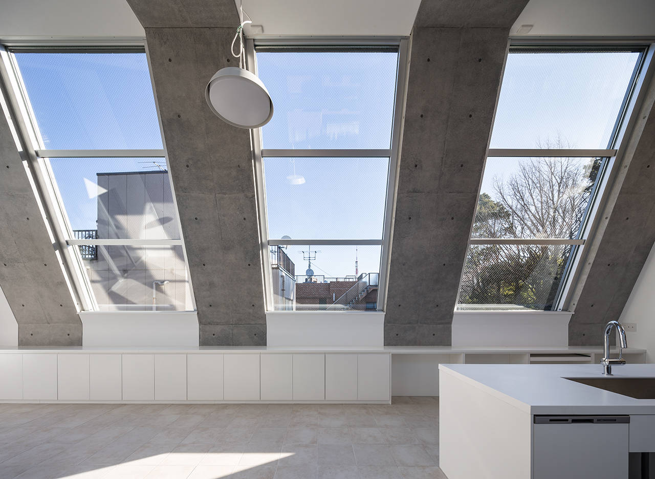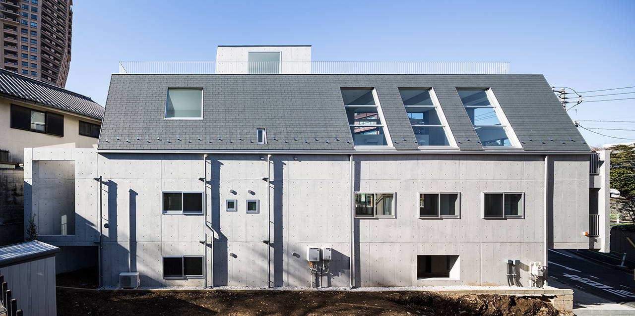 麻布に建つ大きな住宅です。鉄筋コンクリート造の門型フレームで全体を構成することで、空間の途中に構造的な壁や柱が必要なくなるため、間仕切を自由に設定できると共に、将来的にもライフスタイルに合わせて間仕切を変えることができます。門型フレーム(=構造体)の打放しコンクリートと、フレーム間の白い壁が交互に連続する様相から、ゼブラハウスと名付けました。