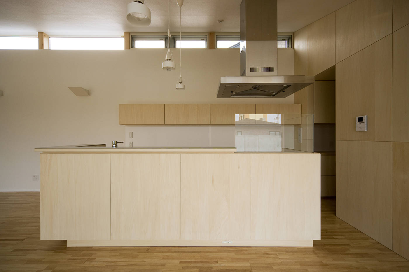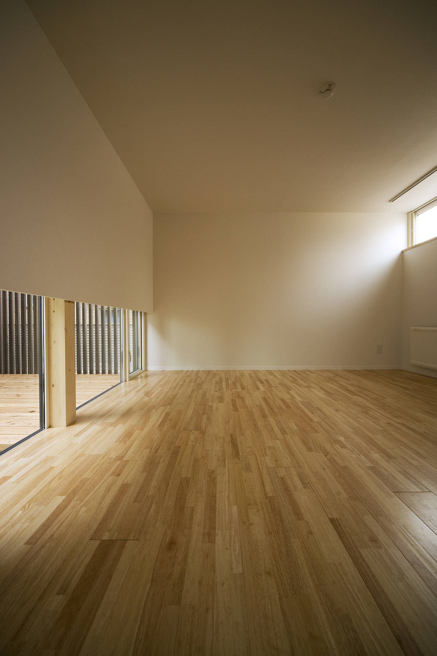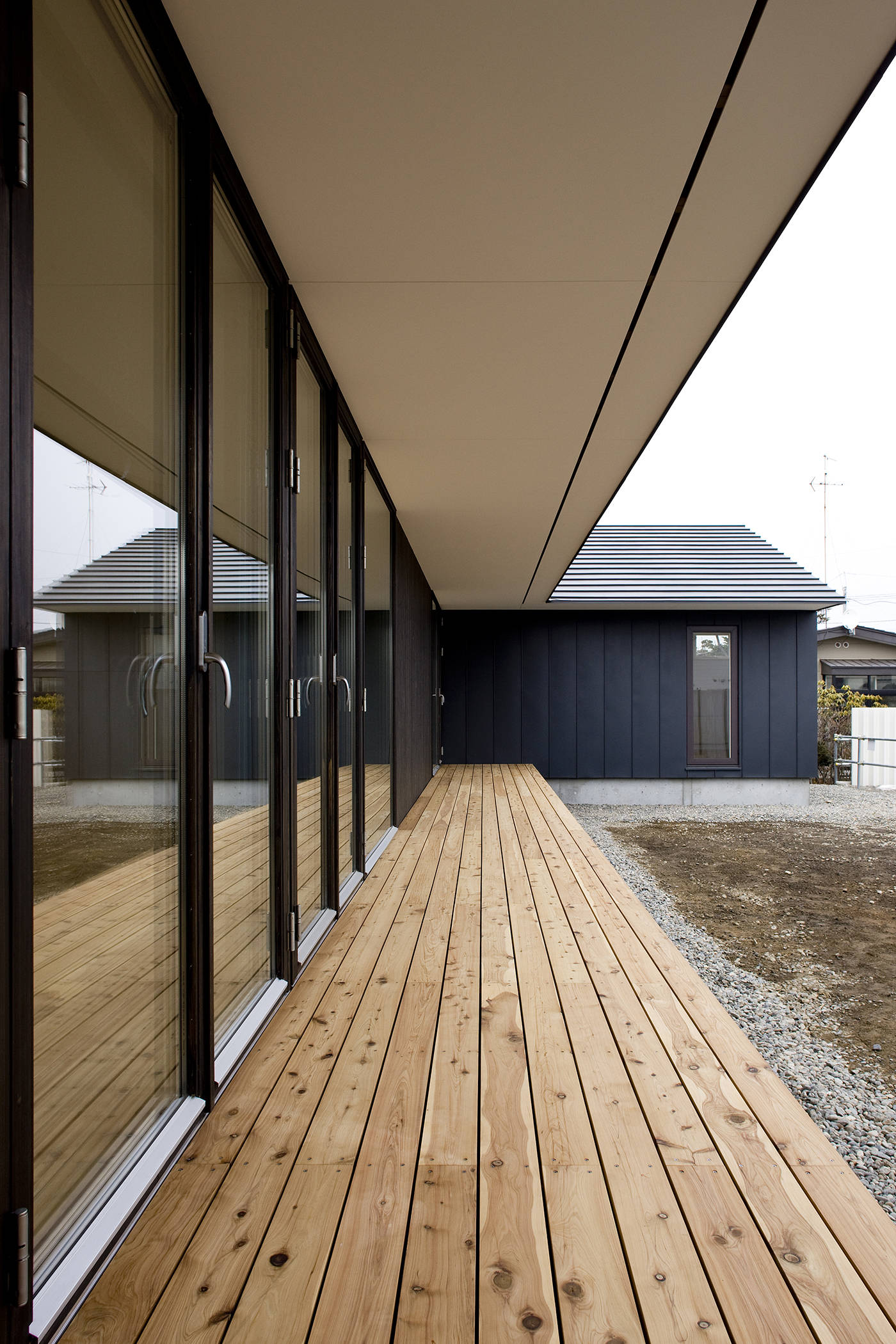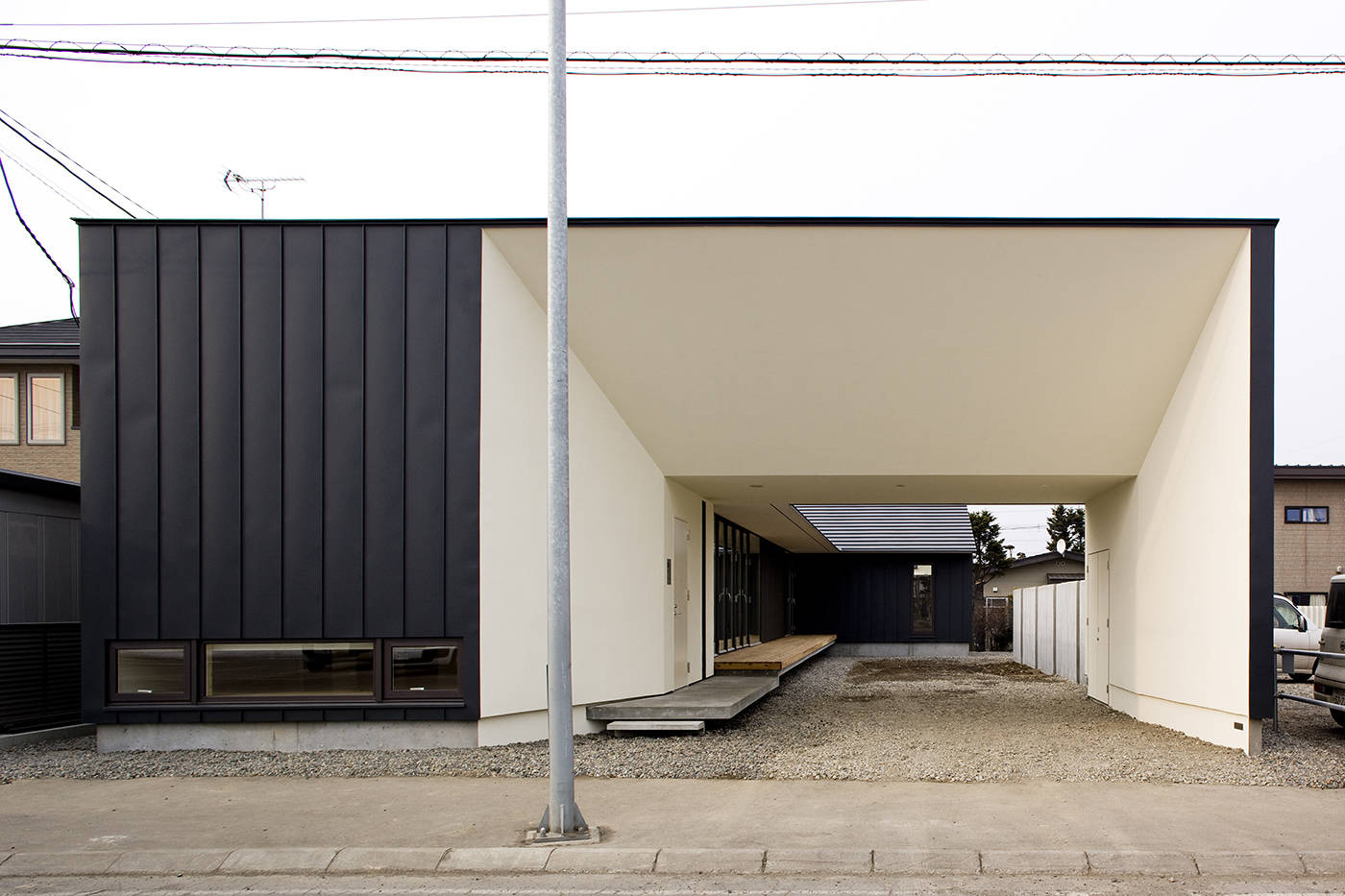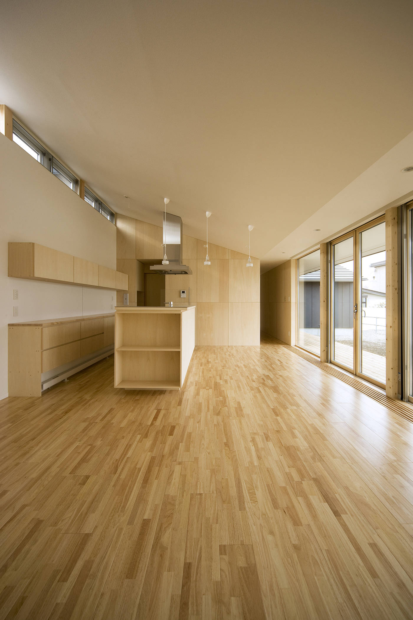約100坪というゆとりのある敷地を有効に利用した平屋とし、冬季間の積雪対策や周囲とのプライバシーの関係を考慮しながら、リビング・ダイニングというコモンスペースに面した中庭を設けることにより、建物内部からテラスを介してつながる「家族のための庭」を創りだしました。