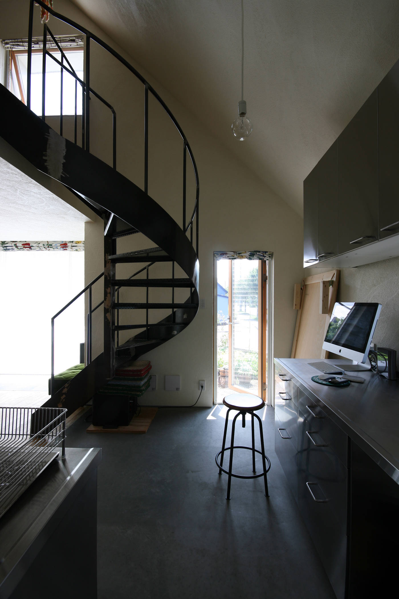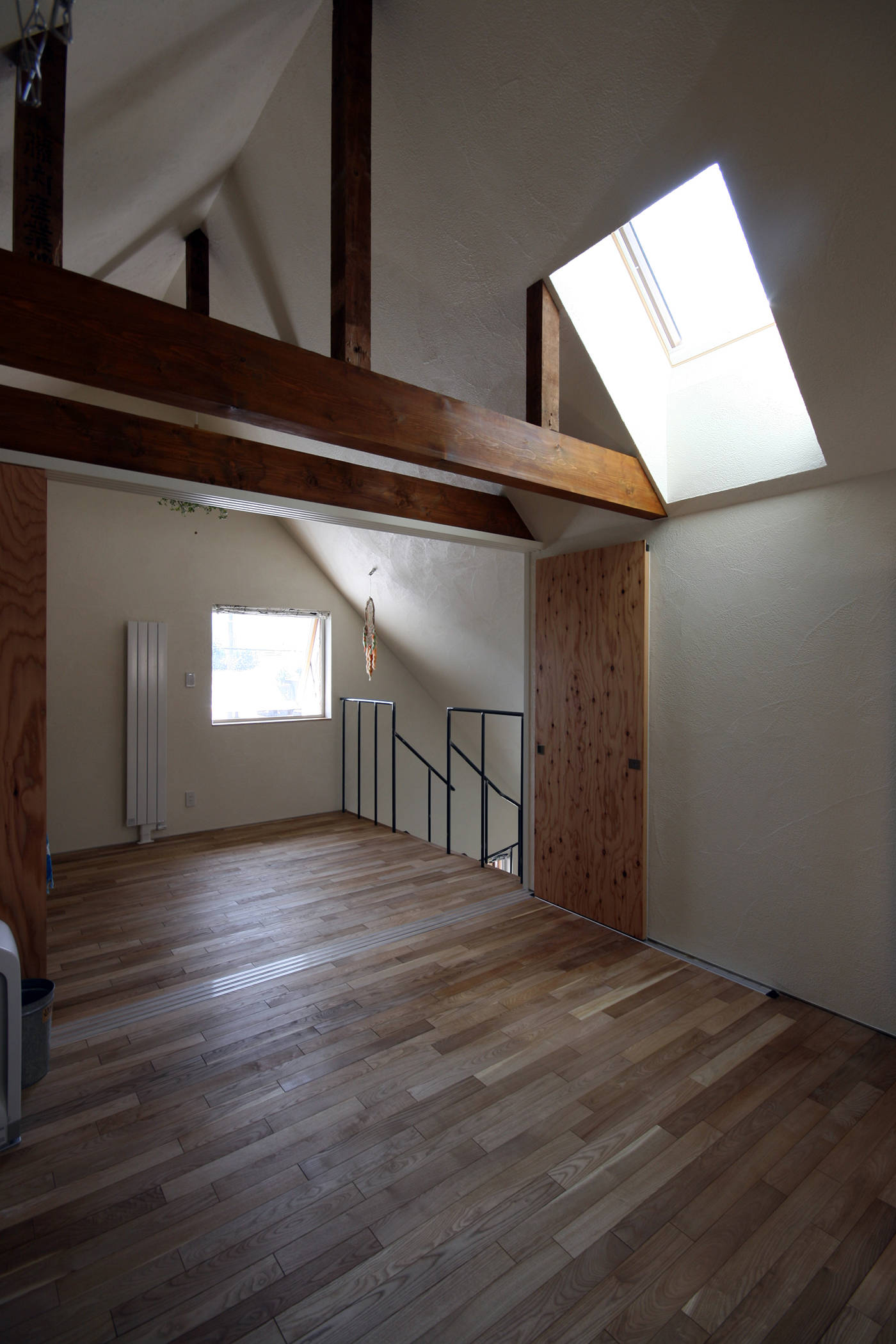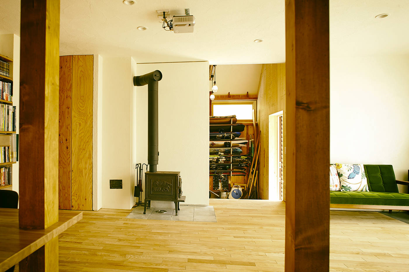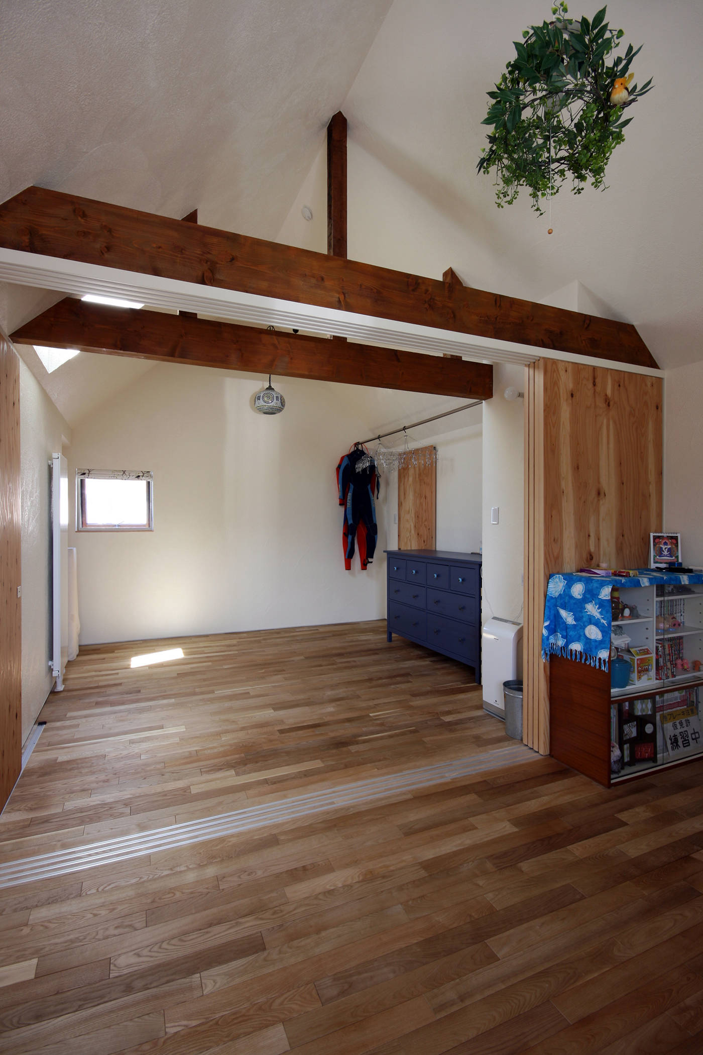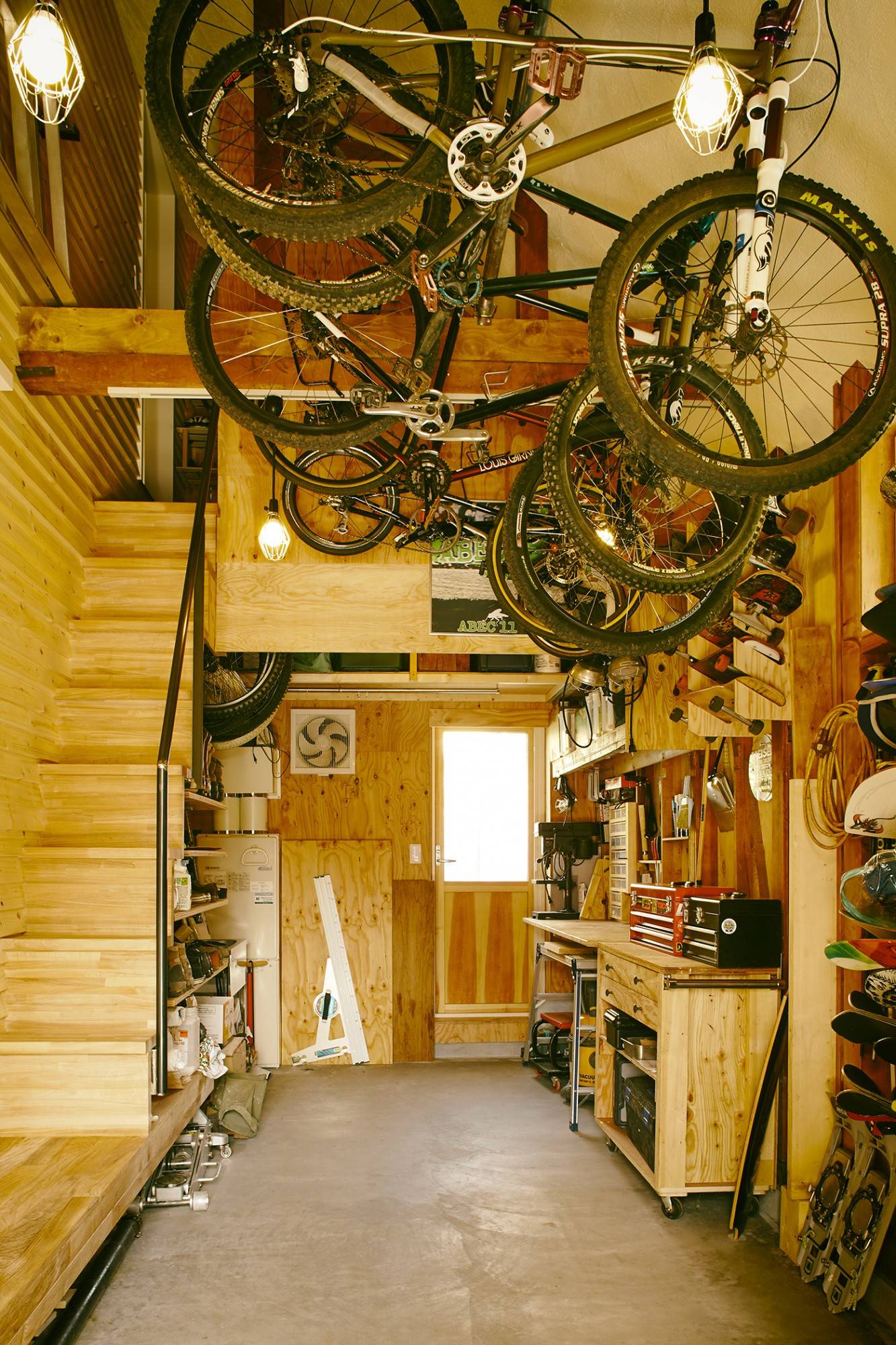 2階は小屋裏を生かした広がりのあるプライベート空間となり、1階の大きな土間空間は趣味の道具の手入れや作業場として機能します。