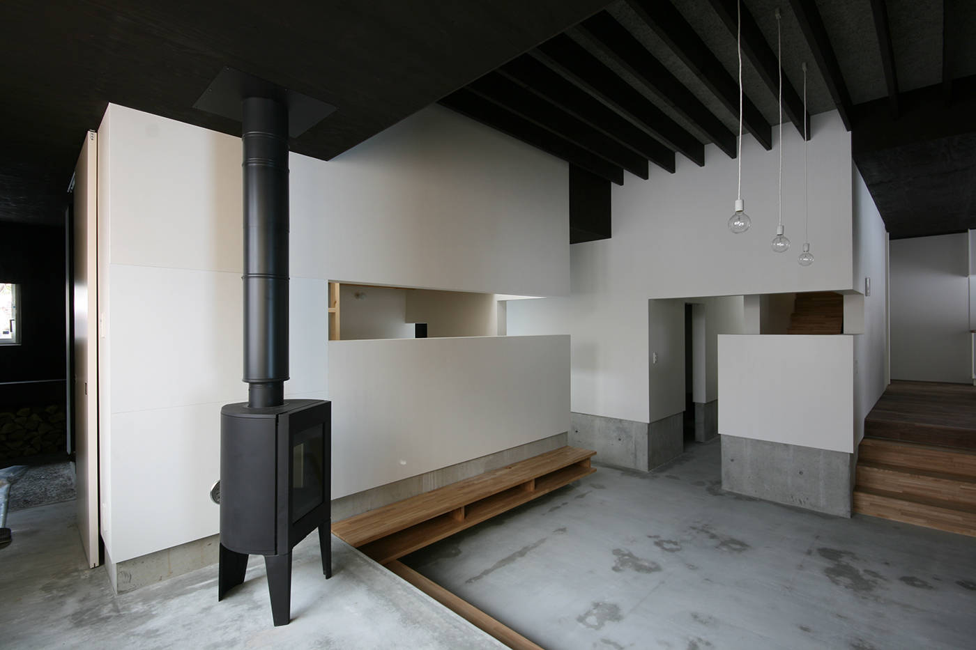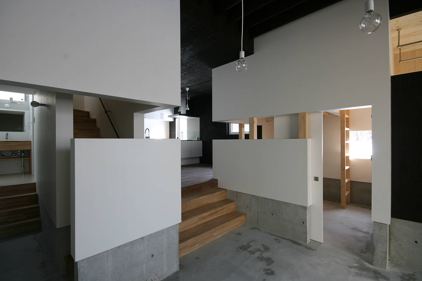 スクエアな平屋空間に、3つのプライベートなヴォリュームを挿入することによって、様々な居場所を持つ、回遊できる土間空間を生み出しました。