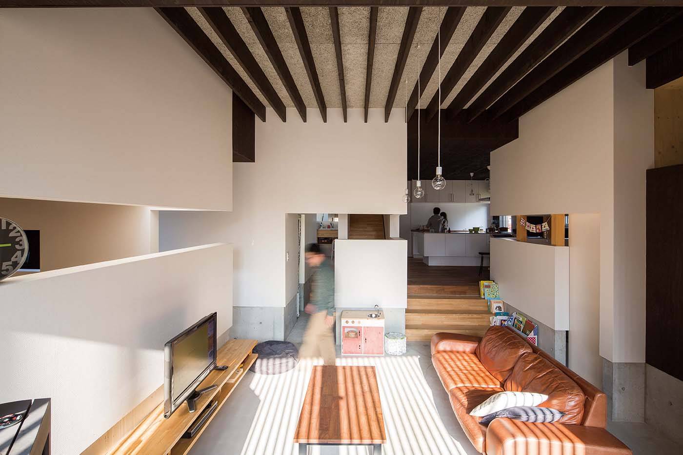 スリットの開口は、床のレベル差によって各々の空間の繋がり方に変化を持たせる役割を持ちます。