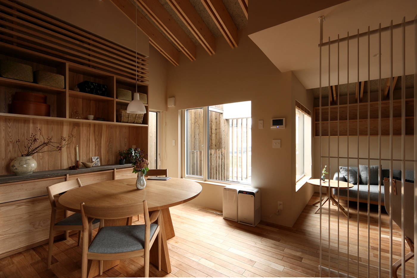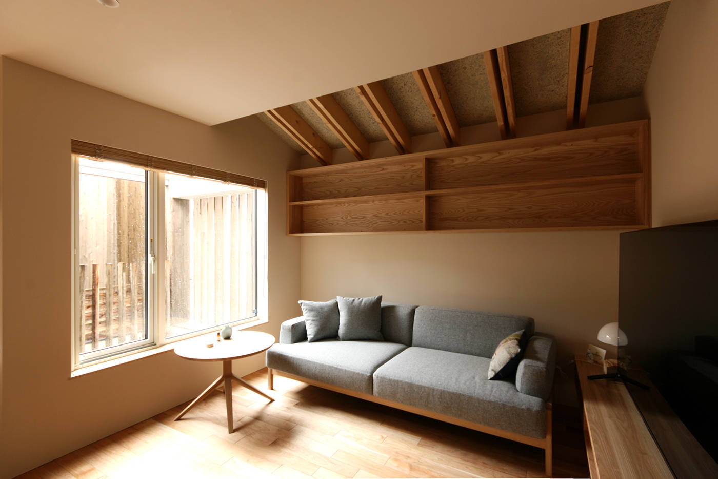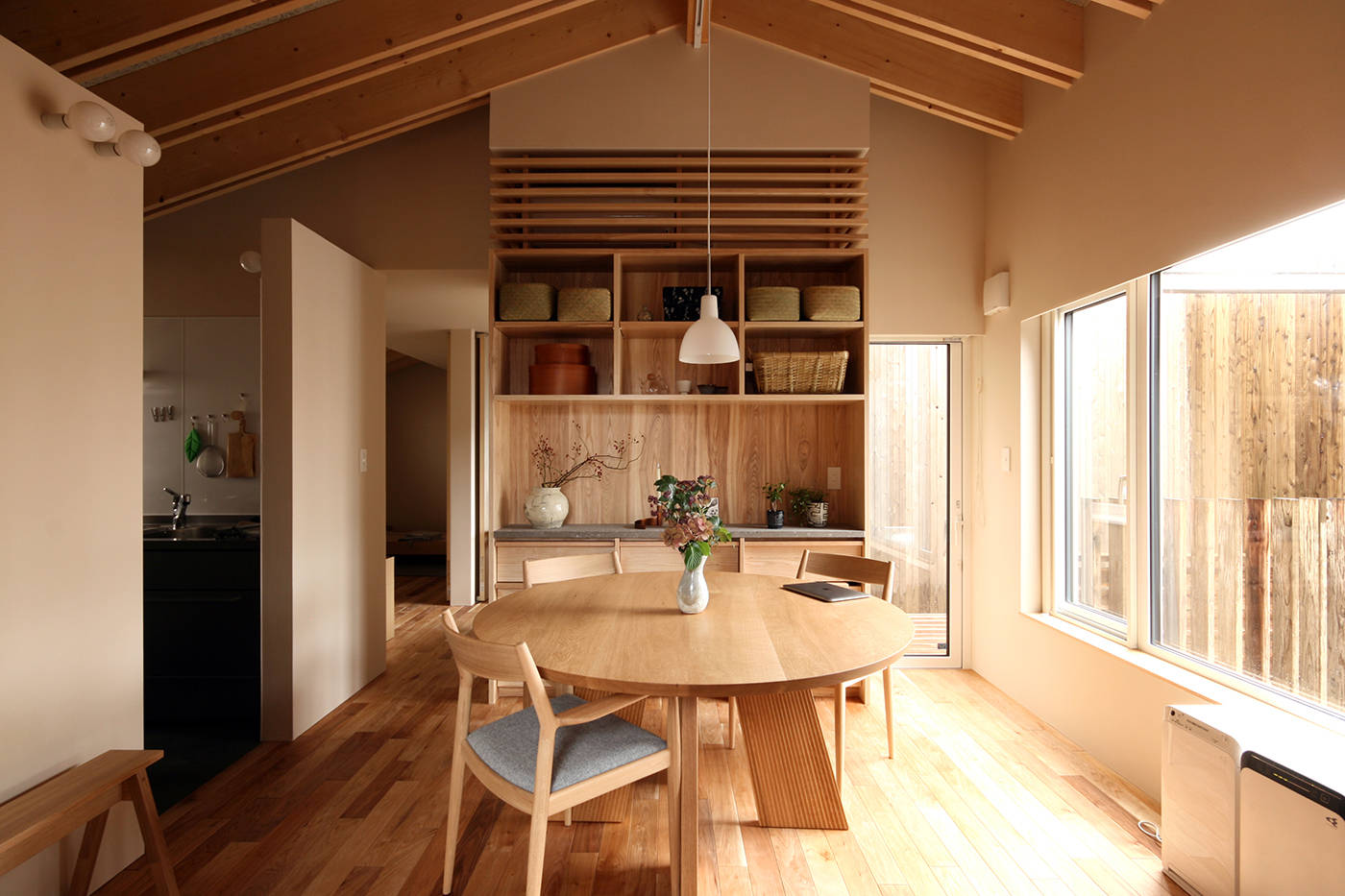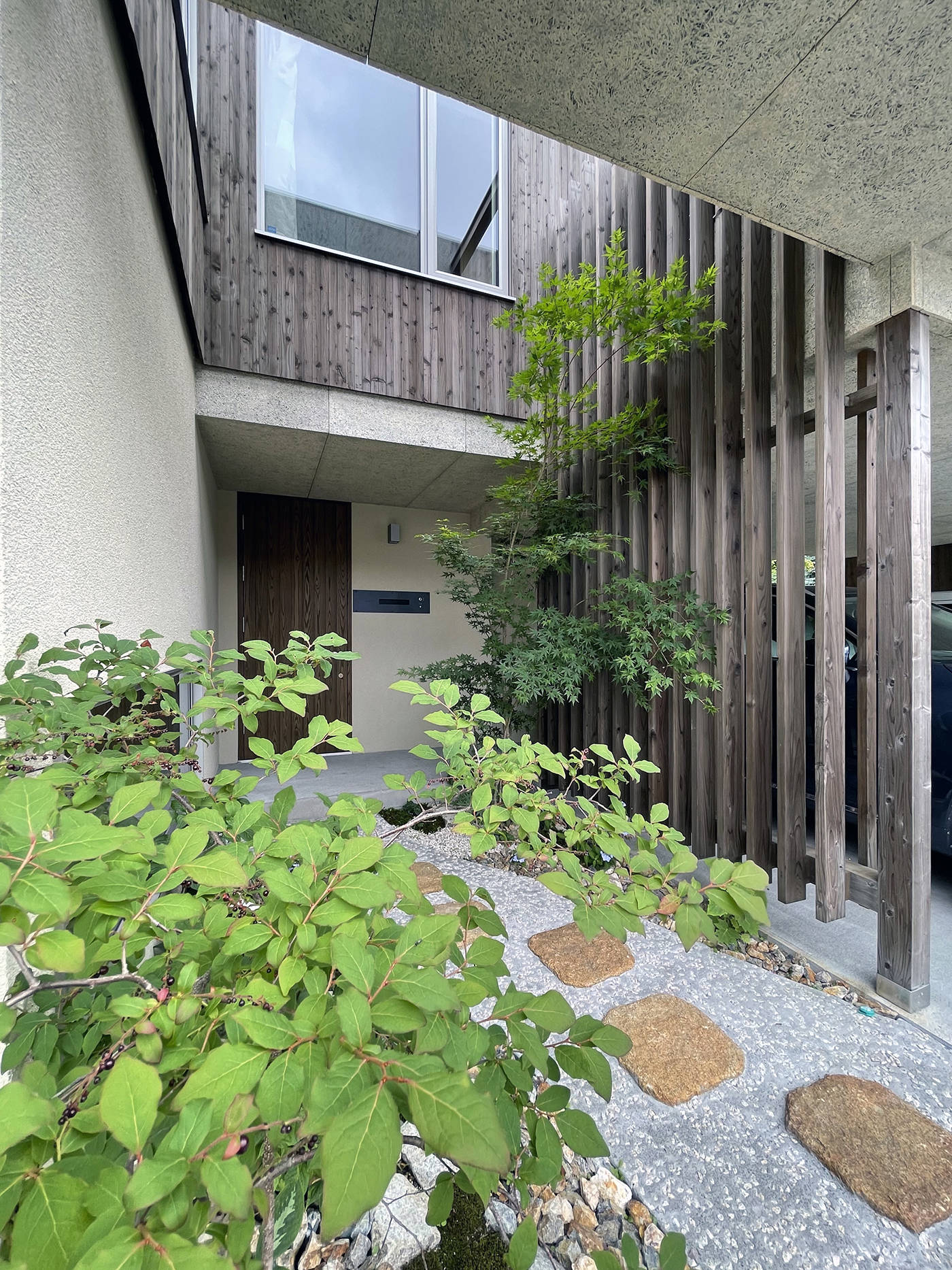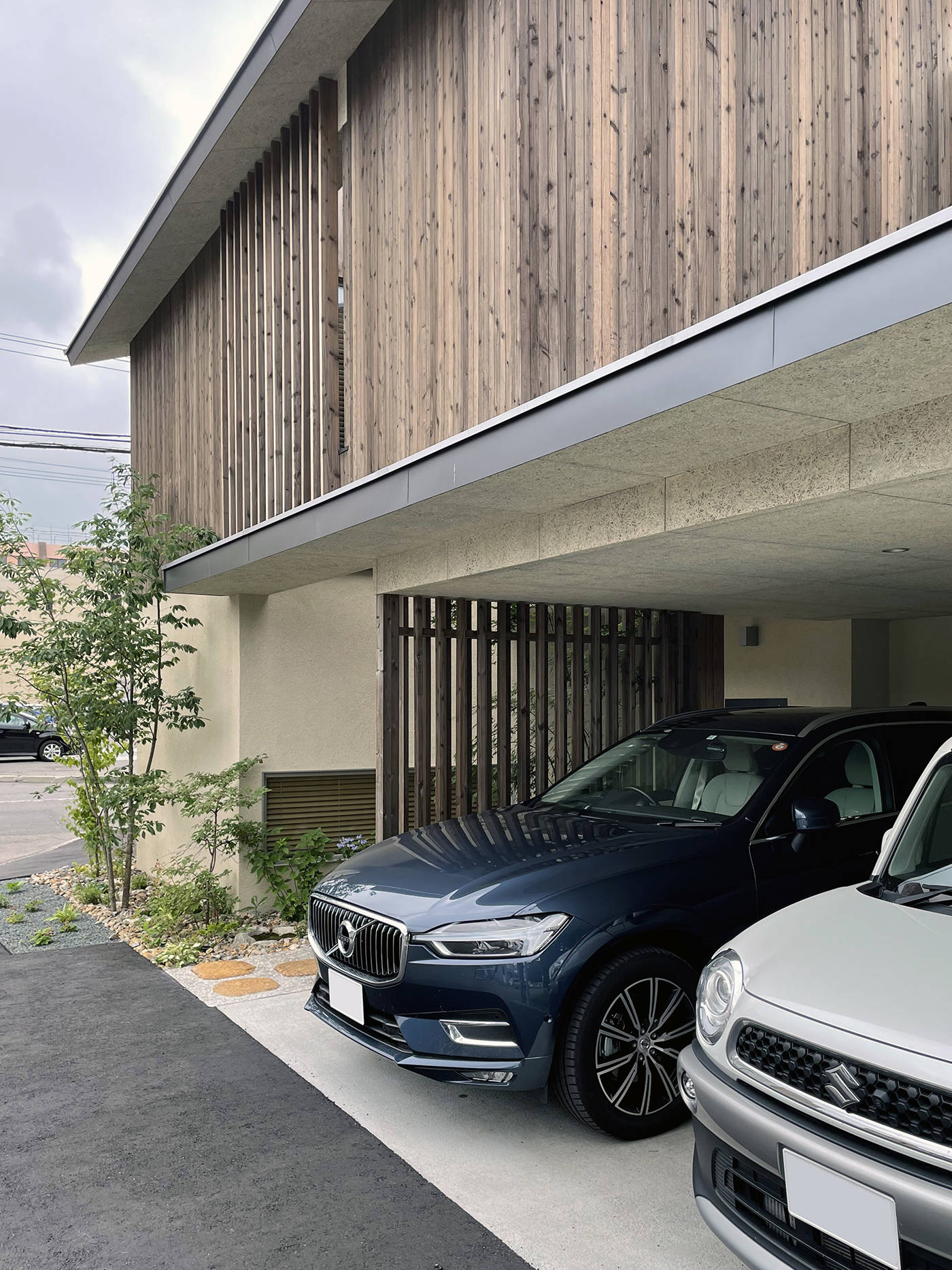 この住宅は、そんな「斜交道路」の傍らに位置し、緑のシークエンスにささやかに寄り添い、住居のアイコンとしての切妻屋根と、日射・プライバシーを調整する庇・ルーバー、経年変化を許容する木の外壁によって形づくられています。