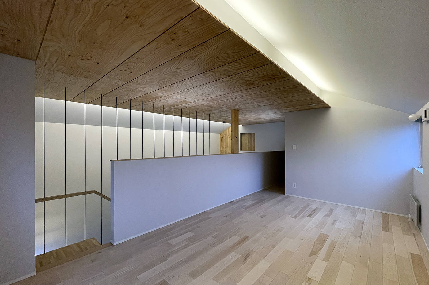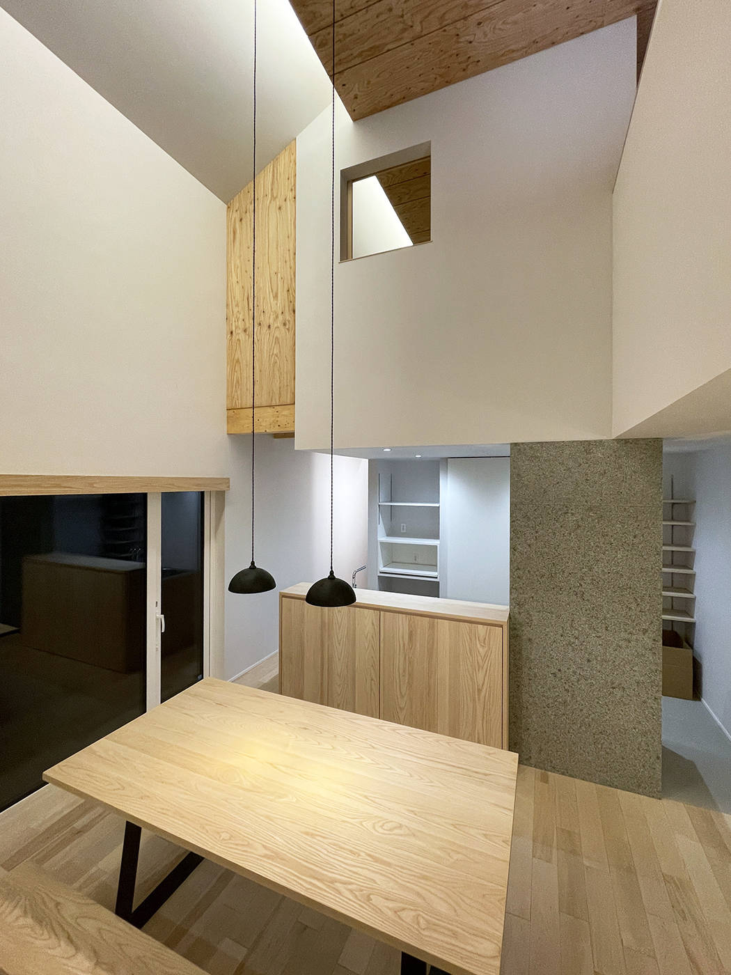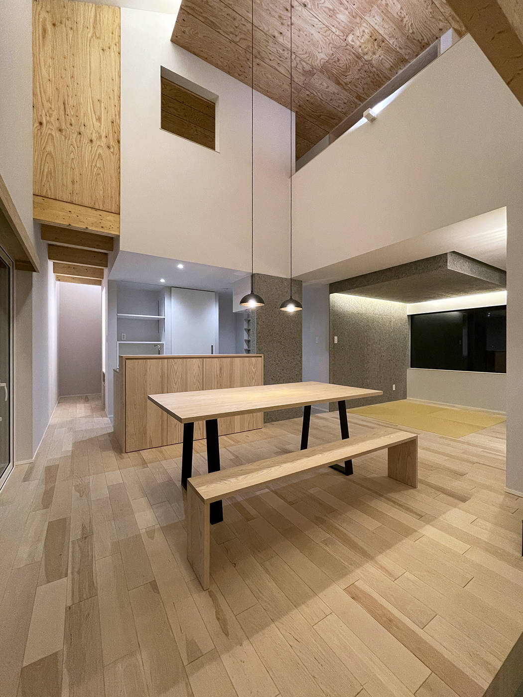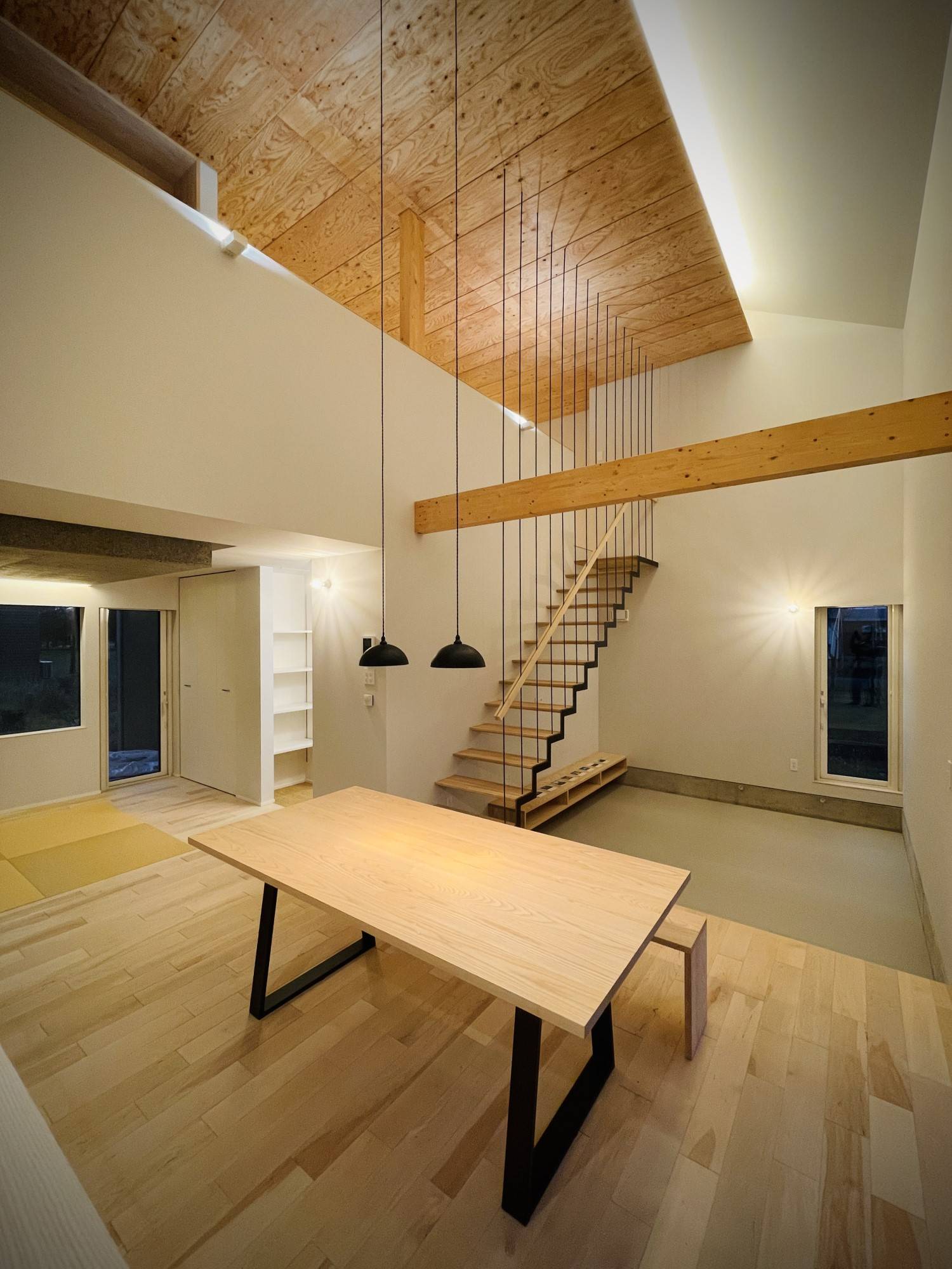 大きな吹抜空間と、プライベートサウナと坪庭に面したテラス・外部ロフトによって、生活が内外に拡がっていく住まいです。