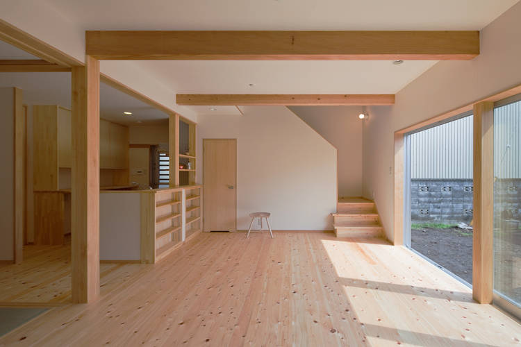前面道路が北側にある敷地に計画された若夫婦のコンパクトな住宅です。建主の要望は「木と左官の家、落ちついた安定感のある家、広くのびやかな家」というイメージでした。道路側のファサードを庇、下屋、上屋と段階的に積層させ、落ちつきのある外観を整えました。新築なのに、地域に昔から建っていたような安定感のある佇まいです。